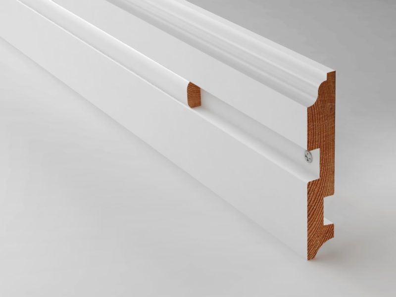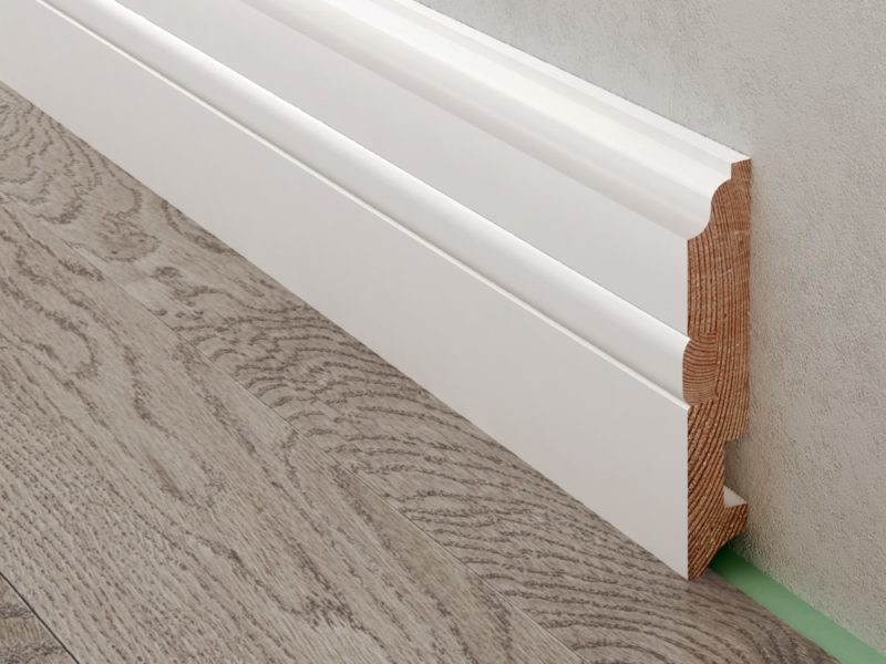 Данный вид плинтуса покрывается белой эмалью. Покрытие плинтуса идеально сочетается по отделке с паркетными полами Косвик.