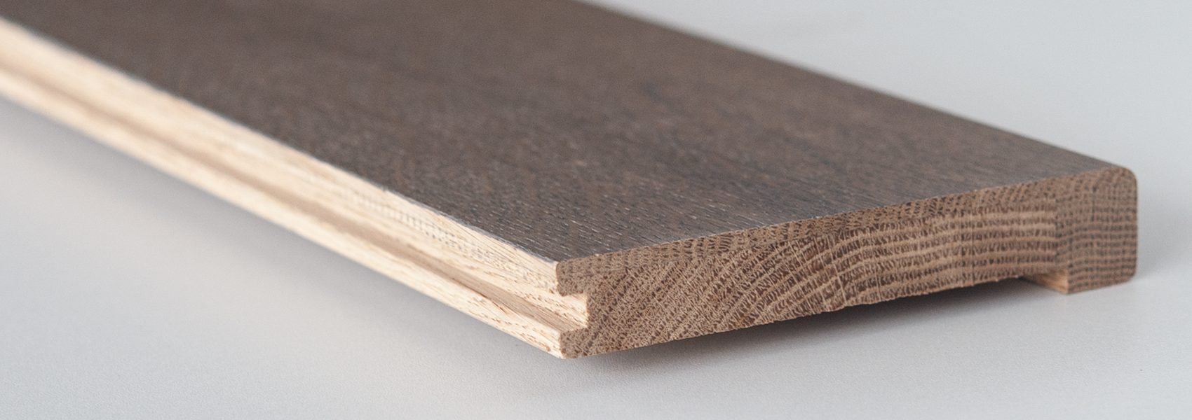 Изготавливается из инженерного массива дуба или американского ореха. Ступеньки поставляется в длинах 1400мм. Покрытие лицевой части ступеньки идеально сочетается по отделке и фактуре с паркетными полами Косвик. Данный вид молдинга производится во всех цветах коллекций Косвик, благодаря чему можно создать цветовое соответствие между лестницей и полом.
