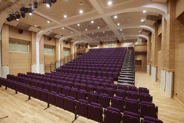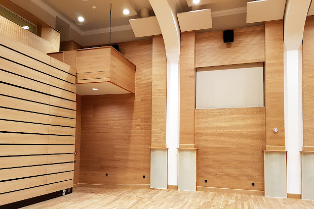 В первую очередь требовалось достичь высоких акустических характеристик помещения. Учитывая широкий спектр назначений зала — а это проведение студенческих концертов, театральных постановок, праздников, церемоний и выступлений почетных гостей, для реализации задачи был задействован целый комплекс акустических решений – инсталляция акустических перфорированных панелей с соответствующими резонирующими камерами, коррекция конфигурации помещения, создание диффузоров и зон аудиоабсорбции.