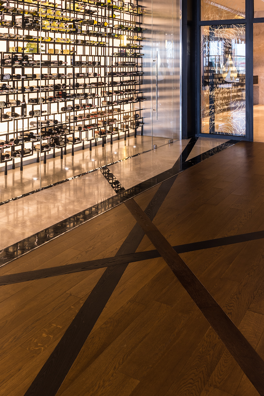 Сложный рисунок напольного покрытия с контрастными вставками привносит определенную динамику в это спокойное, элегантное пространство.