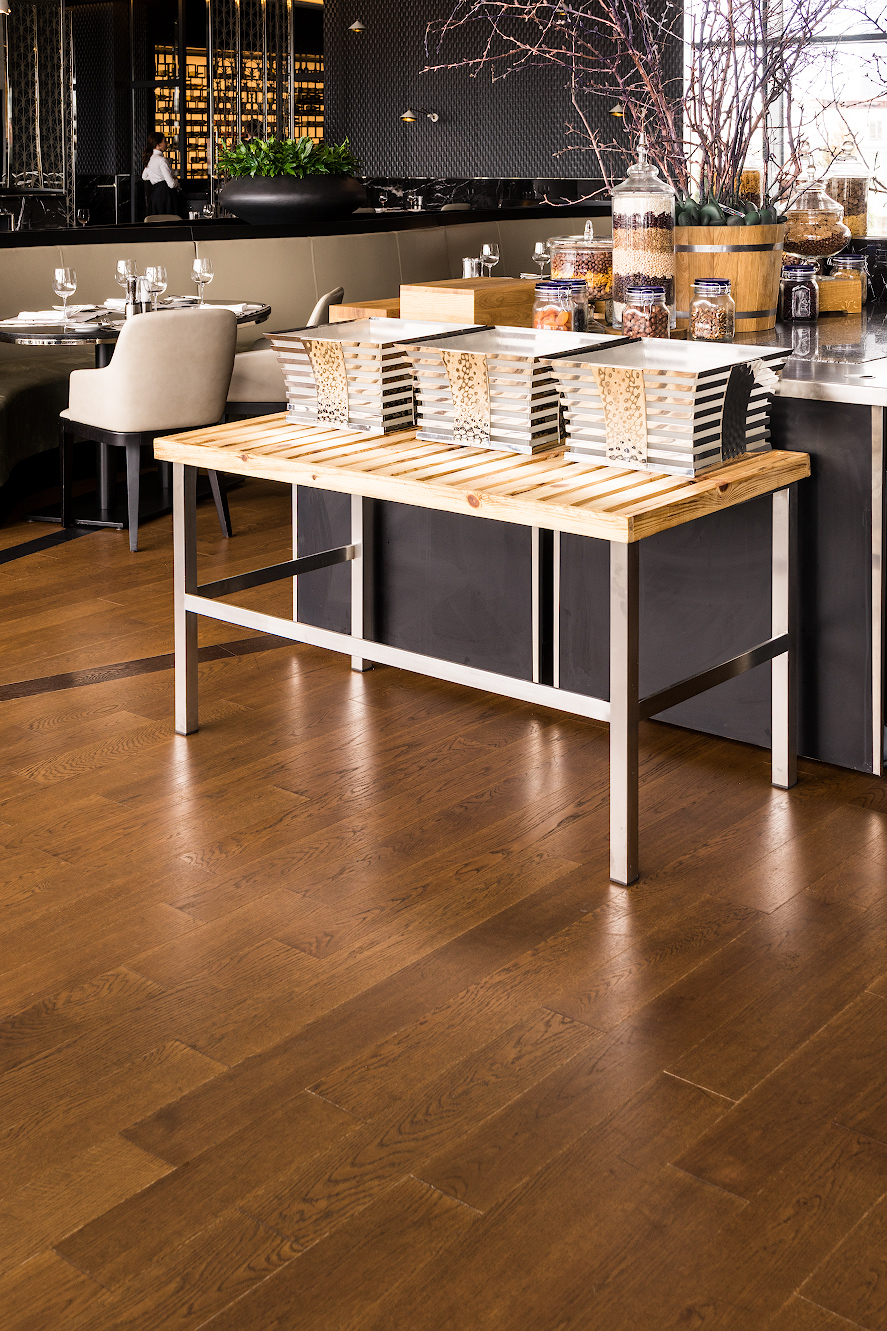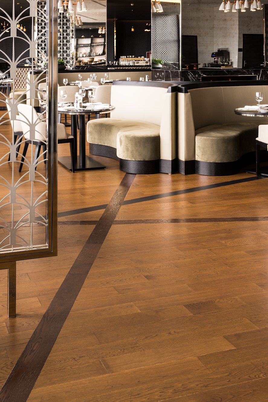 В проекте использована паркетная доска Coswick дуб Орех и дуб Темный шоколад.