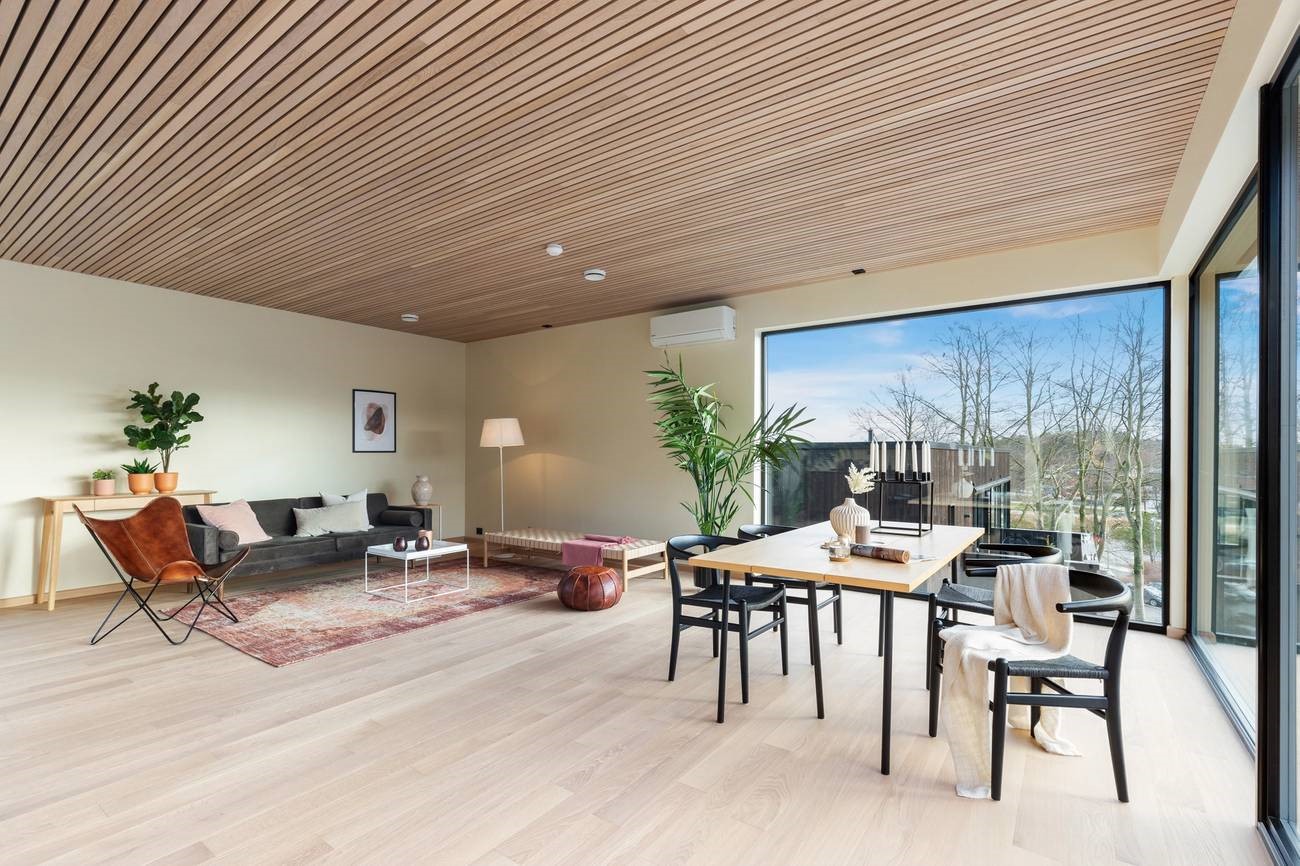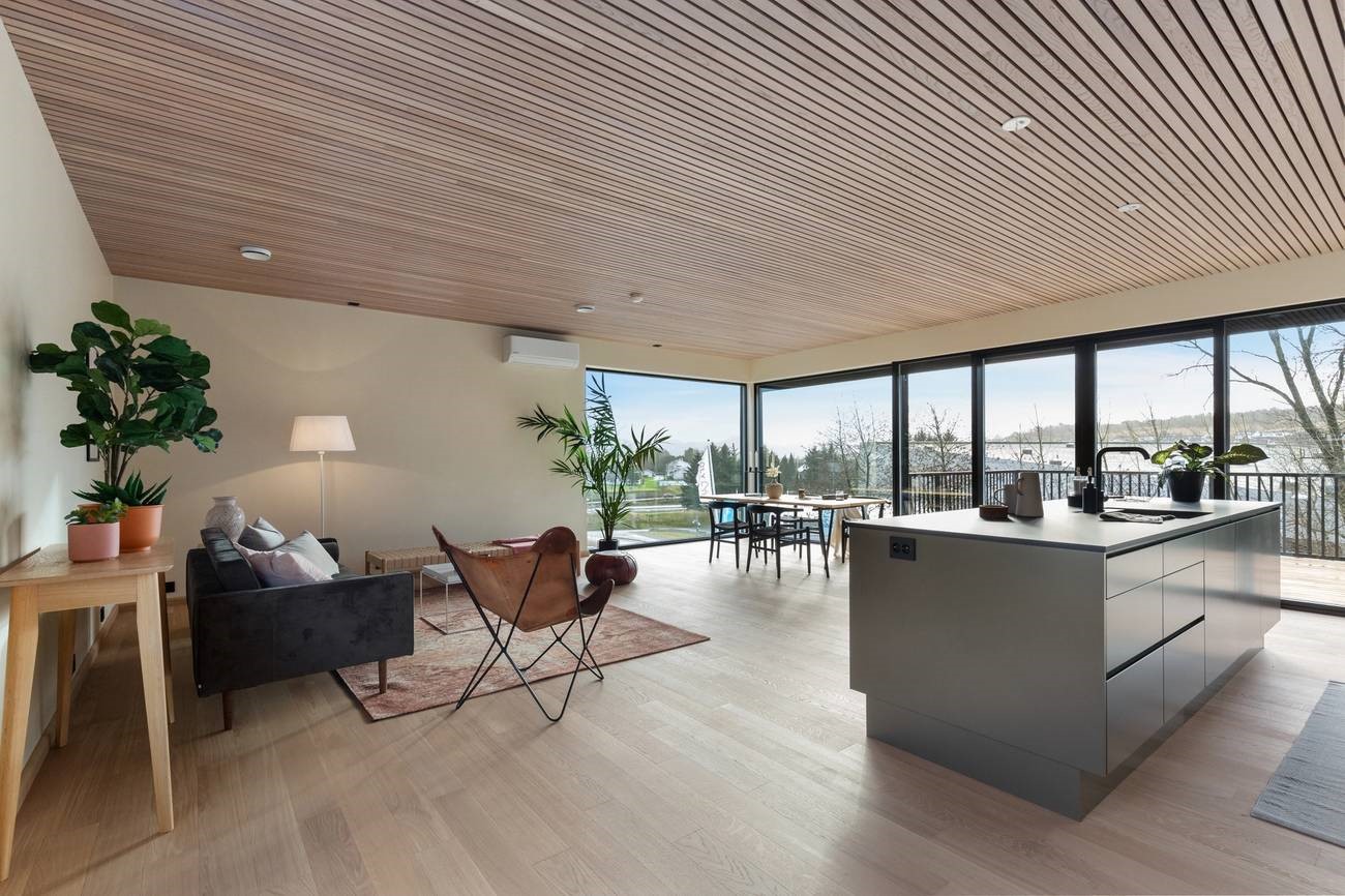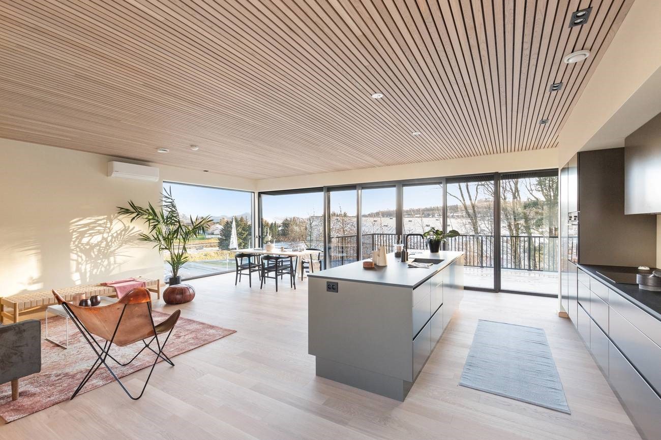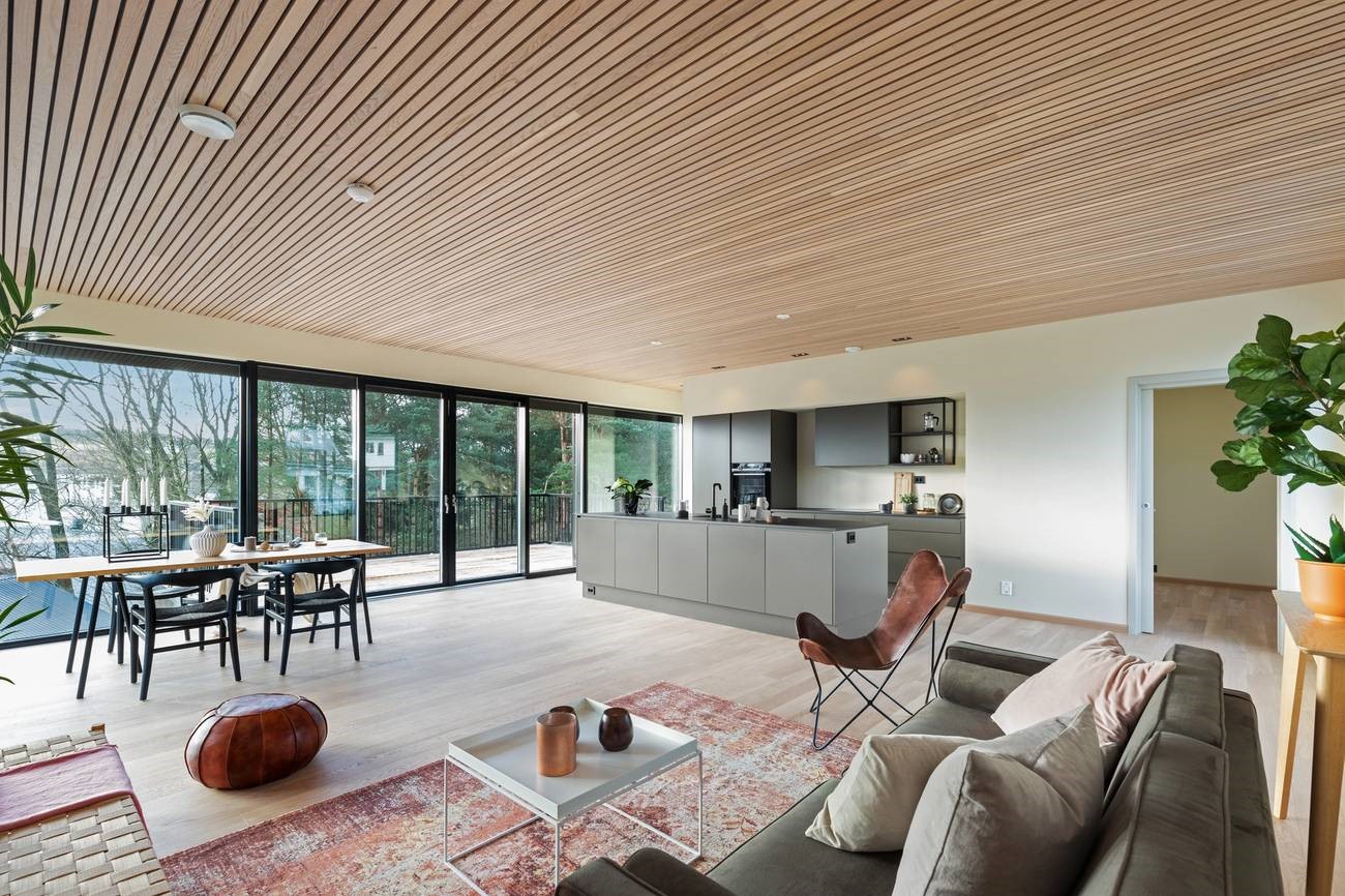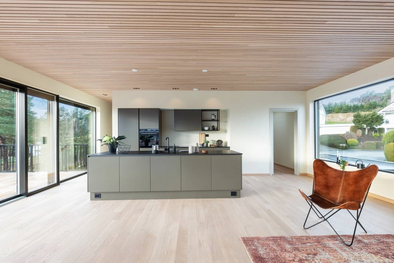 Настроение интерьера этого дома в норвежском Ставангере – спокойствие, простор и свобода. В его основе – умелое сочетание нейтральных светлых оттенков и натурального дерева, четкие линии, лаконичная и функциональная мебель и точно расставленные декоративные акценты. Ничего лишнего, ничто не отвлекает от спокойного созерцания великолепного пейзажа за огромными панорамными окнами, которые словно растворяются на пути воздуха и света. Теплый оттенок натурального дубового паркета создает ощущение золотистого песка на берегу моря. Чистый и прозрачный интерьер, в котором легко и комфортно.