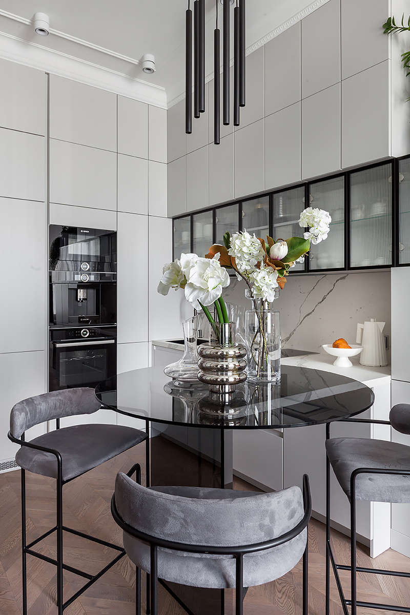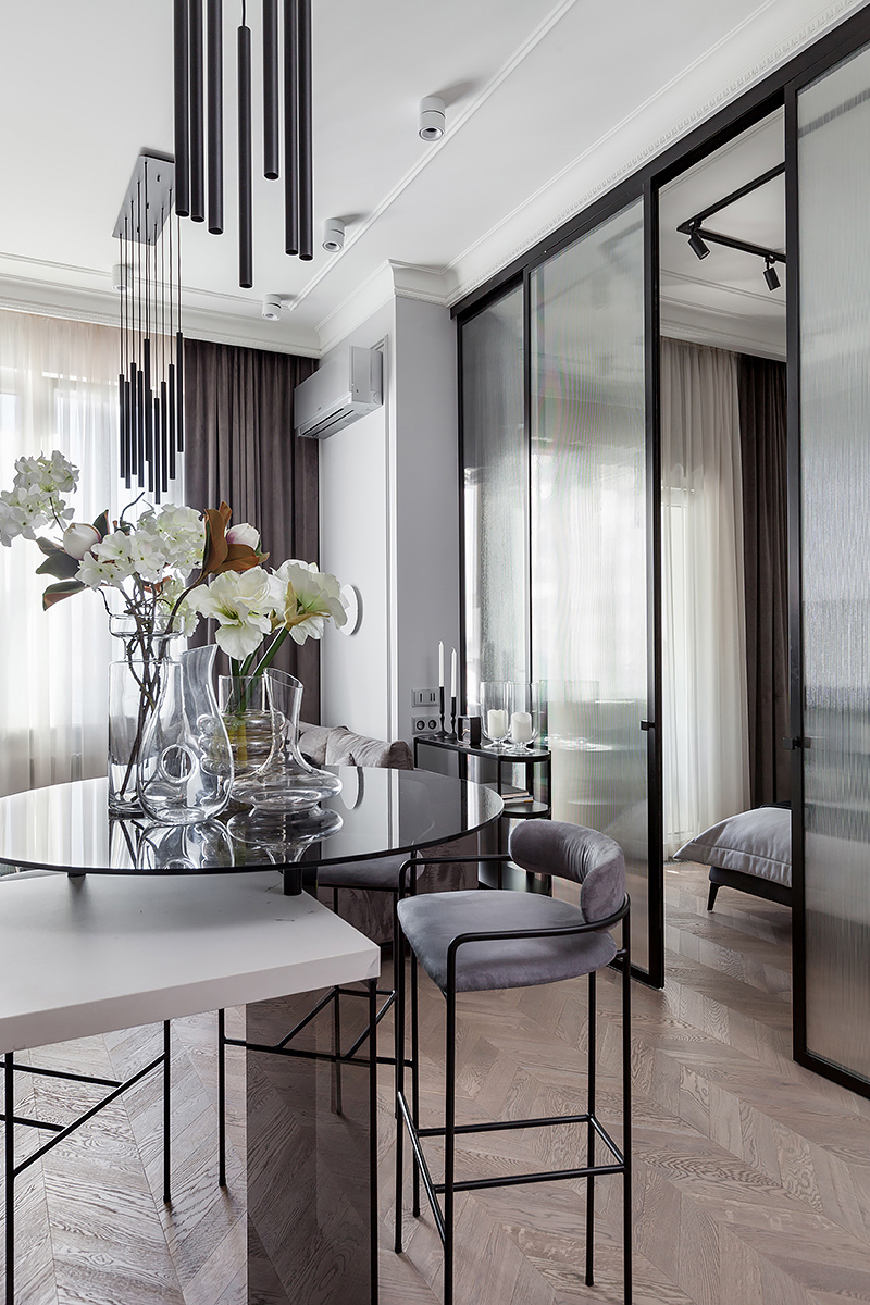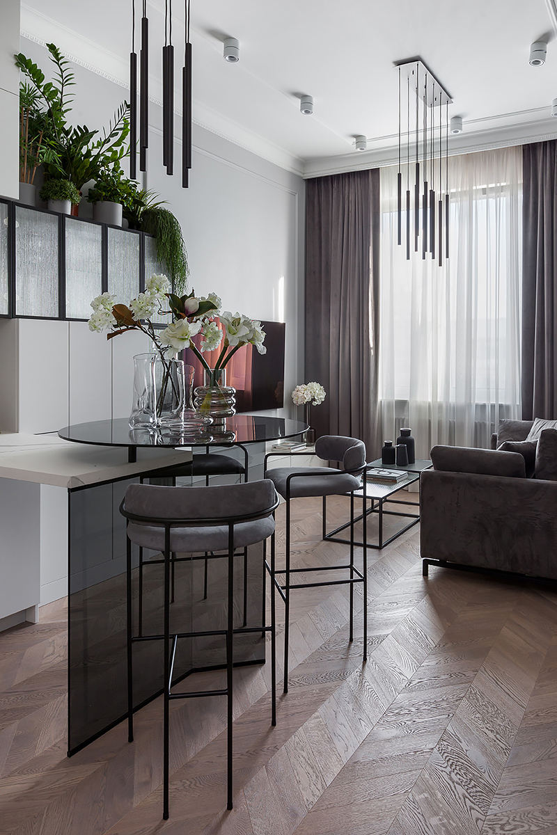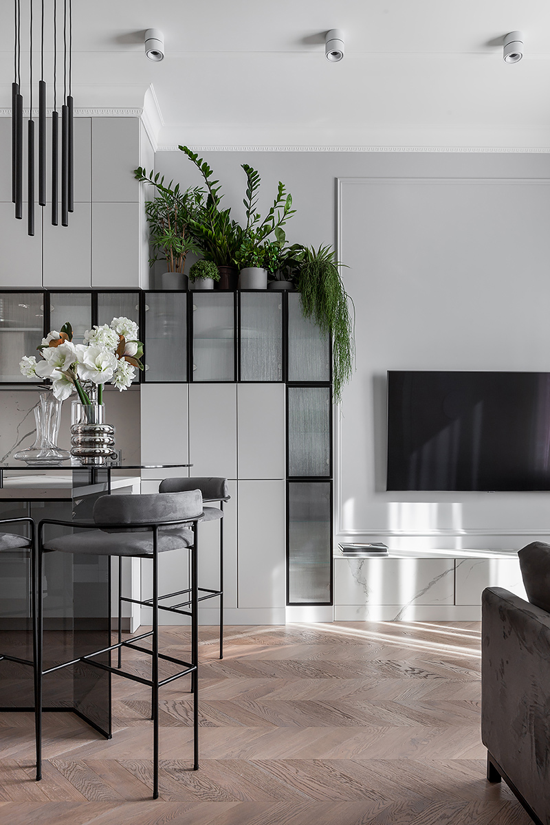 Французская елочка на полу, лепнина на стенах, лаконичная мебель – интерьер сочетает изящество и элегантность с эргономикой и технологиями. Пространство выглядит сдержанно, строго, без лишних деталей, как наряд Total black. Только вместо черного использован серый цвет. Монохромные серые тона в сочетании с белым и черным уравновешены природным оттенком дерева на полу и зеленью комнатных растений. Большое количество стекла и зеркал наполняет светом и визуально расширяет пространство, делая его воздушным и более объемным.