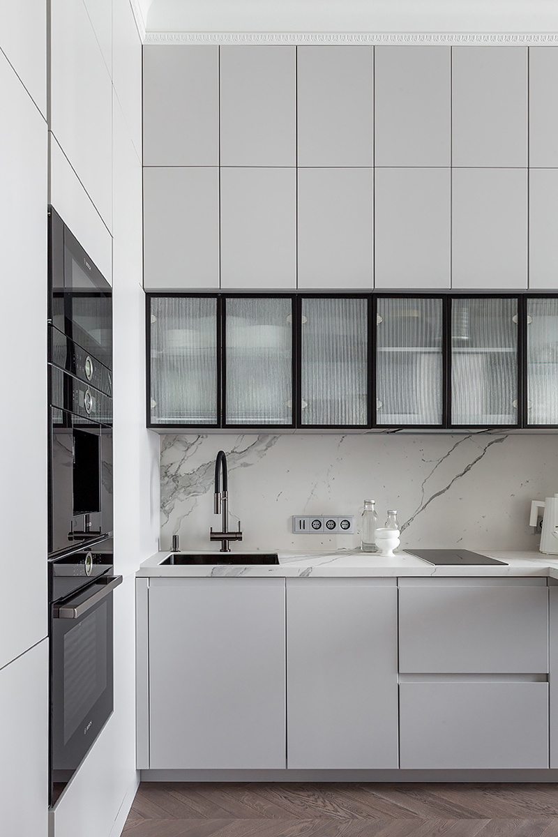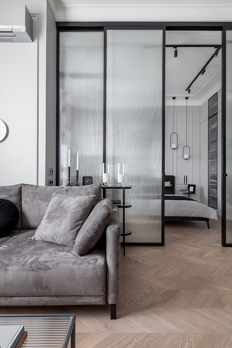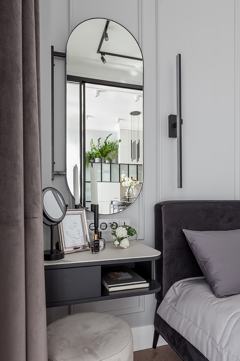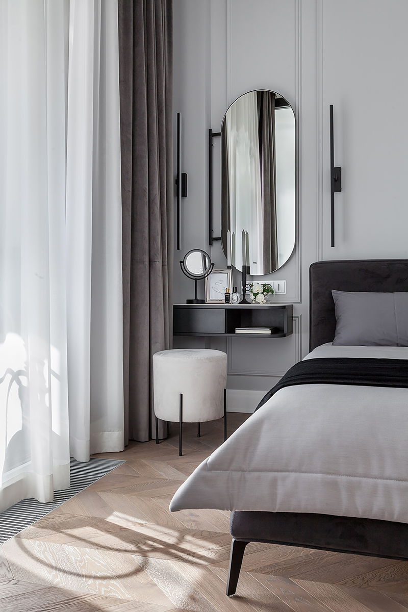 Французская елочка на полу, лепнина на стенах, лаконичная мебель – интерьер сочетает изящество и элегантность с эргономикой и технологиями. Пространство выглядит сдержанно, строго, без лишних деталей, как наряд Total black. Только вместо черного использован серый цвет. Монохромные серые тона в сочетании с белым и черным уравновешены природным оттенком дерева на полу и зеленью комнатных растений. Большое количество стекла и зеркал наполняет светом и визуально расширяет пространство, делая его воздушным и более объемным.