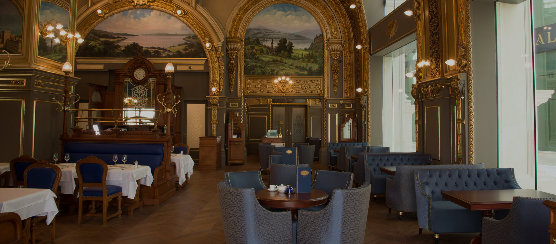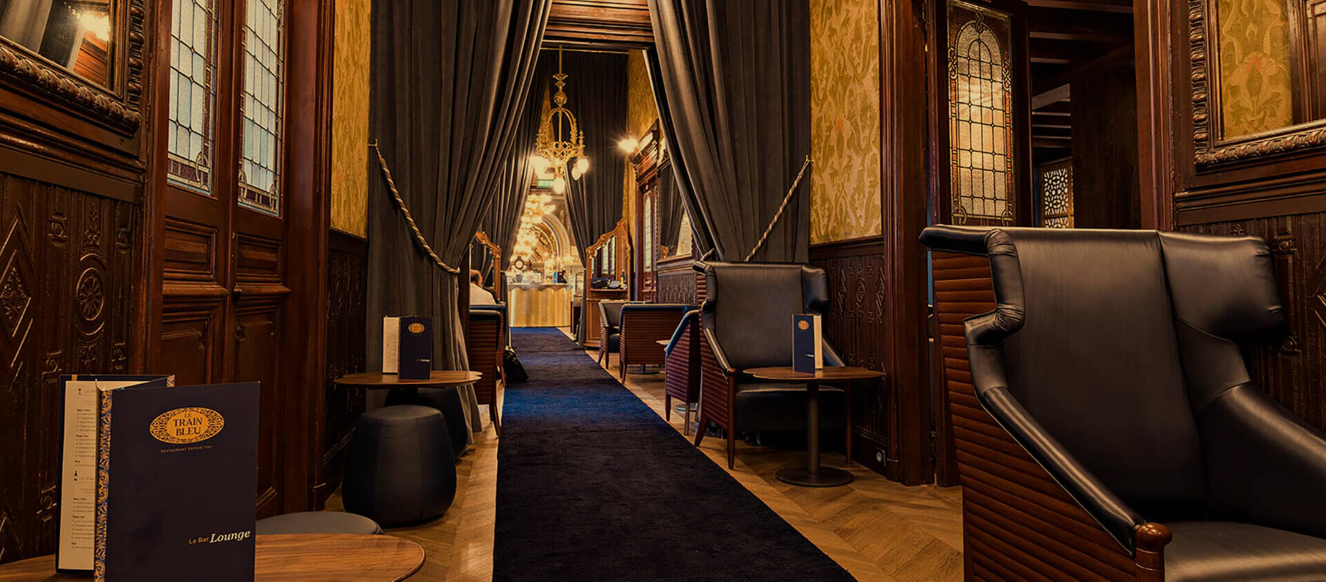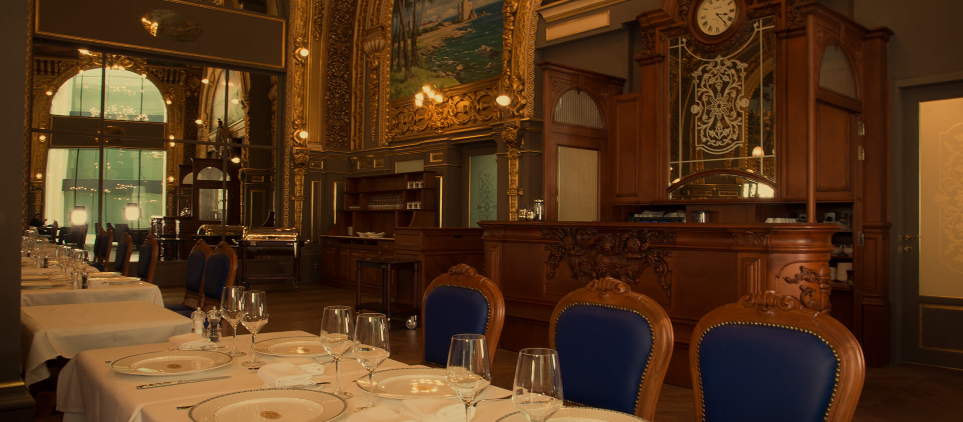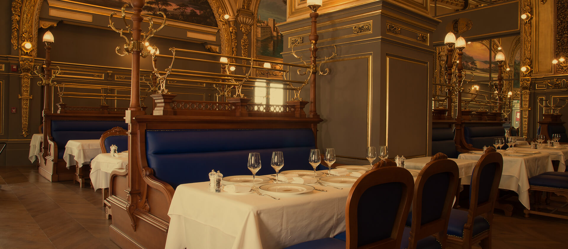 Роскошный французский ресторан Le Train Bleu в столице Катара городе Дохе. В его дизайне точно воспроизведена стилистика и атмосфера легендарного Le Train Bleu в Париже, интерьеры которого внесены в список исторического наследия Франции, – от великолепных фресок и резьбы, отделанной золотом, до паркета в классической раскладке «французская елка».