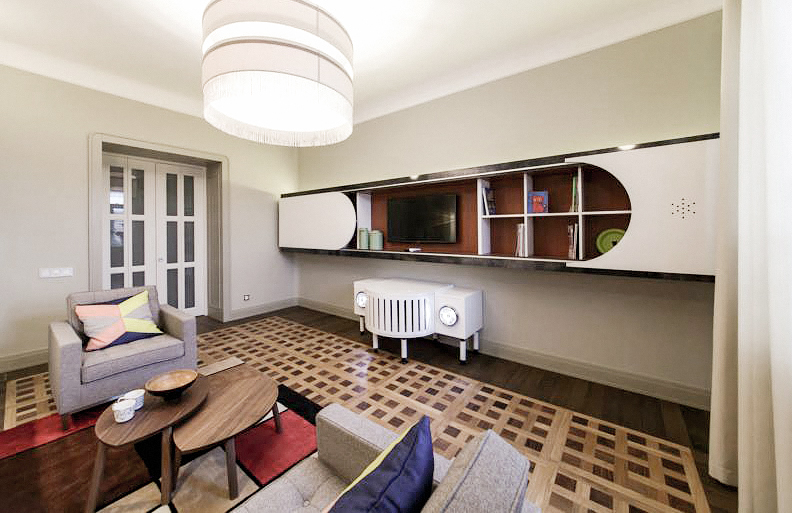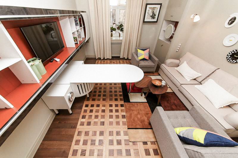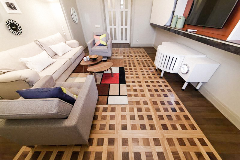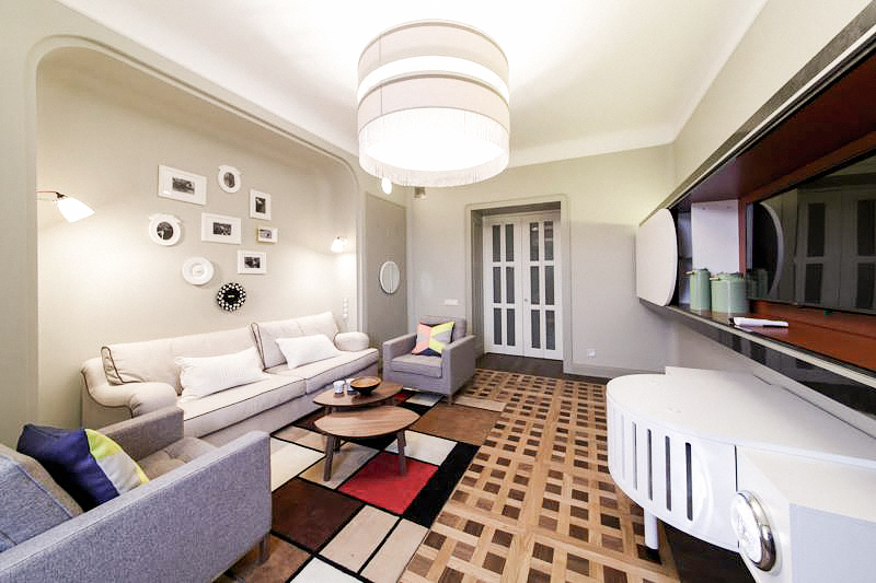 Роскошный модульный паркет из ценных пород дерева прекрасно вписался в «советский» интерьер, объединяя его элементы в единый ансамбль. Секрет в классических шашечках узора, которые органично смотрятся и в дворцовых залах, и в авангардных интерьерах постконструктивизма.