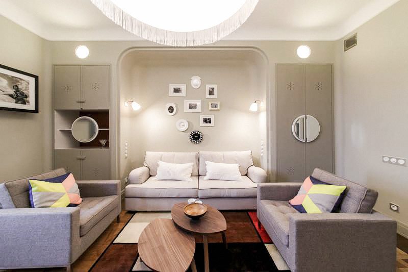 Квартира, в которой переделывали гостиную для героев «Квартирного вопроса», находится в доме, построенном в 1937 году, и хотелось, чтобы интерьер соответствовал его истории. Поэтому комната наполнена приметами того времени, характерными архитектурными приемами.