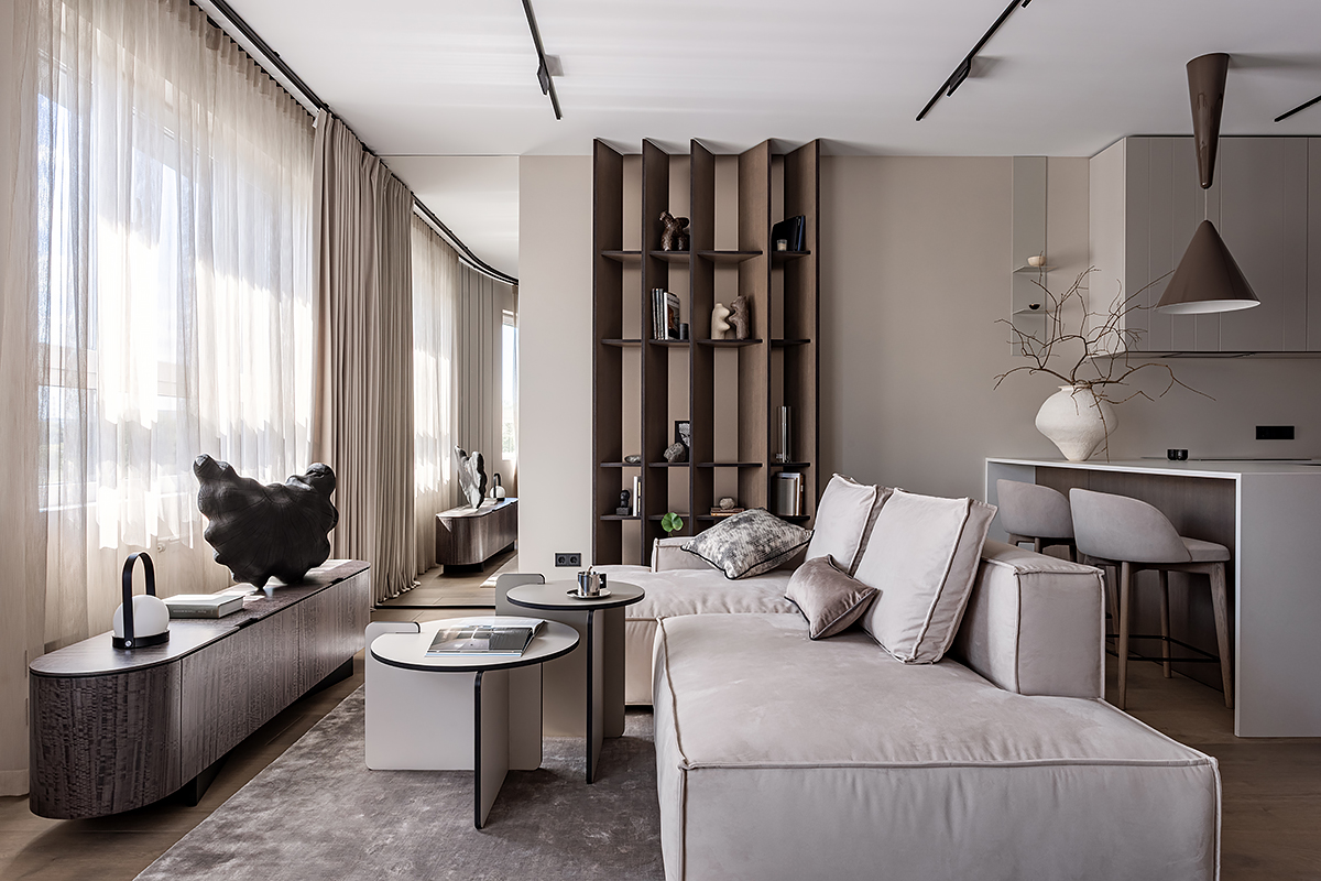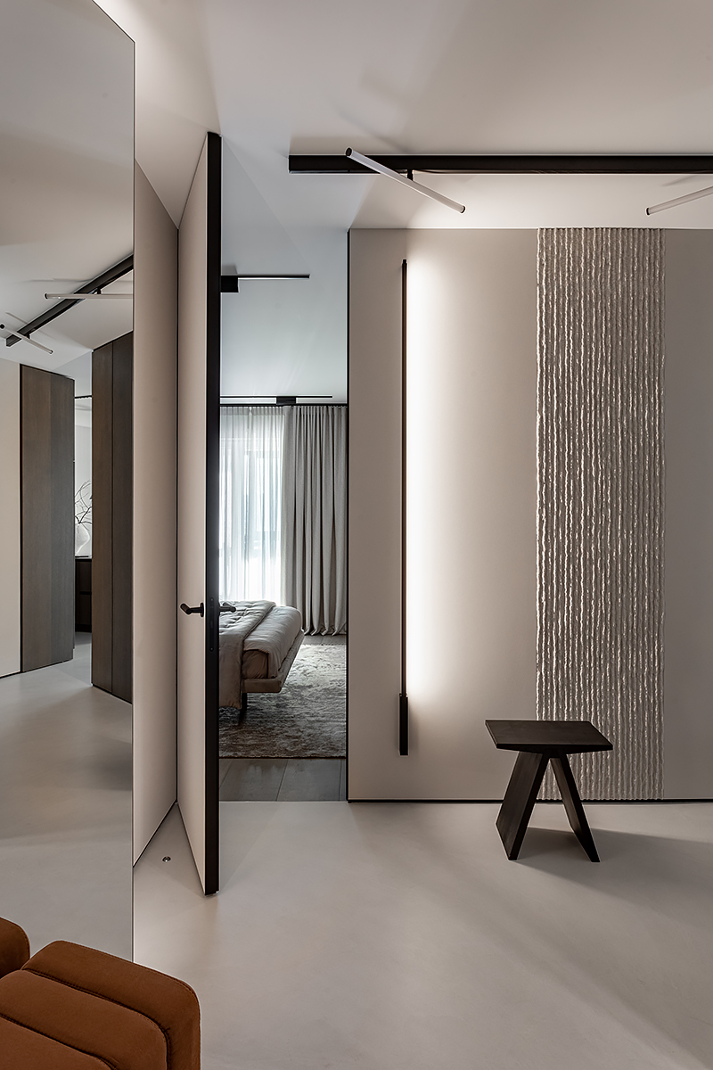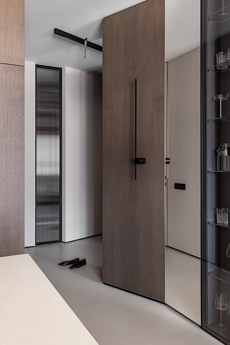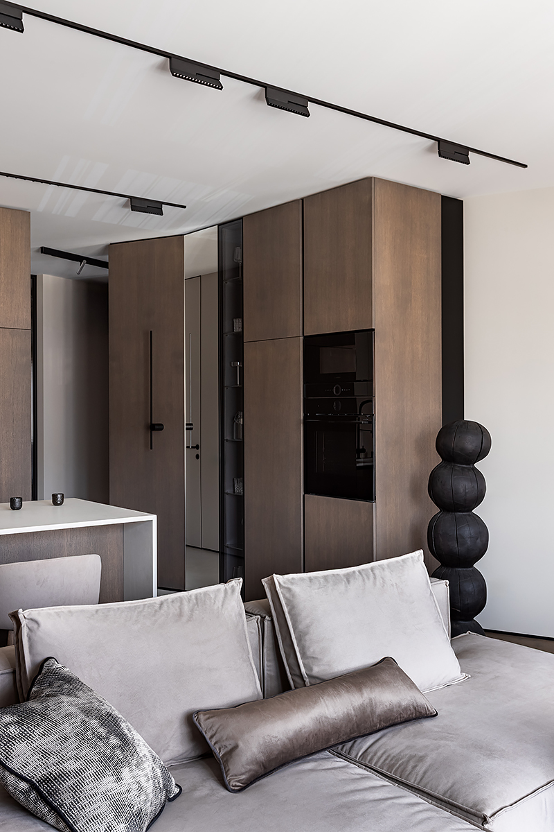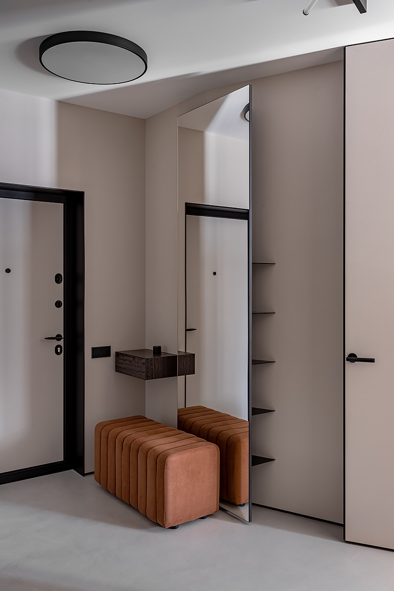 Как создать пространство, выдержанное в духе минимализма, как конструктивно, так и визуально? Авторы проекта решили уйти от активных цветовых акцентов и построить интерьер на сложной, глубокой палитре greige — оттенков между серым и бежевым, в меру тёплых, но сохраняющих дымчатую глубину. В роли единственных ярких акцентов выступили природные материалы: рыжая кожа, шпон редких пород, металл.