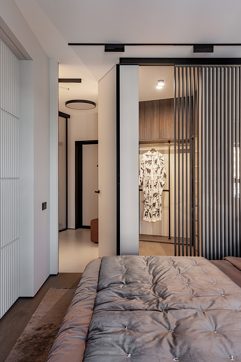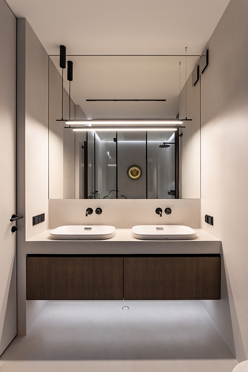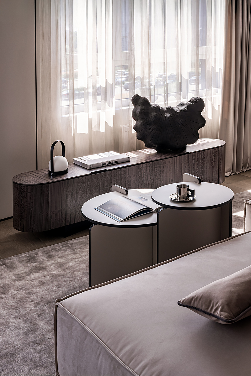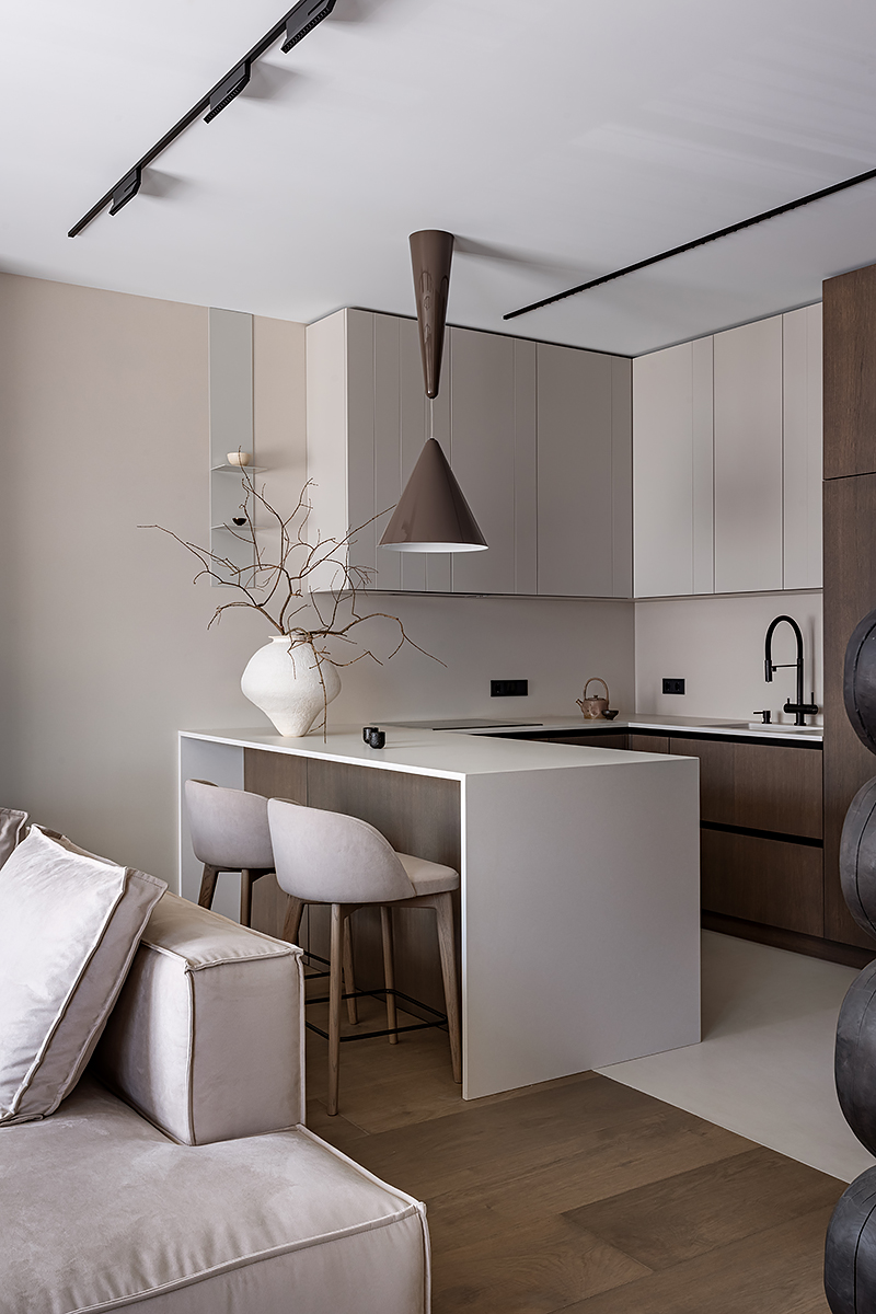 Как создать пространство, выдержанное в духе минимализма, как конструктивно, так и визуально? Авторы проекта решили уйти от активных цветовых акцентов и построить интерьер на сложной, глубокой палитре greige — оттенков между серым и бежевым, в меру тёплых, но сохраняющих дымчатую глубину. В роли единственных ярких акцентов выступили природные материалы: рыжая кожа, шпон редких пород, металл.