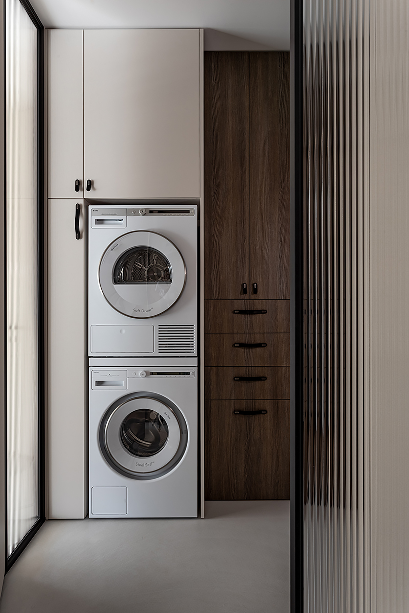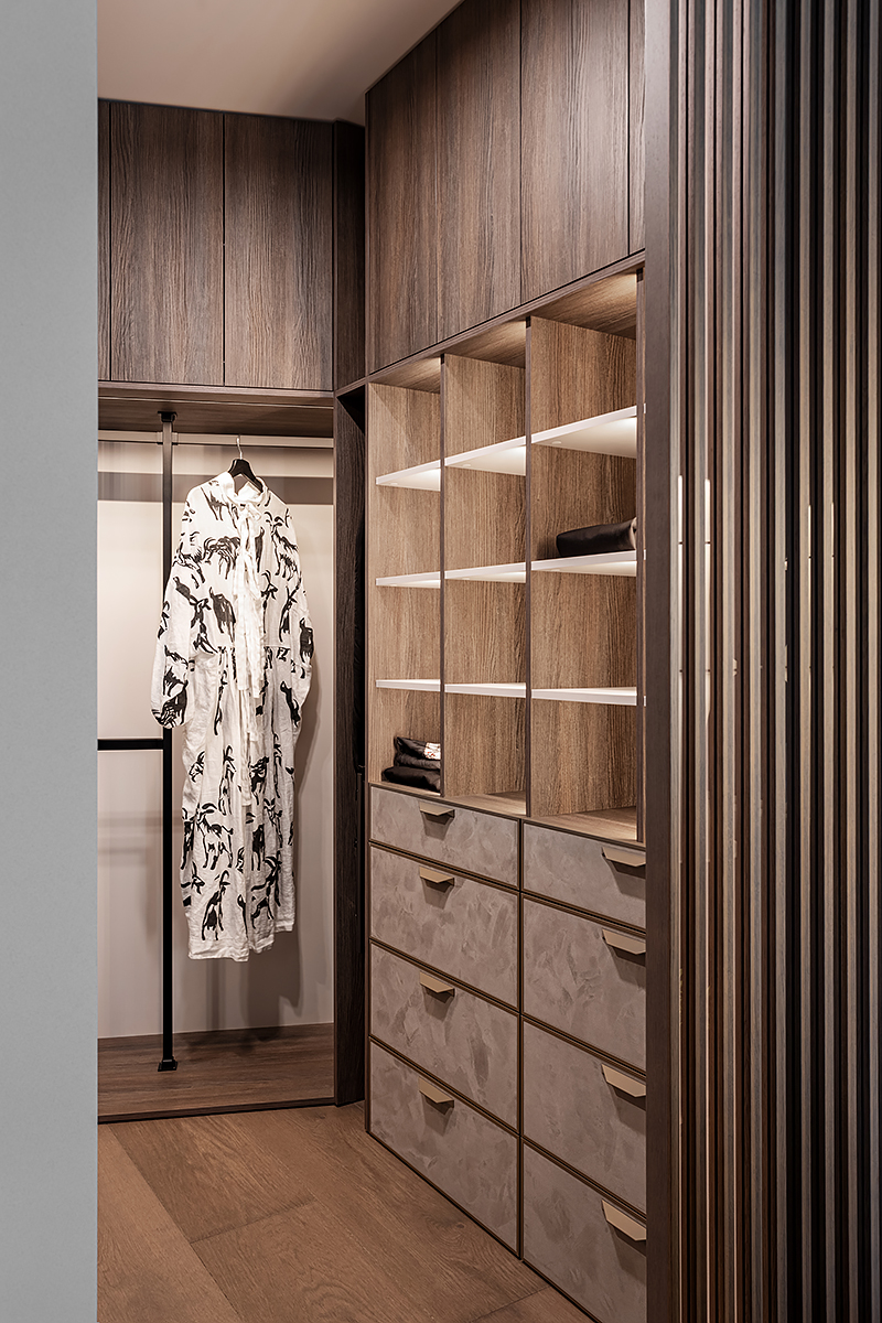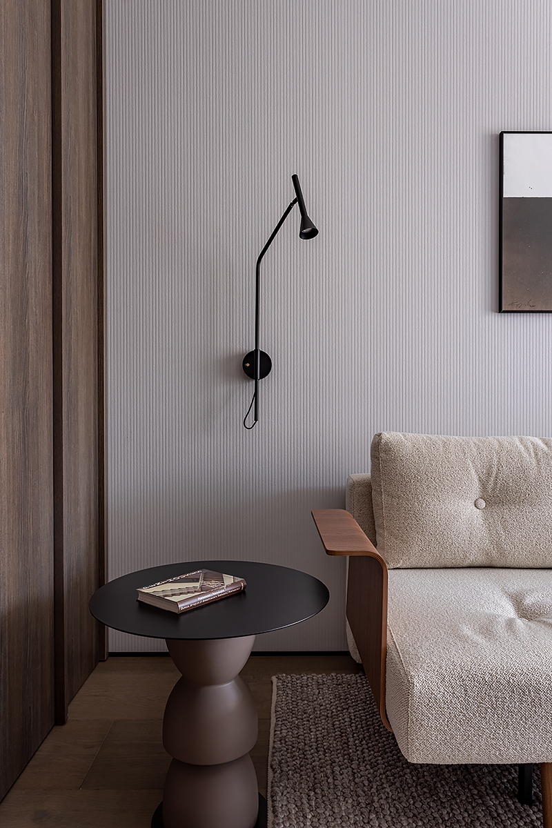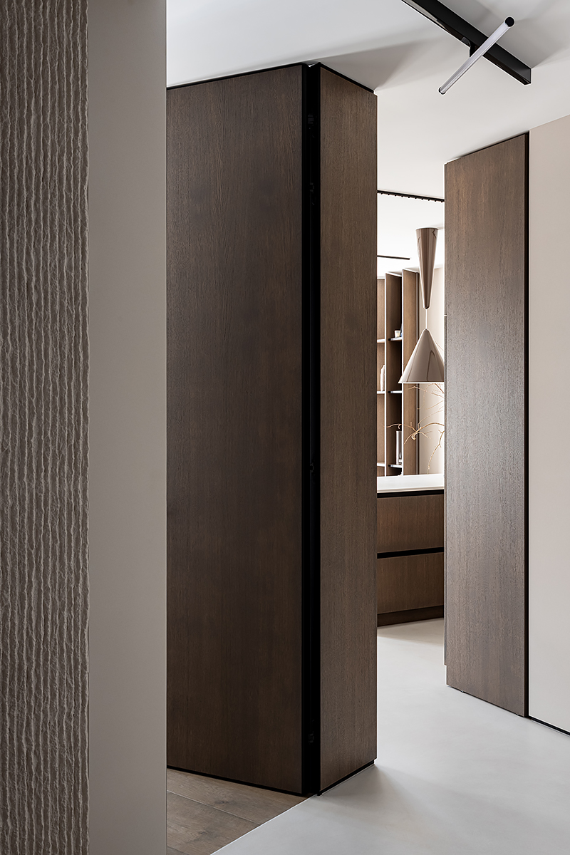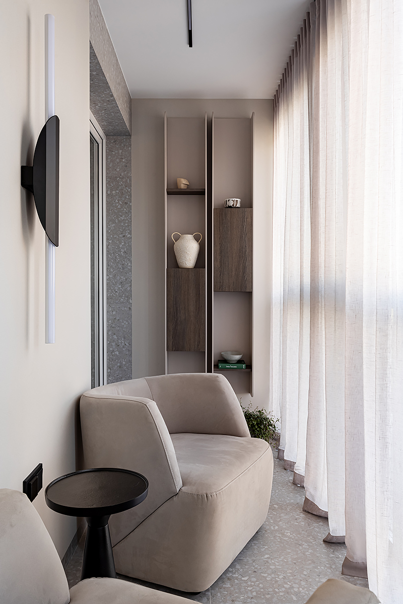 Как создать пространство, выдержанное в духе минимализма, как конструктивно, так и визуально? Авторы проекта решили уйти от активных цветовых акцентов и построить интерьер на сложной, глубокой палитре greige — оттенков между серым и бежевым, в меру тёплых, но сохраняющих дымчатую глубину. В роли единственных ярких акцентов выступили природные материалы: рыжая кожа, шпон редких пород, металл.