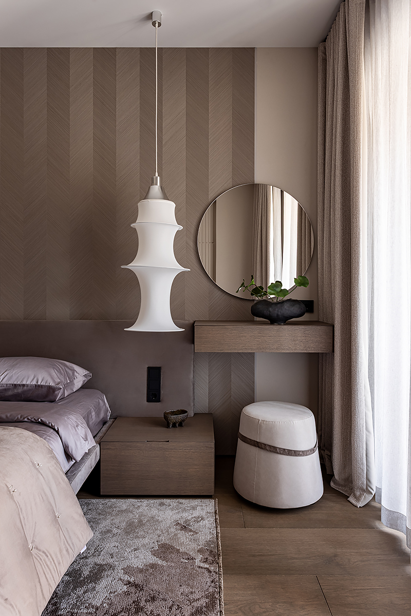 Идея мягко «обнимающего» пространства стала основой для интеграции восточной философии и искусства. Интерьер оживляют работы белорусских художников и ремесленников: графика тушью, акварели, керамика ручной работы. Эти детали формируют атмосферу баланса света и тени, дня и ночи, лёгкости и глубины.