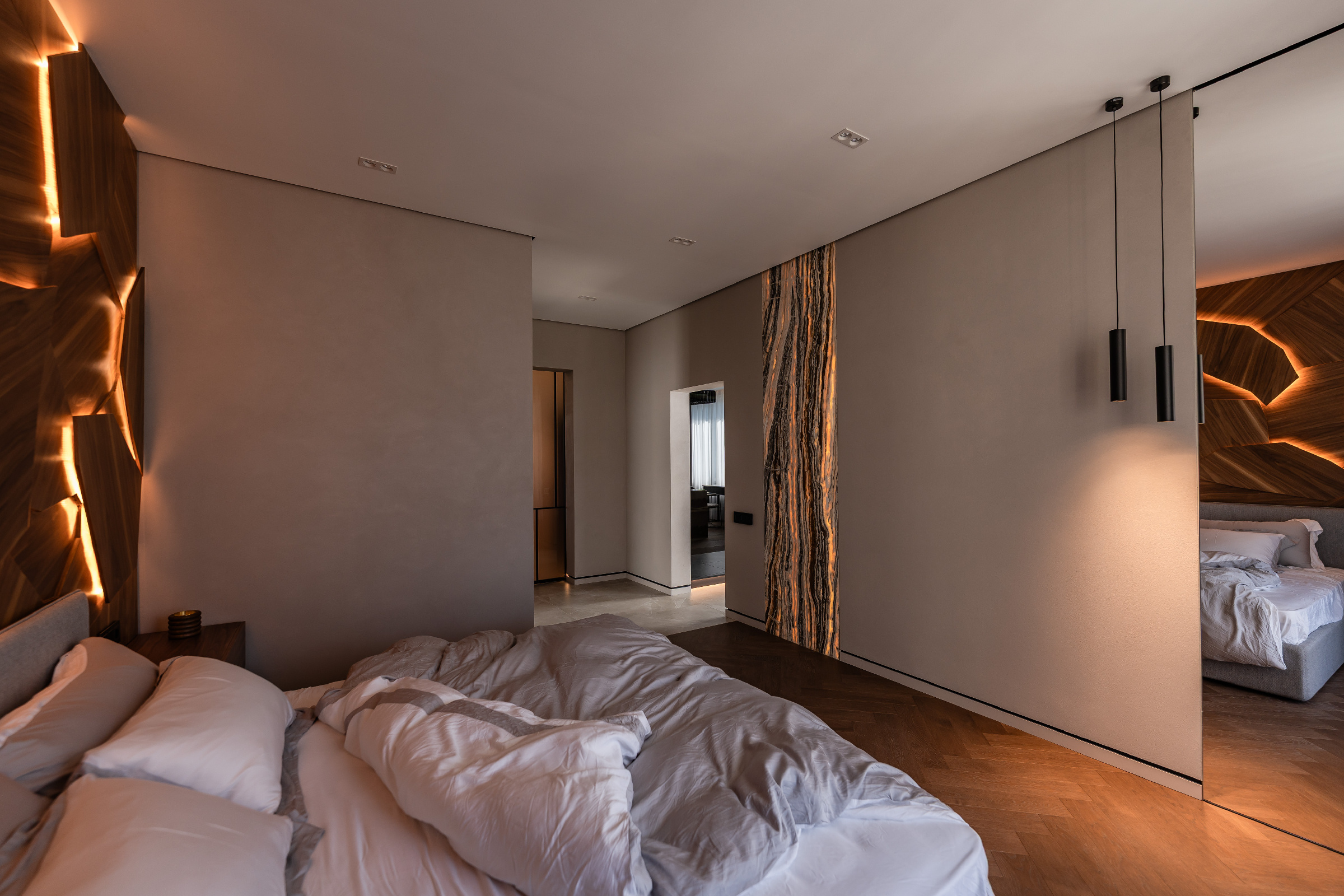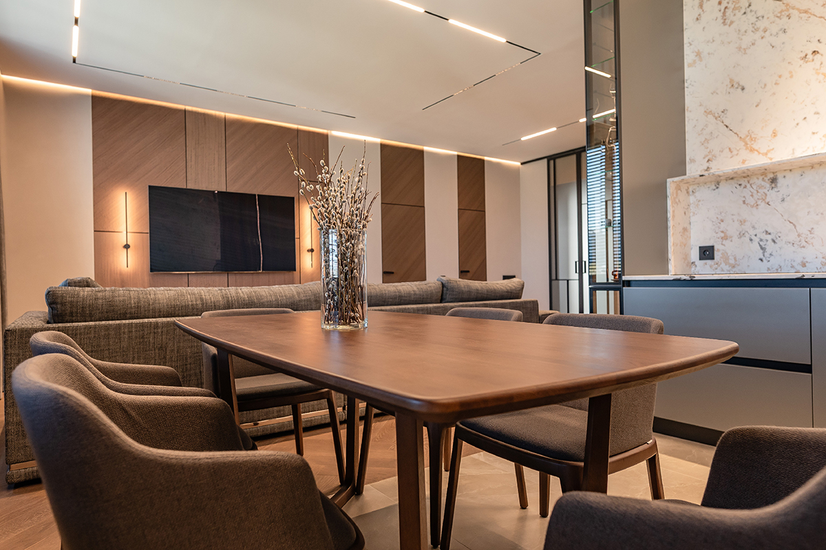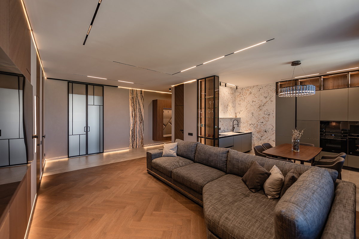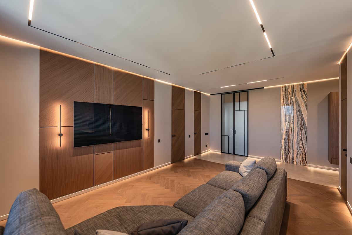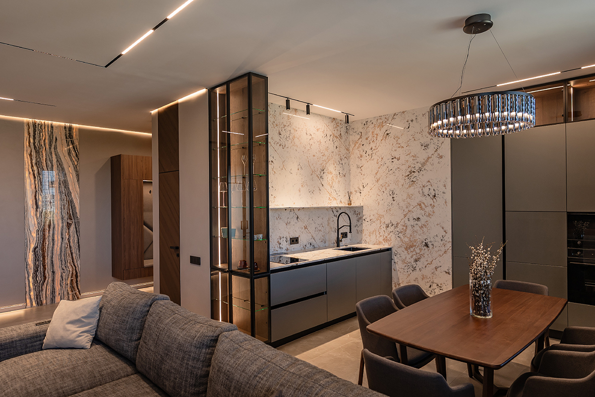 Сдержанные серые стены, мебель с элементами дуба и ореха, подсвеченный оникс и кварцит создают богатую палитру фактур и оттенков. А продуманное освещение — от трековых систем до мягкой подсветки плинтусов — делает пространство по-настоящему живым и уютным.