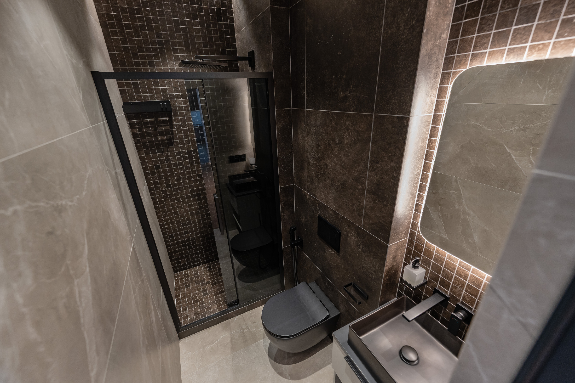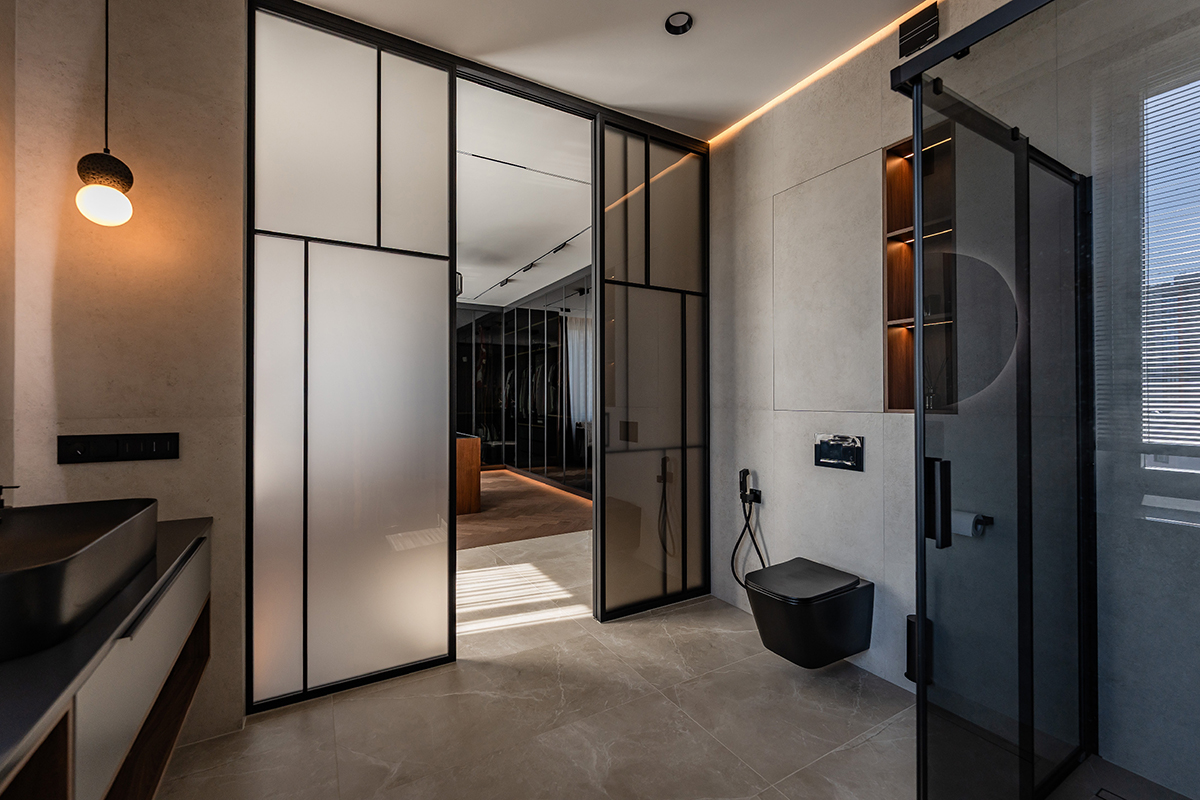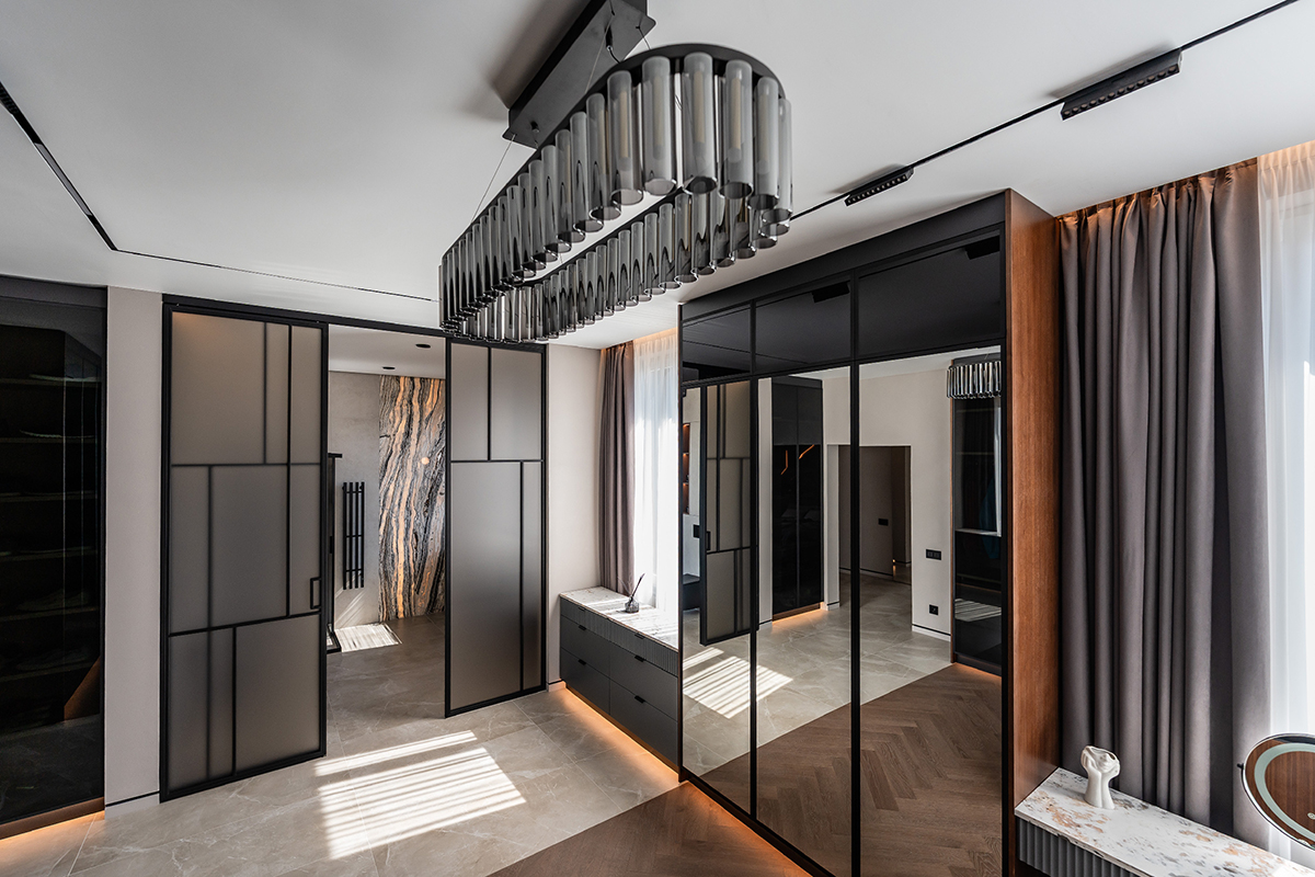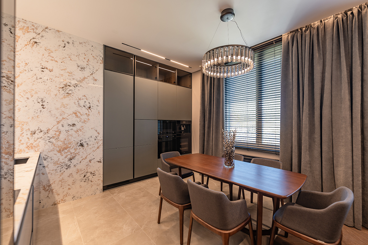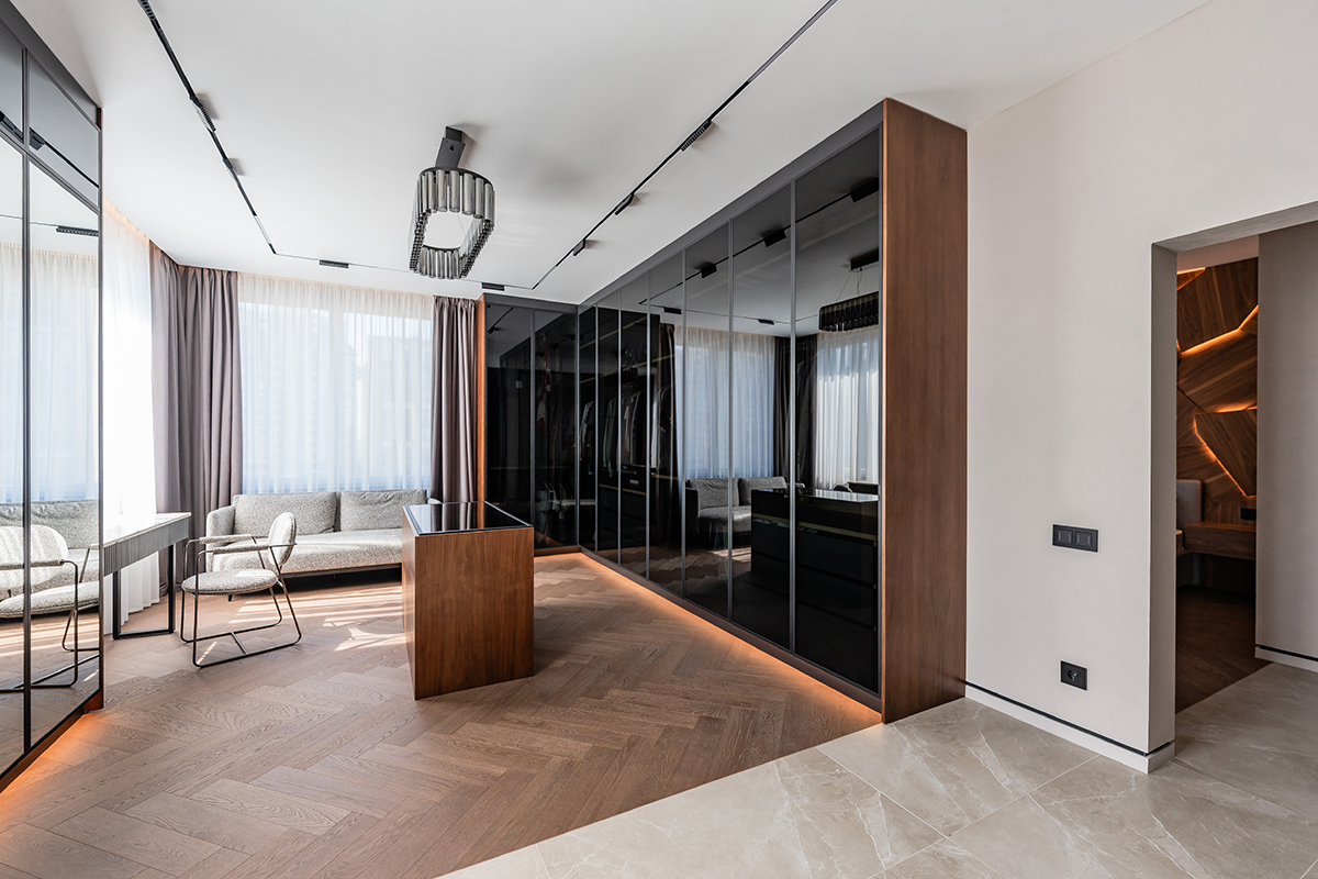 Сдержанные серые стены, мебель с элементами дуба и ореха, подсвеченный оникс и кварцит создают богатую палитру фактур и оттенков. А продуманное освещение — от трековых систем до мягкой подсветки плинтусов — делает пространство по-настоящему живым и уютным.