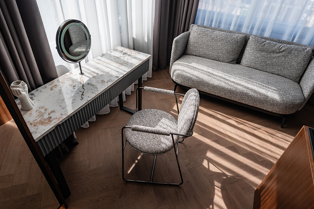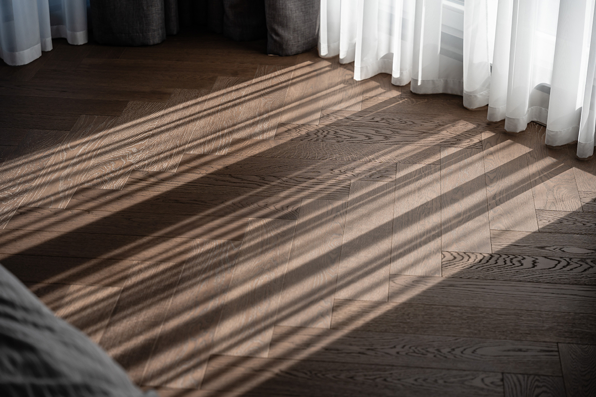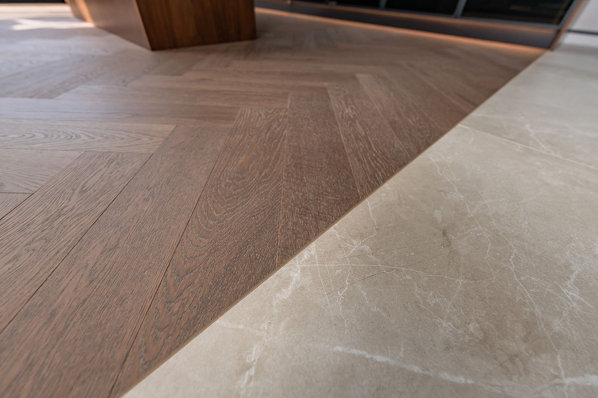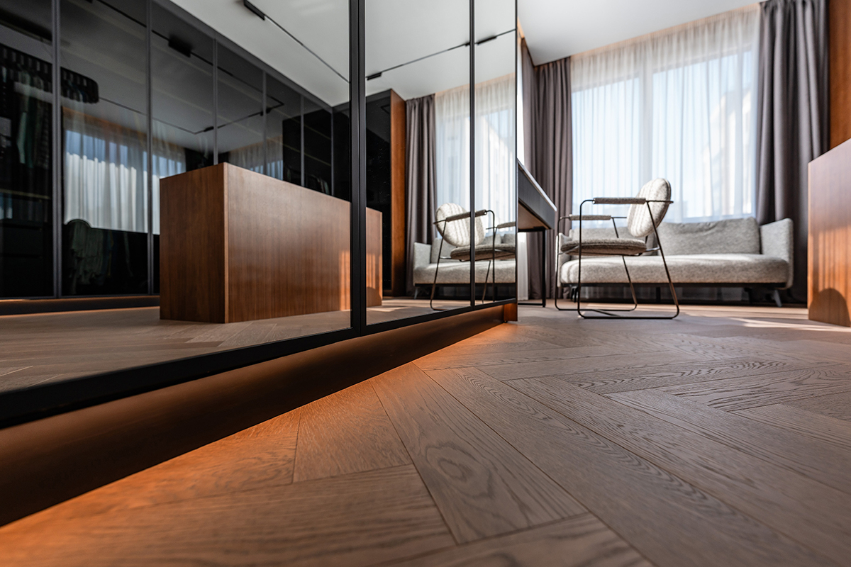 Центральным элементом напольного покрытия стала паркетная доска Coswick из дуба, уложенная «английской ёлочкой». Этот классический способ укладки оживил пространство, добавив ему ритма и движения, а натуральная текстура дуба стала фоном для светлых стен и выразительных каменных поверхностей.