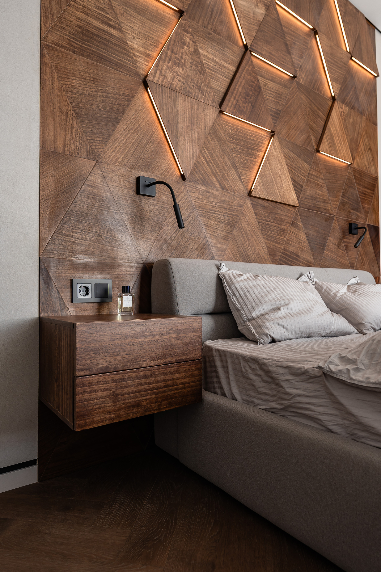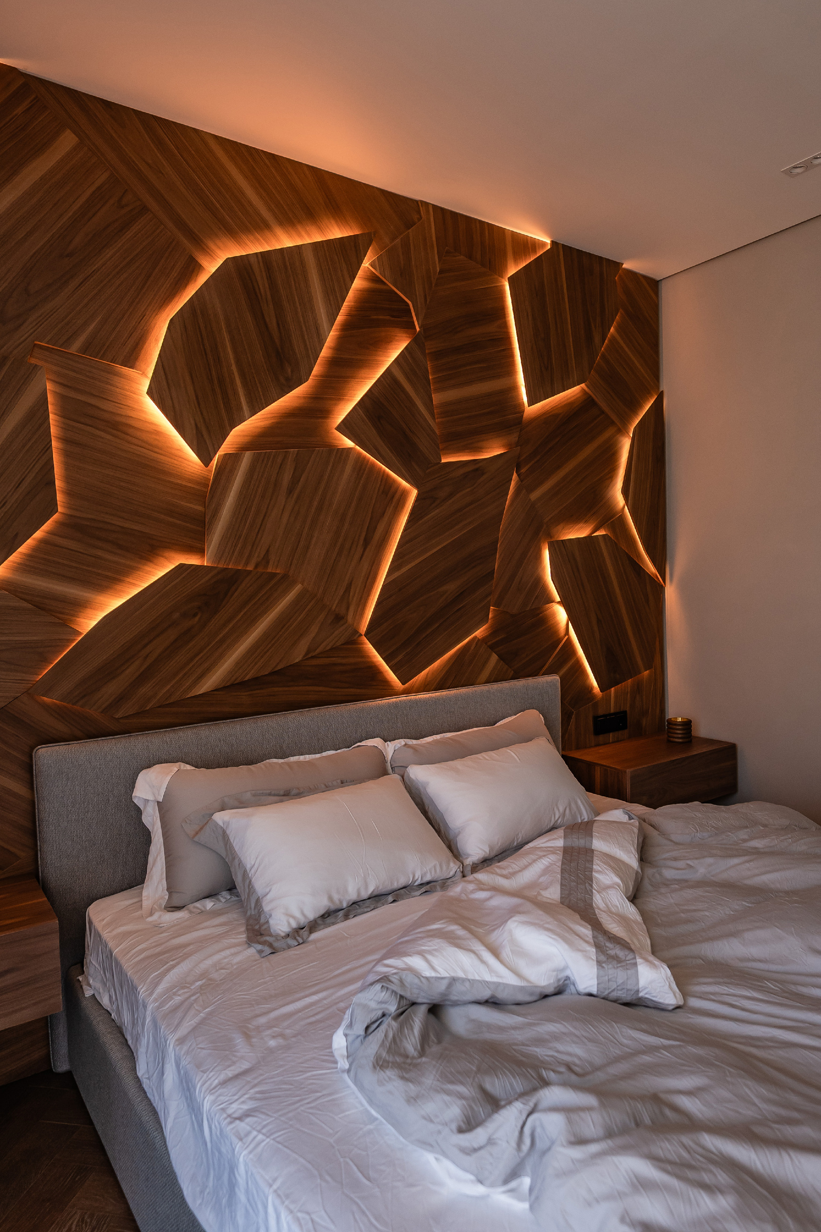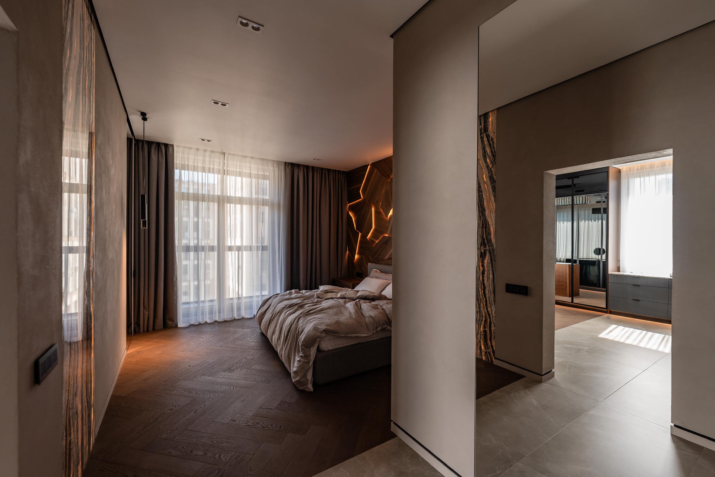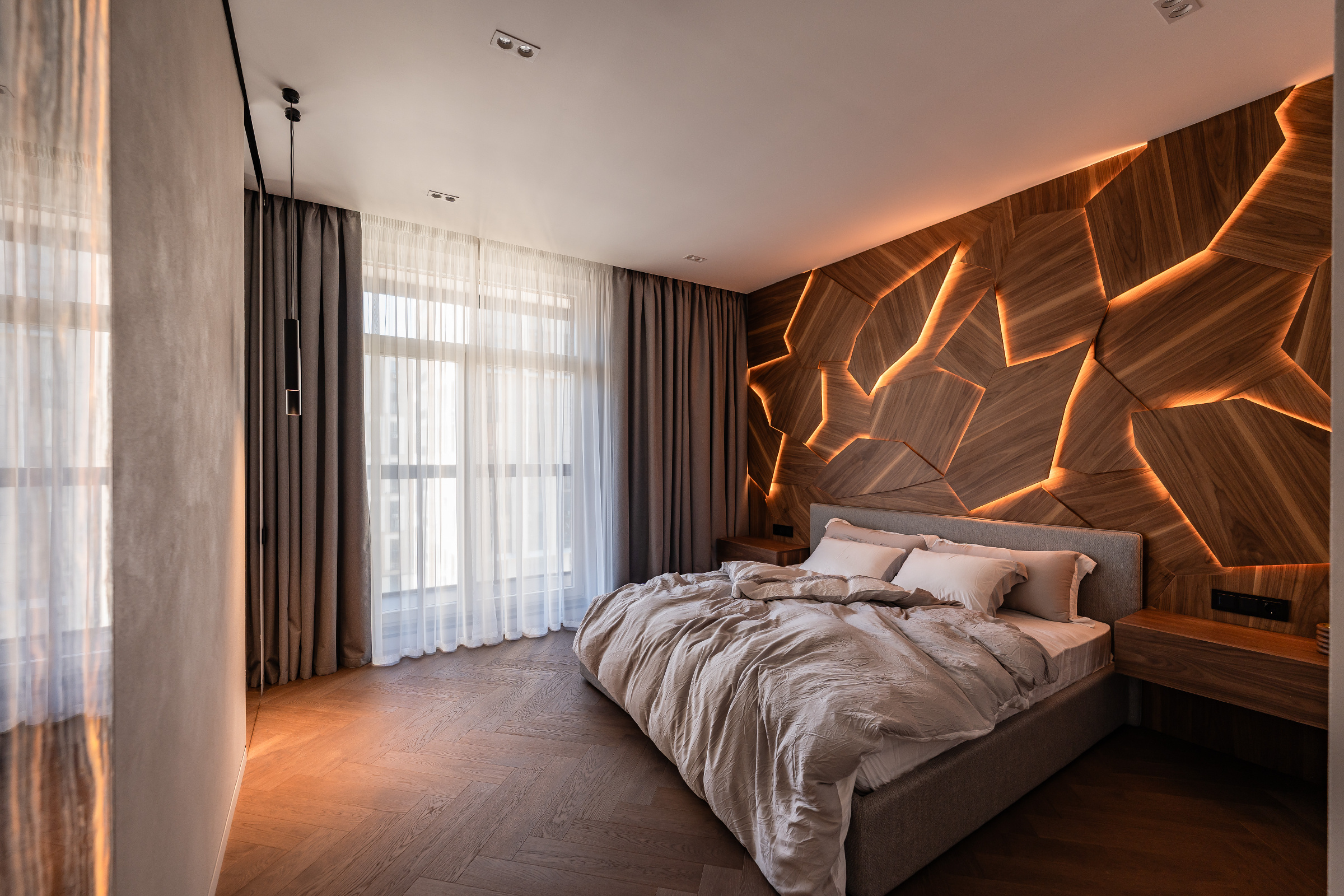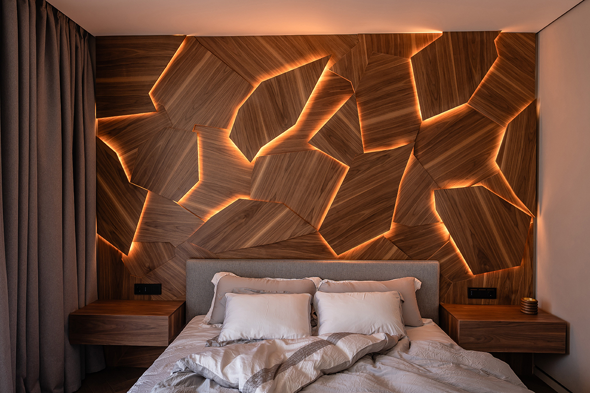 Главной идеей проекта стала любовь заказчиков к дереву и камню. В отделке использованы три породы древесины и два вида натурального камня — сочетание, придающее интерьеру естественную теплоту и благородство. Особое место заняли стеновые панели из натурального шпона, созданные по индивидуальному проекту и собранные в многоуровневый пазл с эффектной подсветкой.