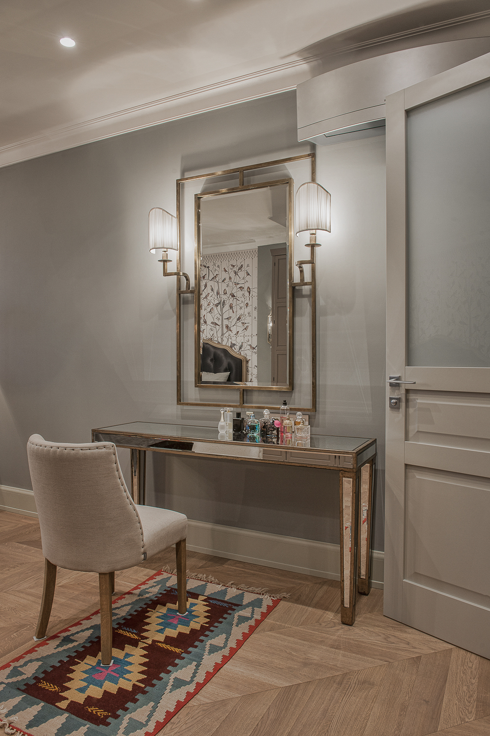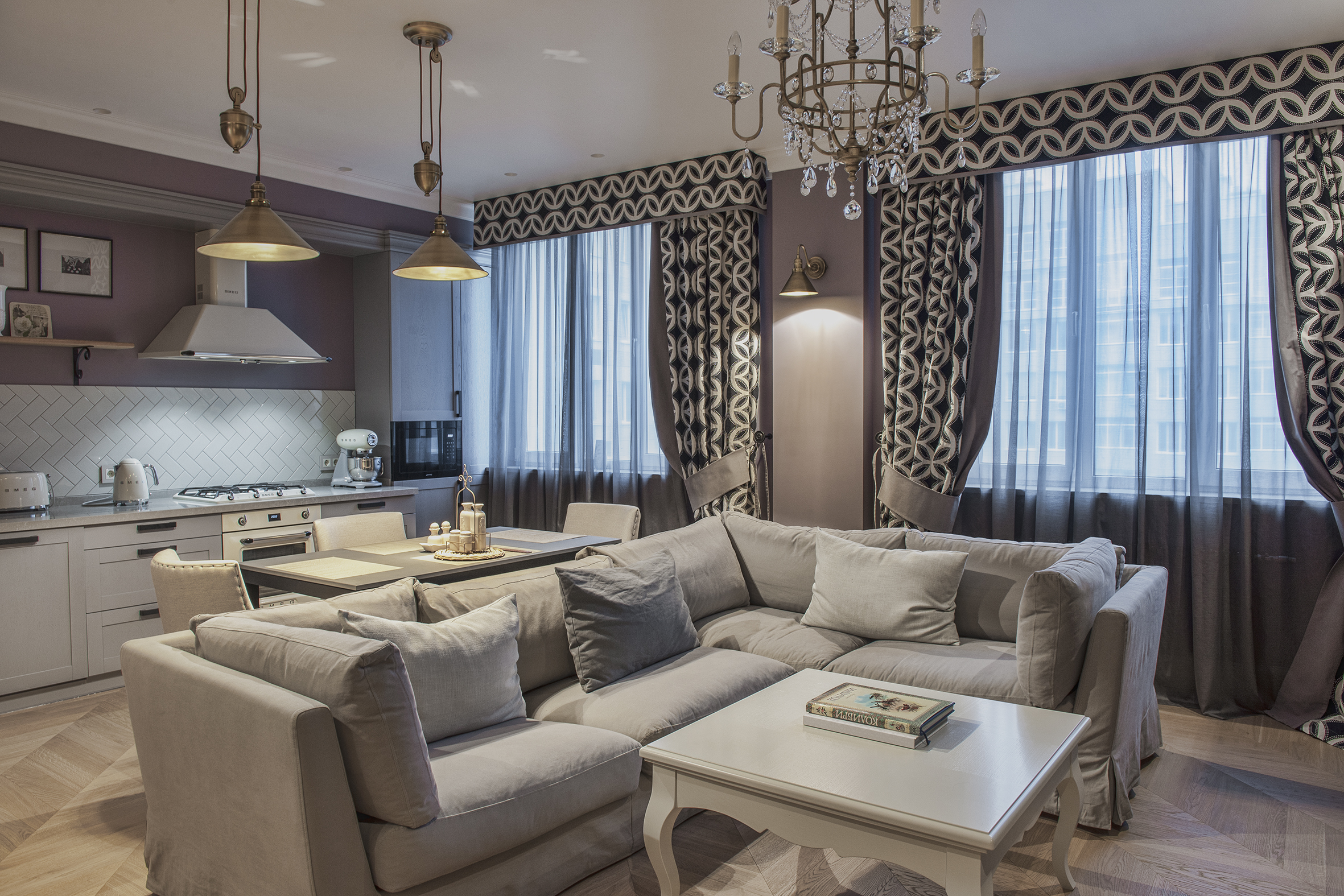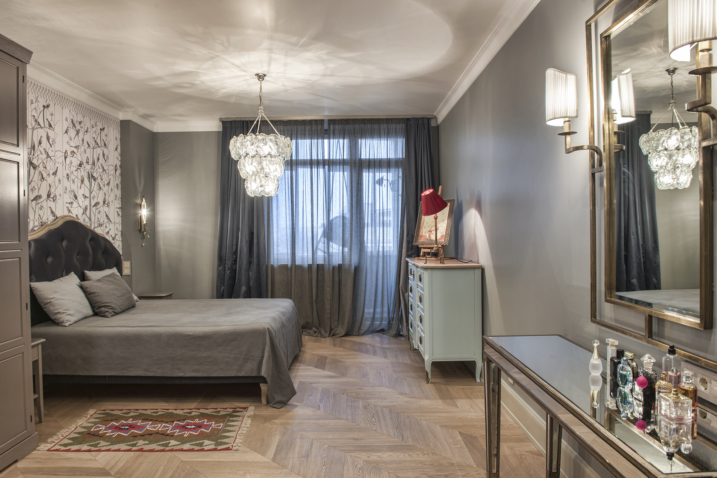 Дизайнер Ирина Налимова всегда находит неординарные решения, мастерски сочетая разные по стилистике предметы, и не боится экспериментировать с цветом. Как в этом обволакивающем монохромном и одновременно многоликом интерьере, раскрывающем всю глубину и богатство оттенков и полутонов благородного серого цвета. Акцентные шторы обрамляют пространство, как богатая рама – рисунок в пастельных тонах. Сочетание современной классики и элементов ар-деко в мебели и декоре создает объемный, многослойный, выразительный интерьер. А теплый оттенок натурального дубового паркета служит для него мягким естественным фоном.