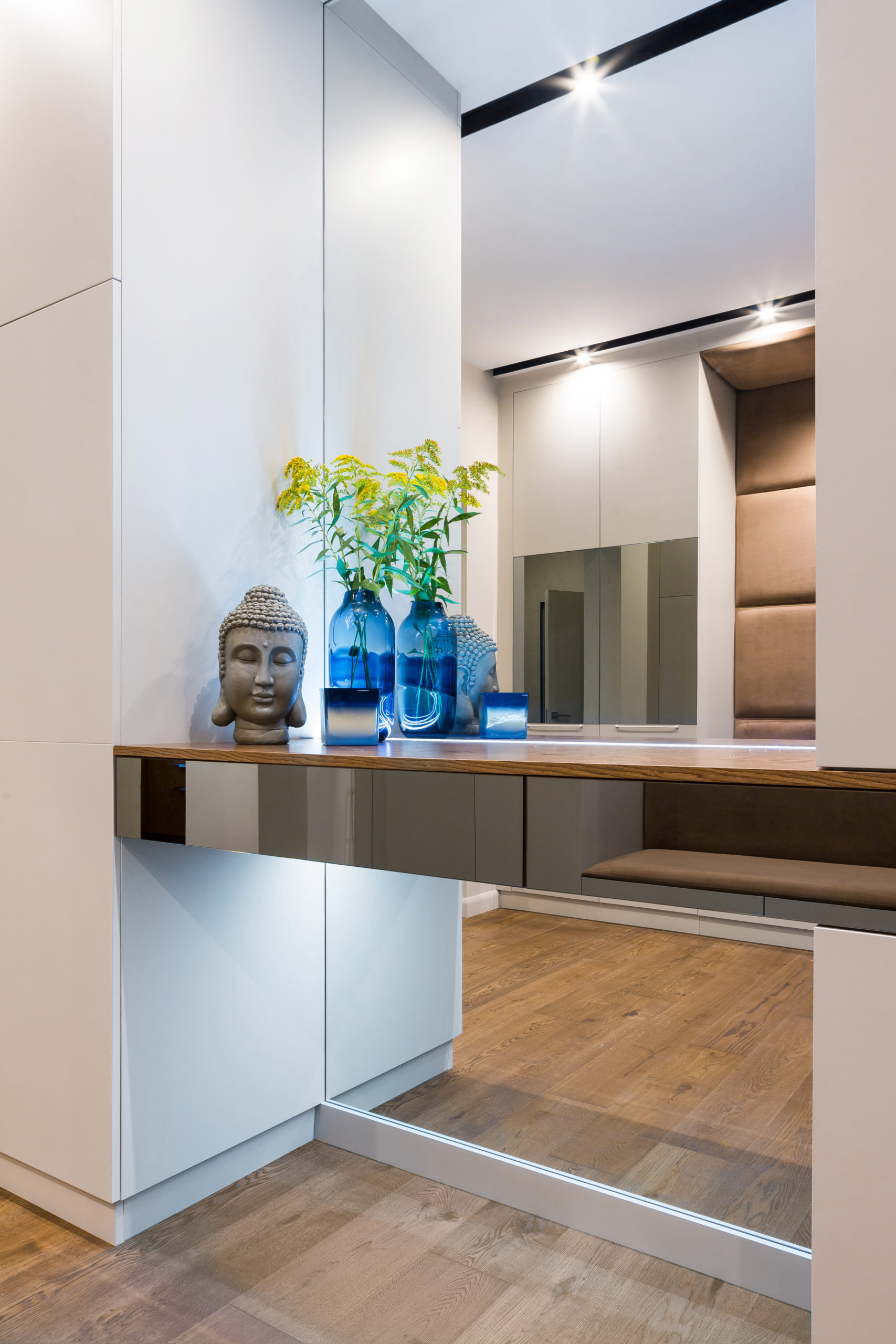 Сбалансированный, уравновешенный интерьер для молодого, уверенного в себе мужчины, который точно знает, чего хочет. Приступая к работе с дизайнером Данарой Ахметовой, он сформулировал свои пожелания: достаточные количество мест хранения, спокойные нейтральные тона, использование велюра и тактильно приятных текстур, а также паркетная доска на полу. В остальном доверился дизайнеру – вплоть до выбора картин и декора.