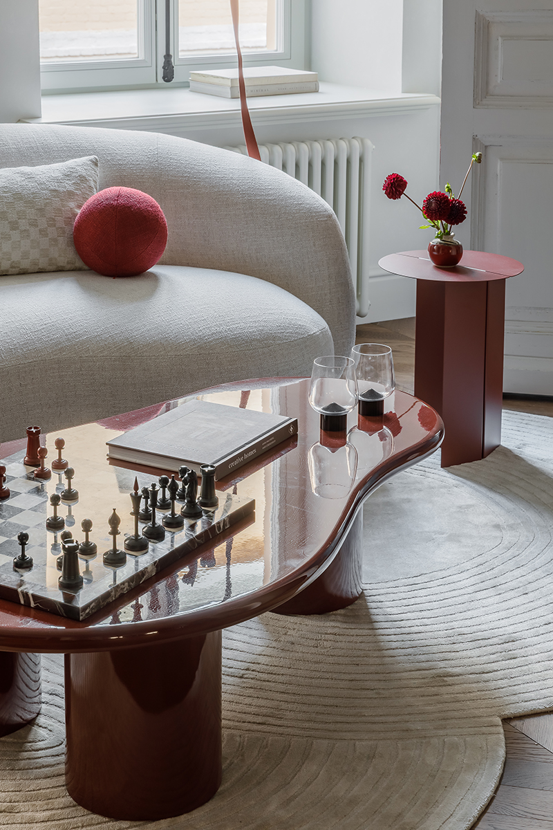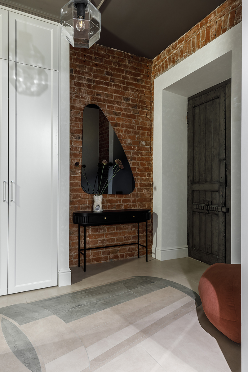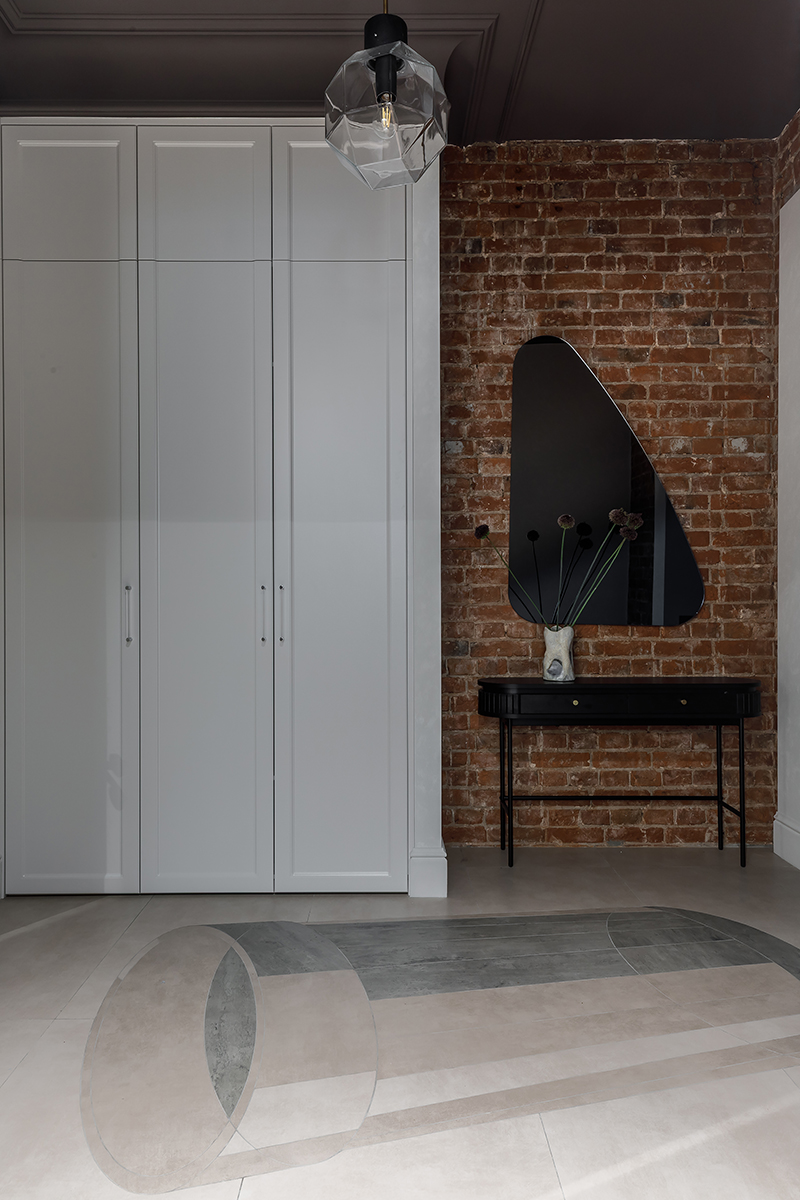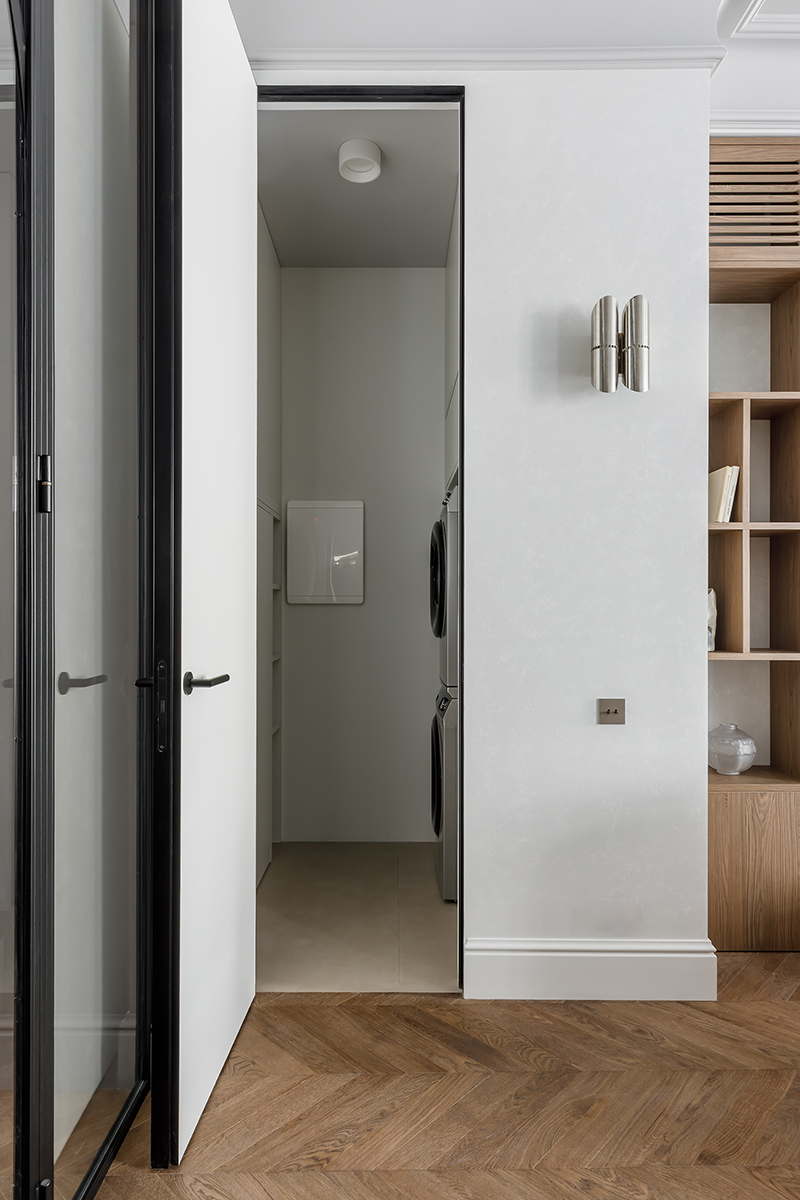 В основе проекта — уважение к исторической архитектуре и работа с подлинными пропорциями пространства: была сохранена аутентичная анфиладная планировка, характерная для московских квартир начала XX века. Исторические двери и найденный в интерьере обеденный стол были отреставрированы и переосмыслены, а утраченные элементы — воссозданы с максимальной точностью: паркет «французская елочка» был изготовлен компанией Coswick, ориентируясь на исторические аналоги и архитектурный контекст пространства.