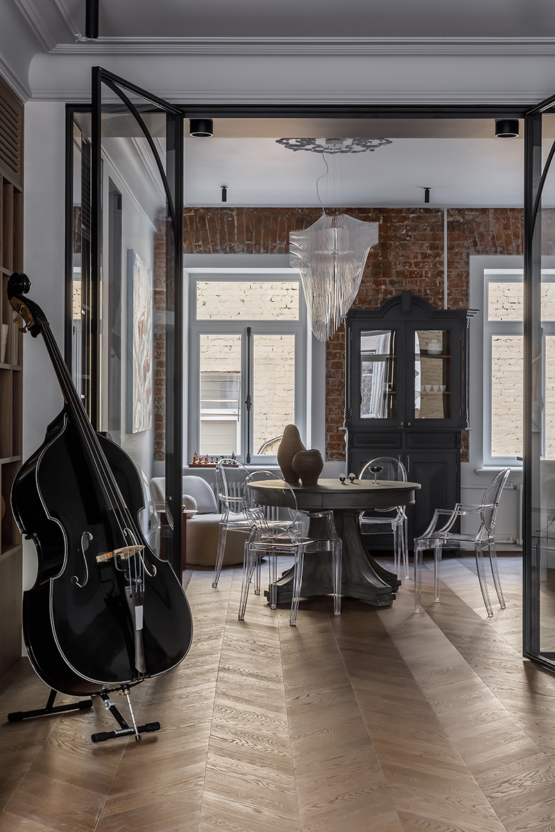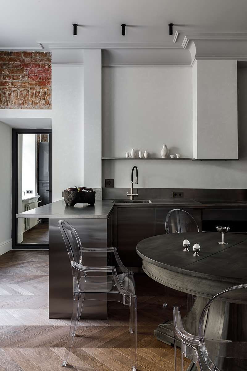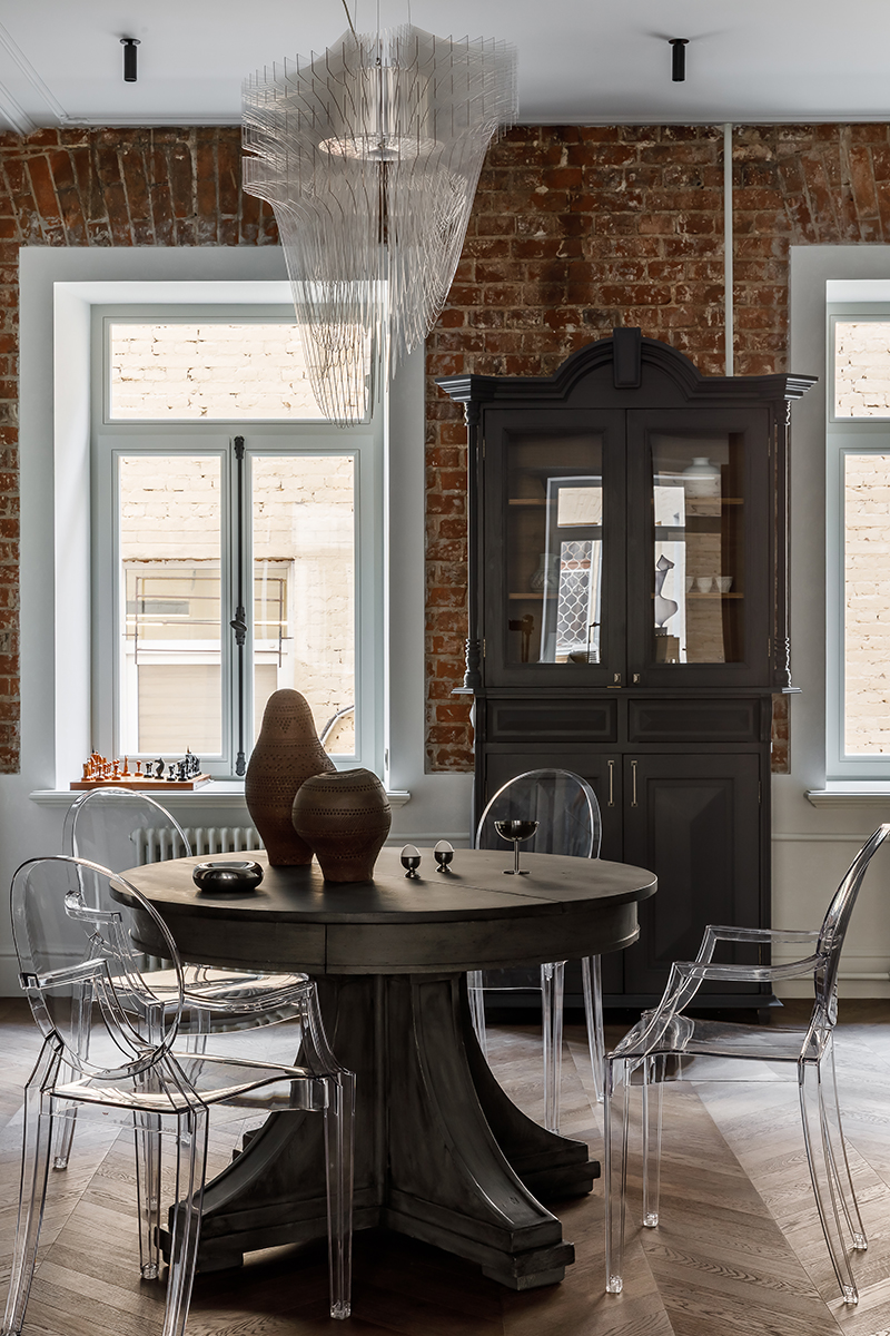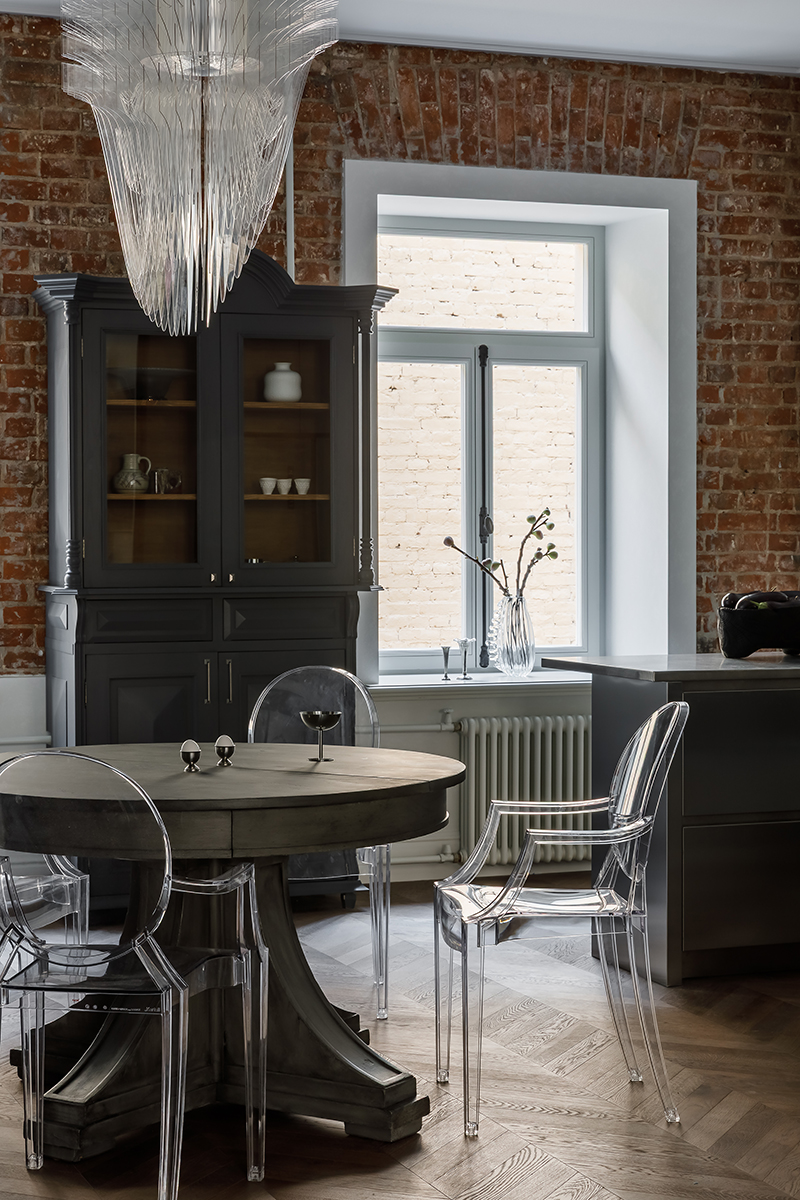 Стилистика проекта строится на контрасте эпох: кухня из нержавеющей стали, пластиковая дизайнерская люстра и культовые стулья-призраки вступают в диалог с дореволюционным деревянным столом и классическим паркетом.
