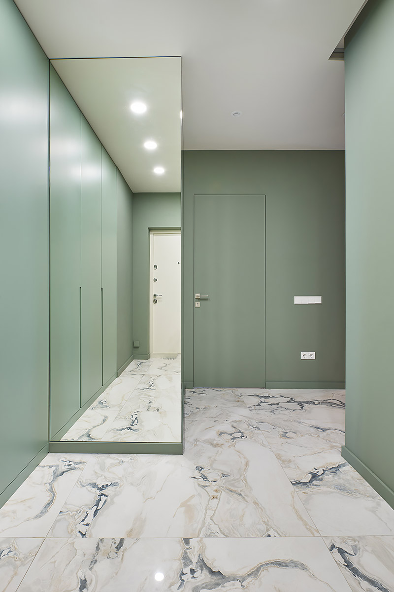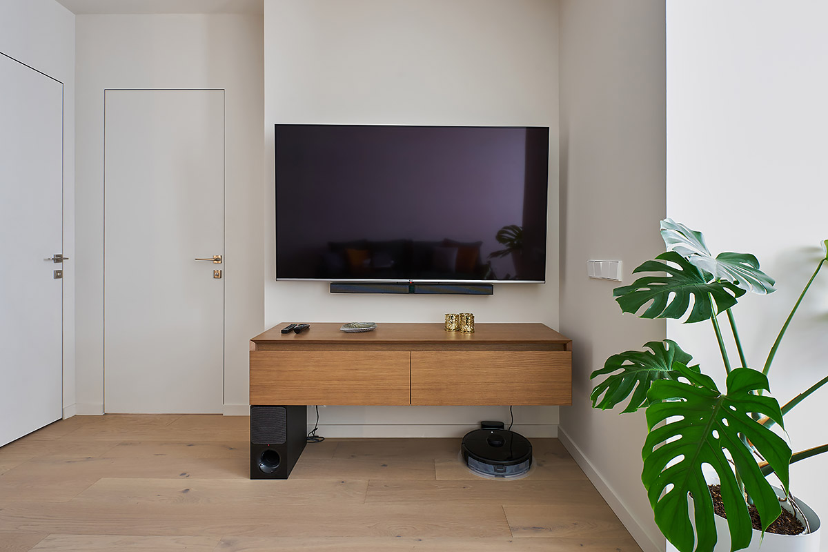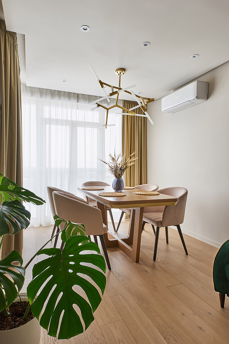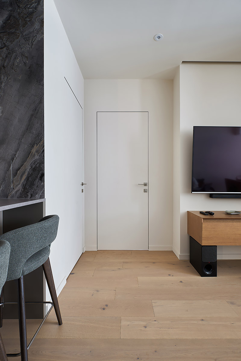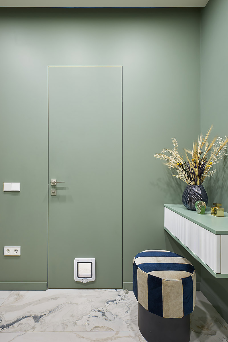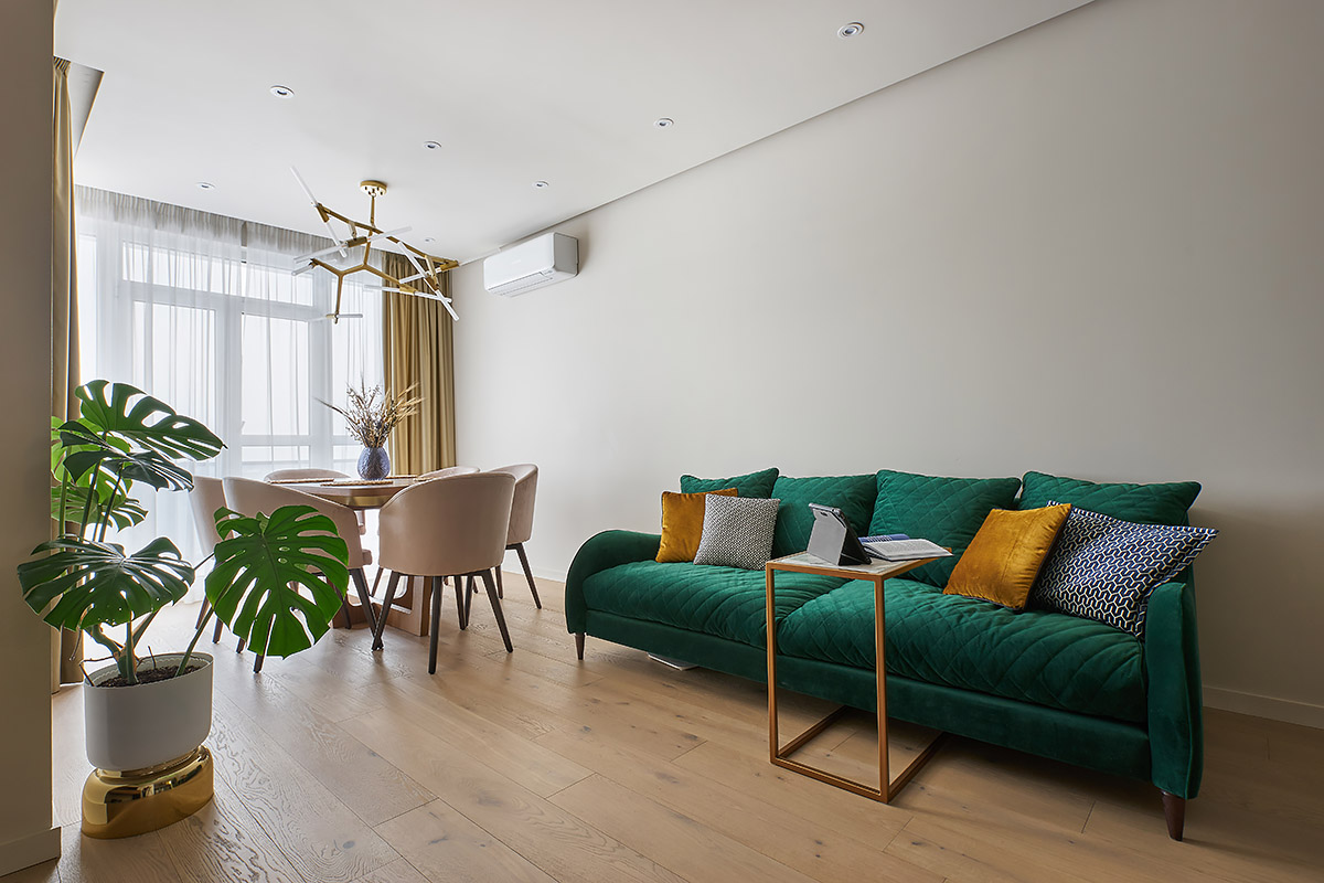 По первоначальному замыслу планировалось, что это будет лаконичный современный интерьер в нейтральной гамме с использованием качественных натуральных материалов. Но в процессе ремонта он наполнился цветом, в нем появились глубина и характер. Светло-зеленые оттенки стен в прихожей и кухне, а также акцентный бирюзовый диван в гостиной не только разбавили общий монохром, но и подыграли теплым светло-песочным оттенкам паркетного пола, текстиля и шпонированных элементов мебели.