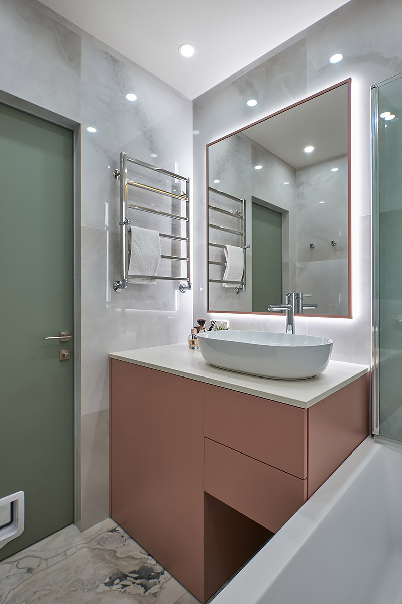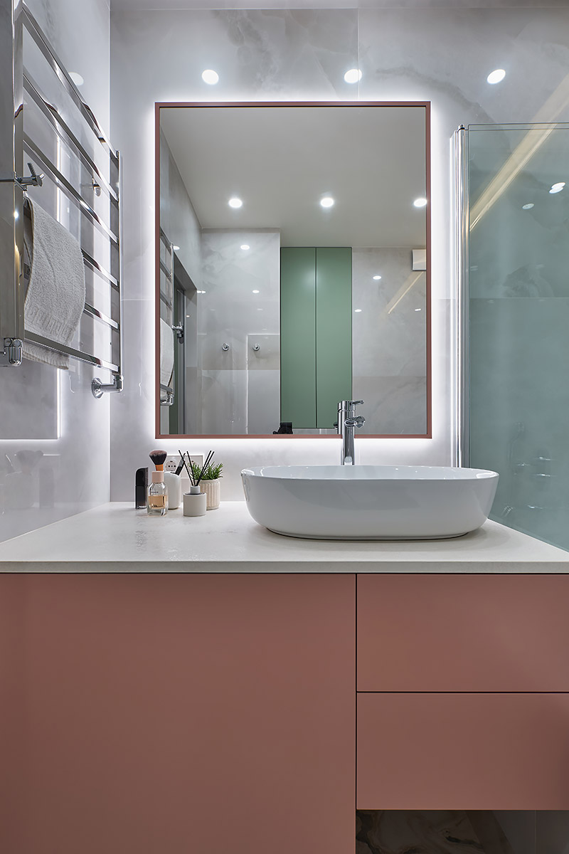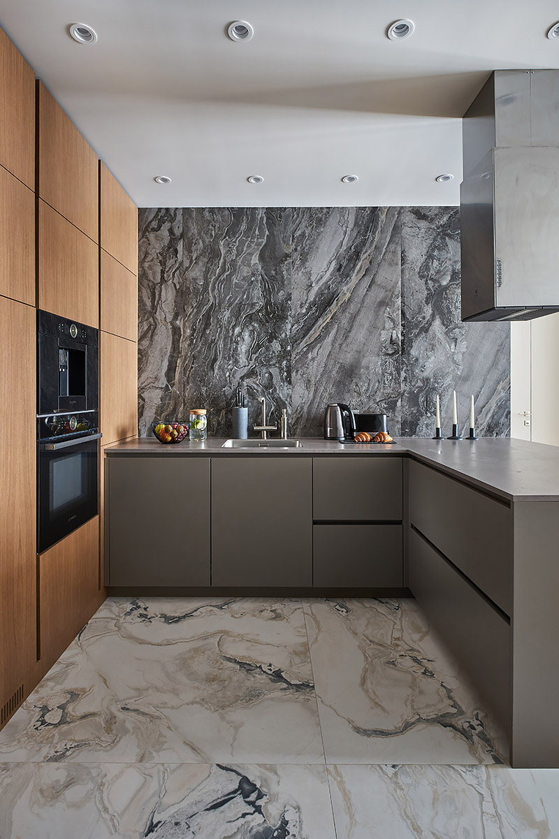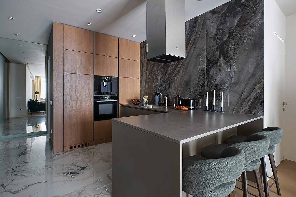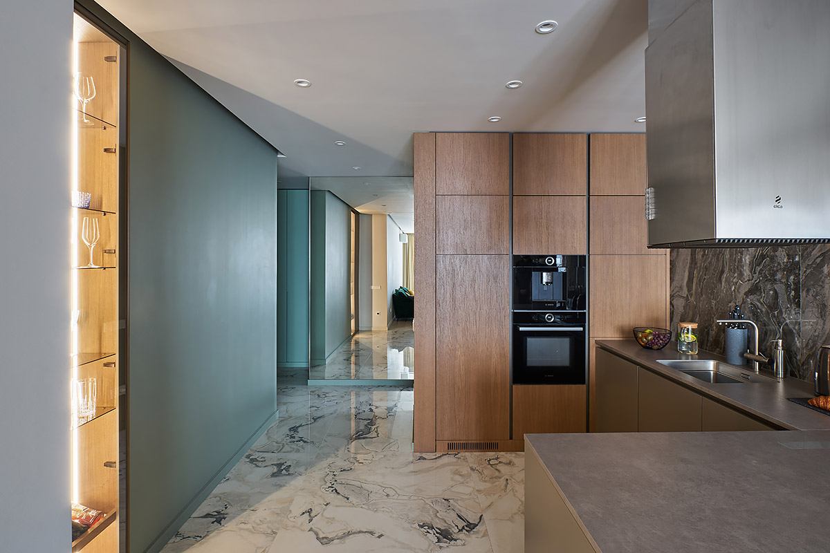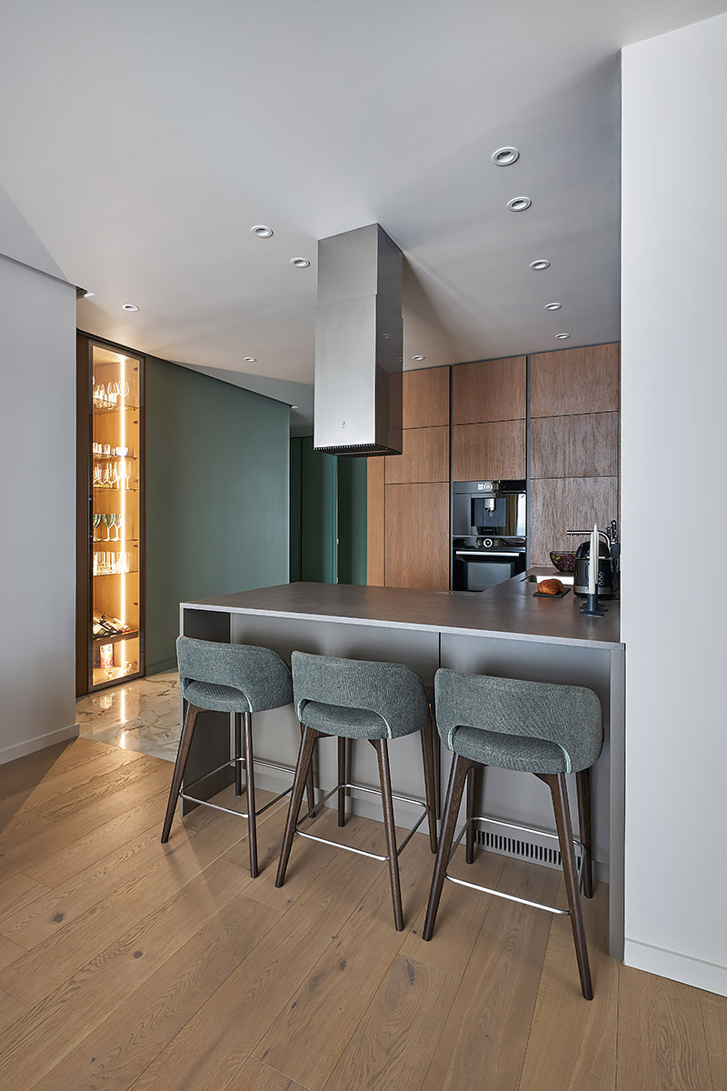 Особенность этого проекта заключается в том, что совмещенная с гостиной кухня-столовая расположена в центре квартиры. Таково было желание заказчицы.