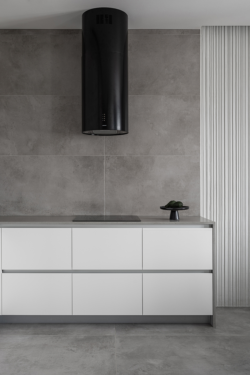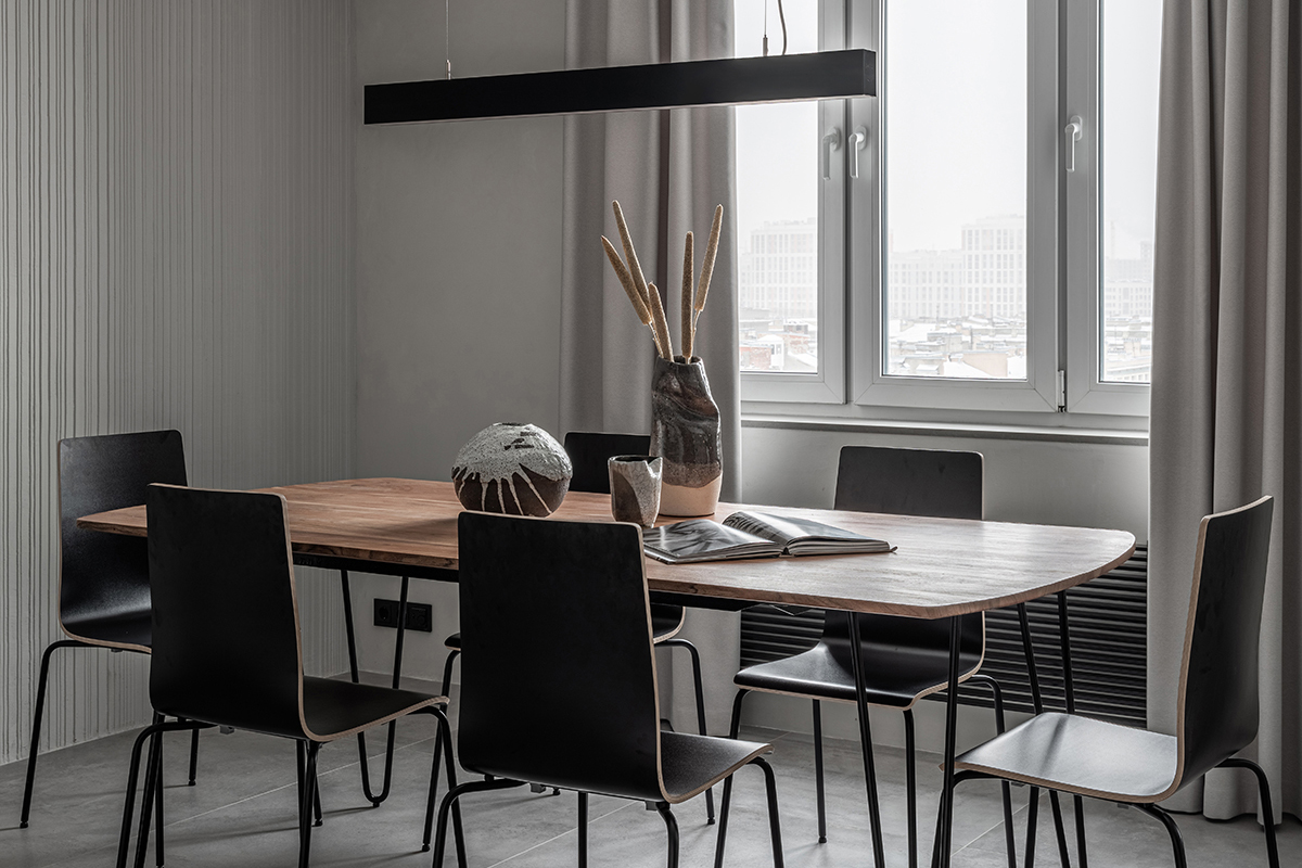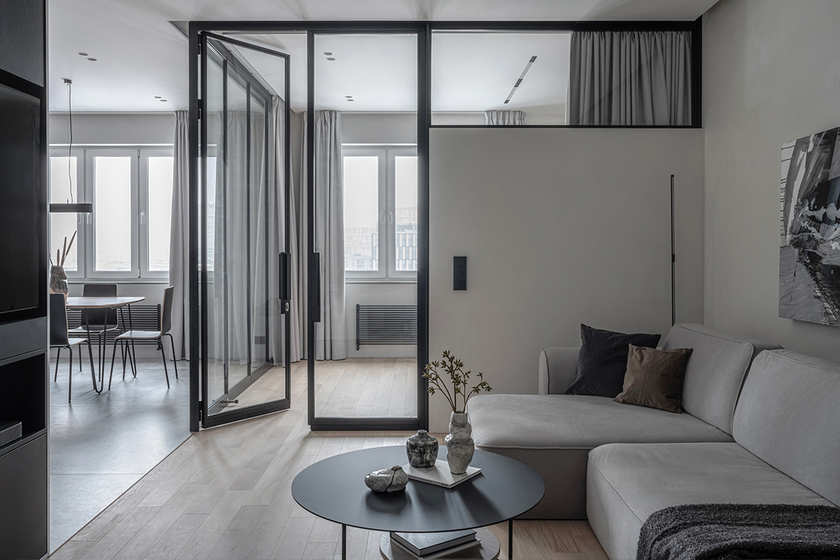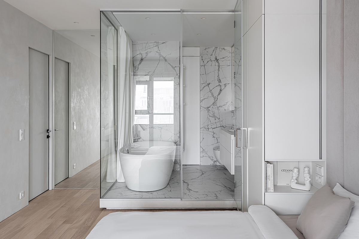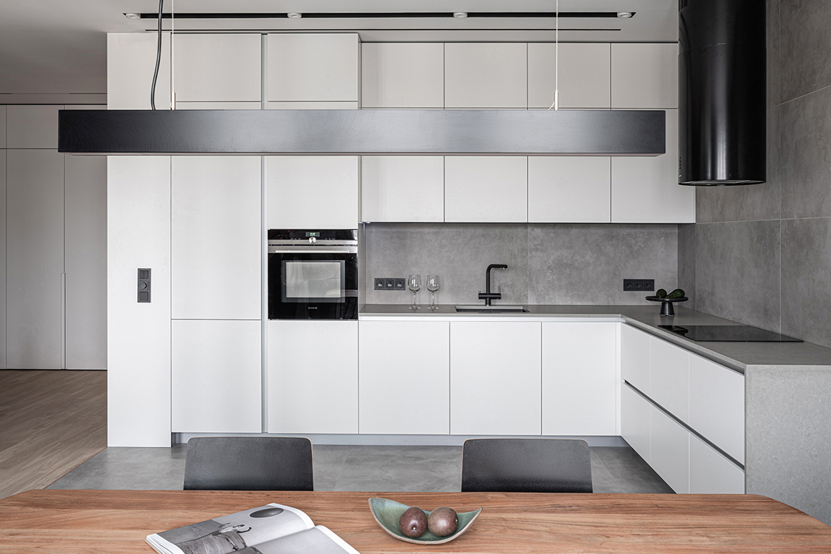 Интерьер апартаментов оформлен в выдержанном стиле, с сильными и интересными дизайнерскими решениями, что придает проекту характер. Сочетание матовой белой поверхности и серого оттенка бетона выступает как главный лейтмотив дизайна.