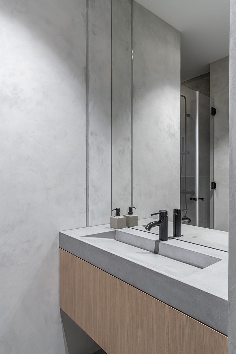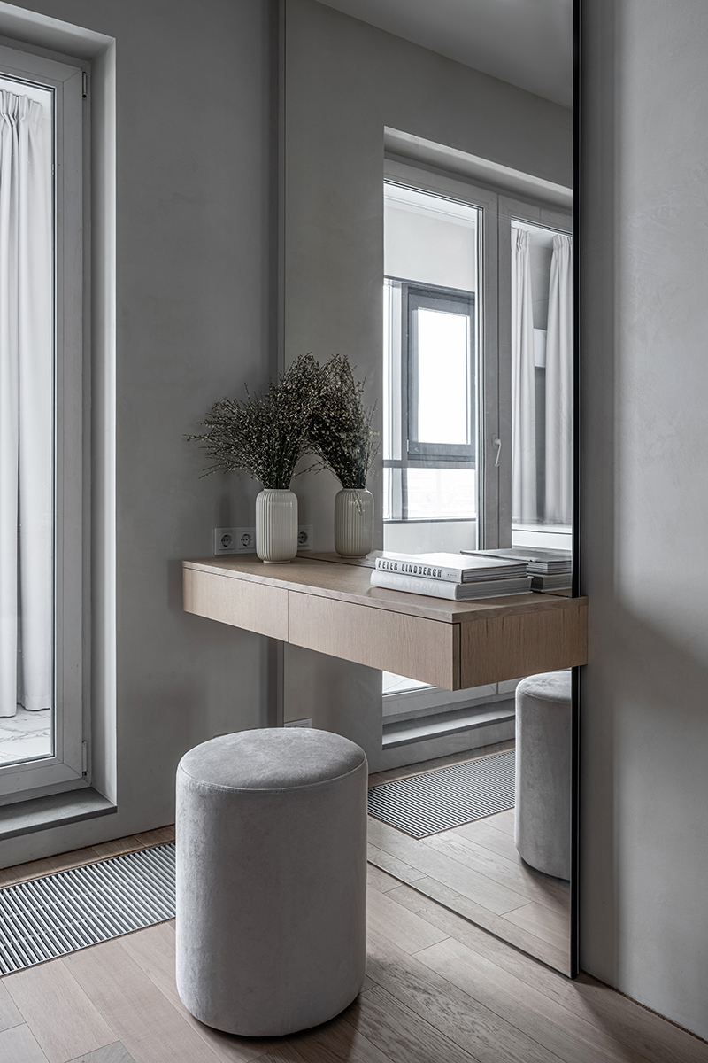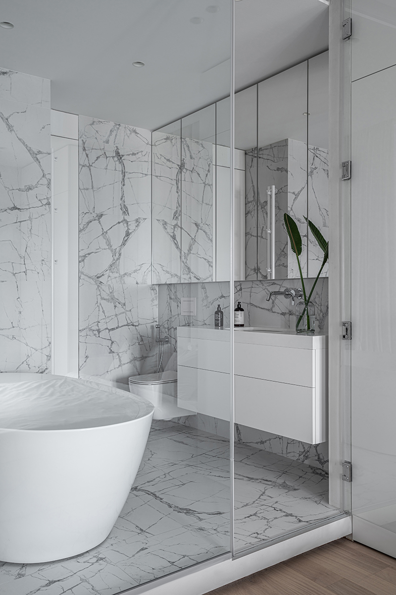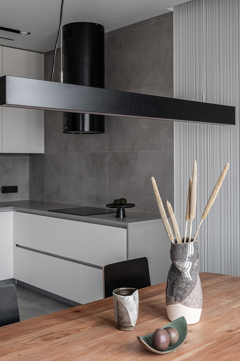 Интерьер апартаментов оформлен в выдержанном стиле, с сильными и интересными дизайнерскими решениями, что придает проекту характер. Сочетание матовой белой поверхности и серого оттенка бетона выступает как главный лейтмотив дизайна.
