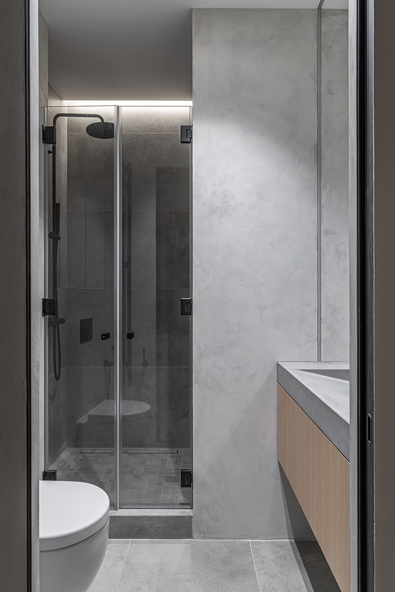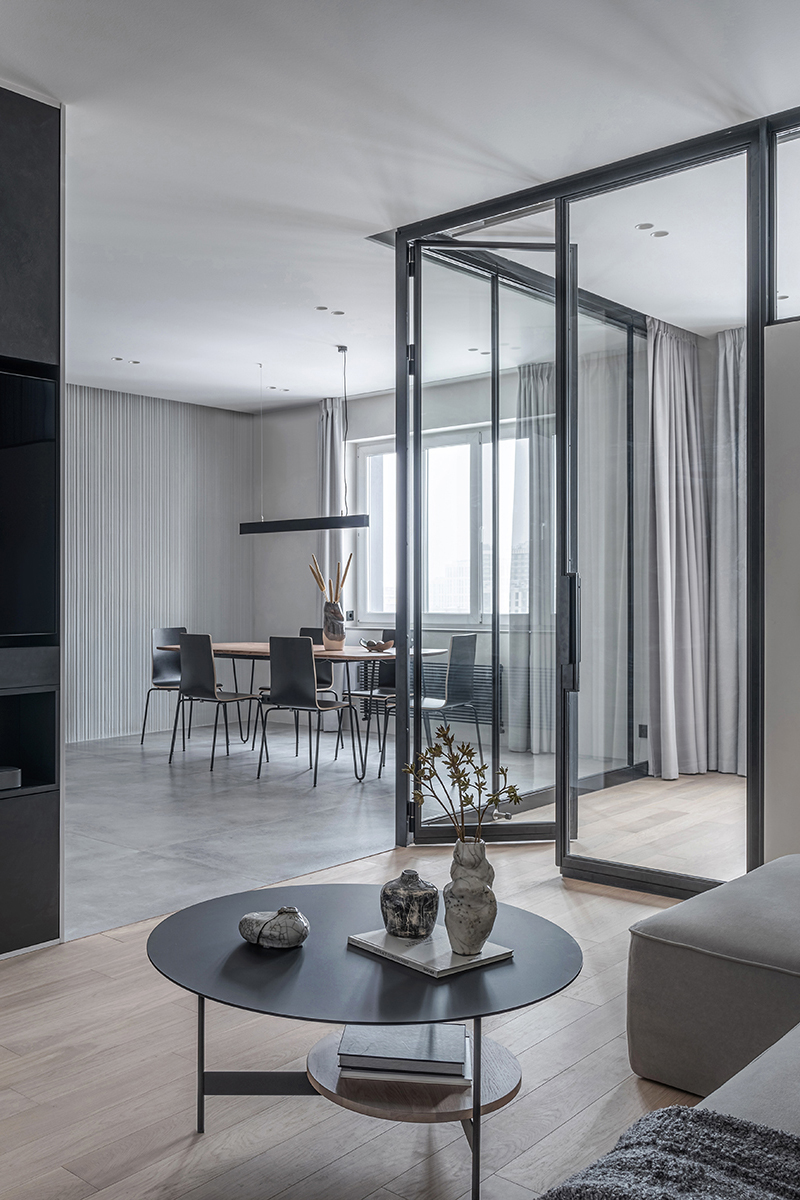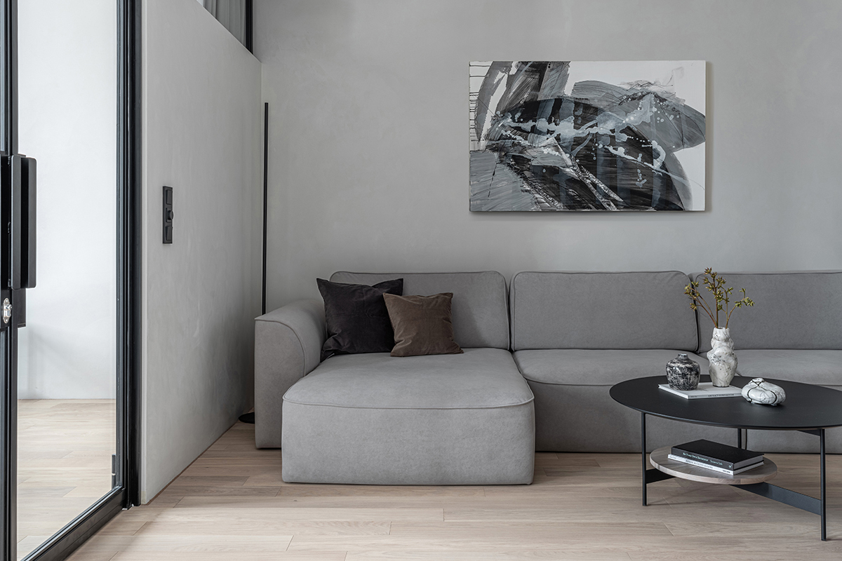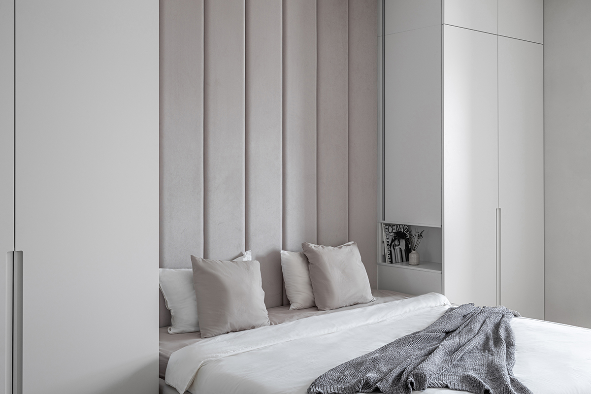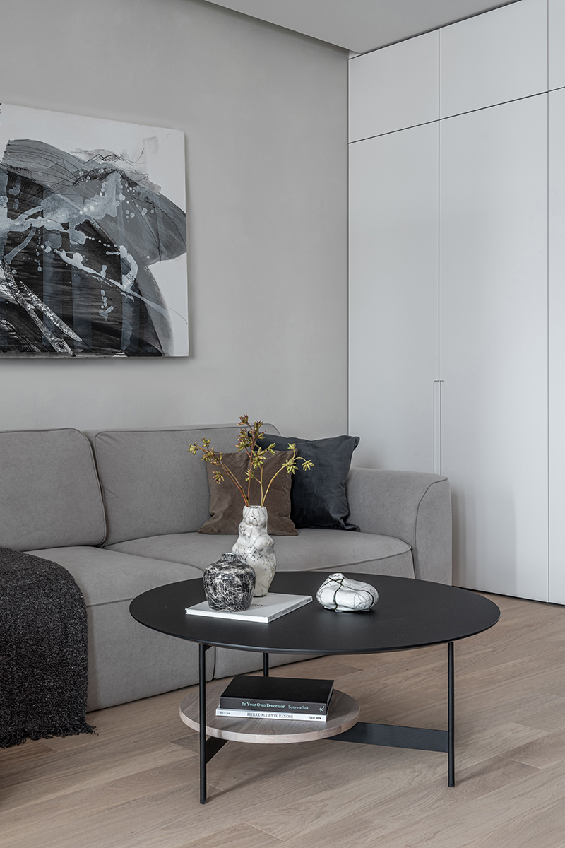 Интерьер апартаментов оформлен в выдержанном стиле, с сильными и интересными дизайнерскими решениями, что придает проекту характер. Сочетание матовой белой поверхности и серого оттенка бетона выступает как главный лейтмотив дизайна.