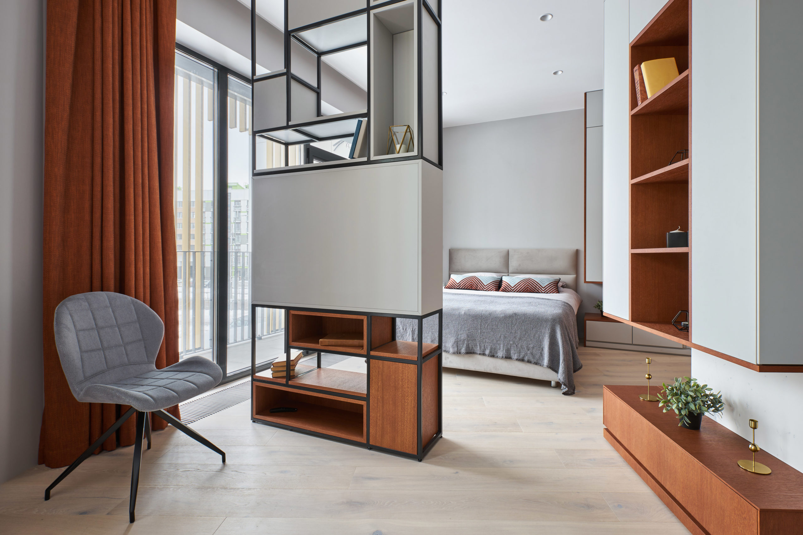 Строгий и лаконичный образ лег в основу интерьера квартиры-студии в ЖК «Новая Боровая» в Минске. Перед дизайнером стояла задача сохранить открытое пространство, при этом использовать площадь максимально функционально. Проектом предусмотрены три основные зоны: прихожая, кухня-столовая и спальня. В каждой из них особое внимание уделено системам хранения. Для сохранения целостности интерьера решили использовать единое напольное покрытие во всей квартире, кроме ванной комнаты.