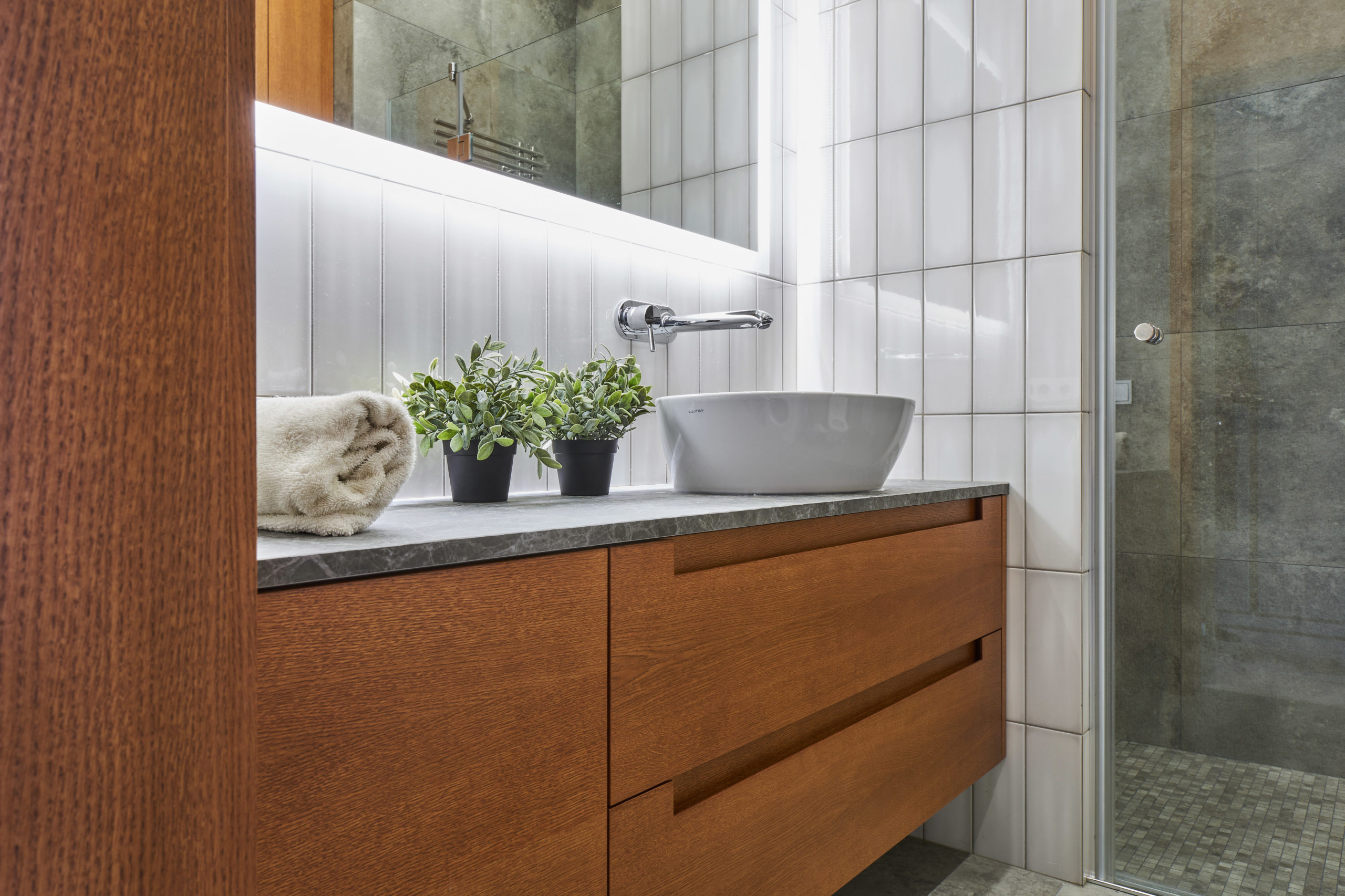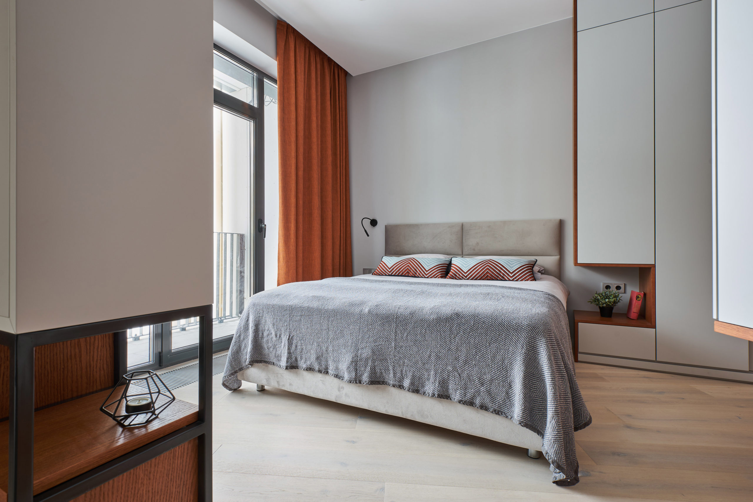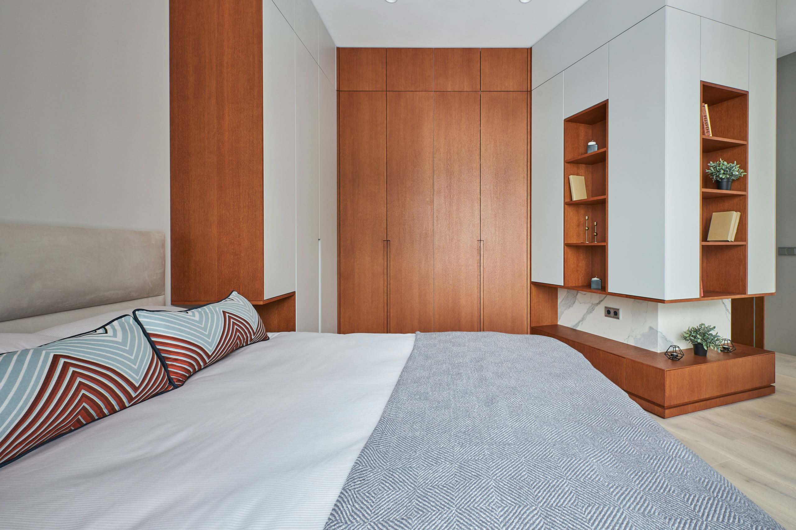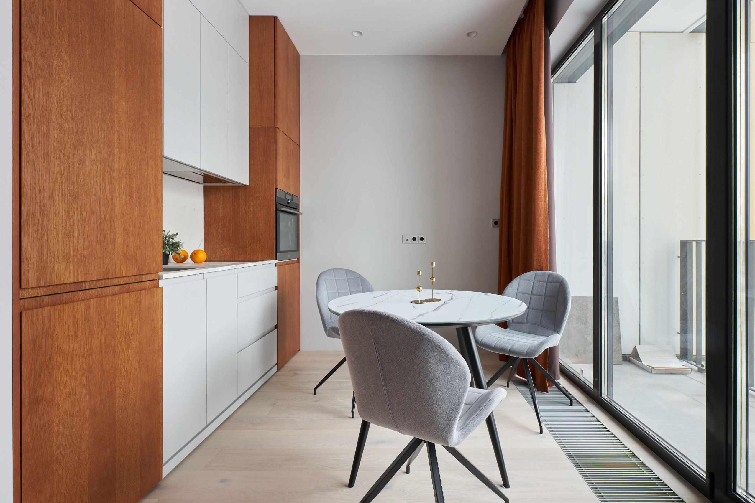 Основными критериями при выборе мебели и отделочных материалов являлись высокое качество, экологичность, надежность и долговечность. Вся мебель произведена по эскизам дизайнера. Нейтральный светло-серый цвет стен и фасадов мебели выгодно подчеркивается выразительным цветом шпона дуба и оттенками охры в текстиле. Дополняет это сочетание светлый, но теплый оттенок пола, для которого выбрали паркетную доску Coswick.