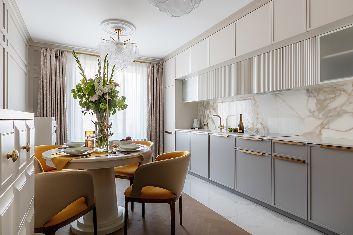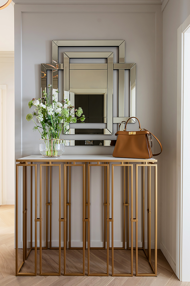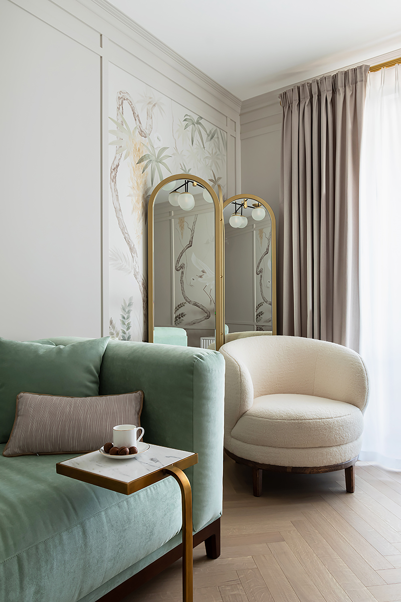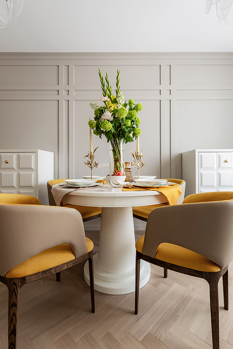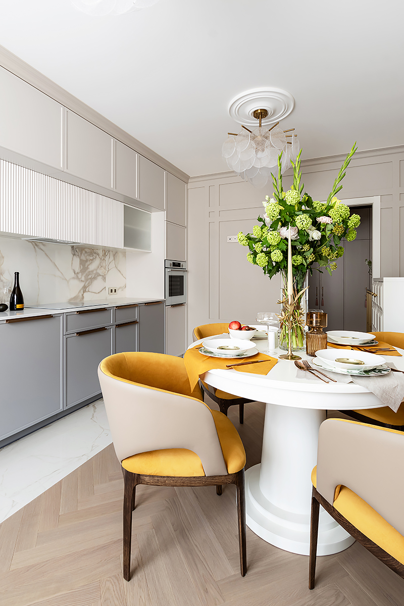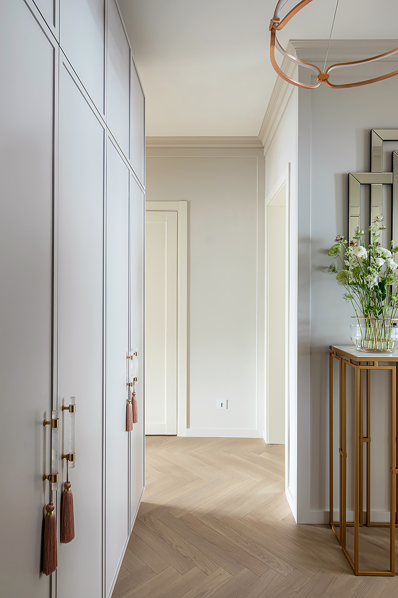 – Одним из первых в проект был выбран паркет. Я, как поклонник цветовой гаммы Coswick, представляла в интерьере именно его. И оттенки Серого Дэви в английской елочке влюбили в себя с первого взгляда.