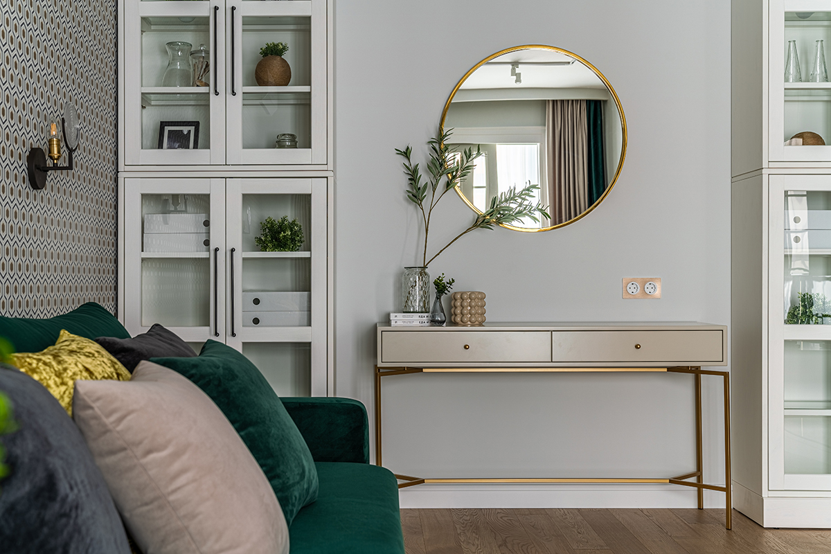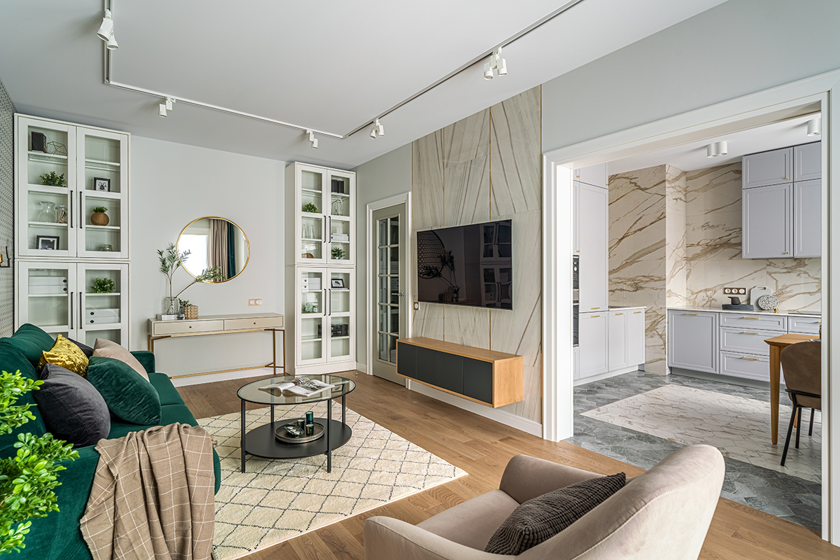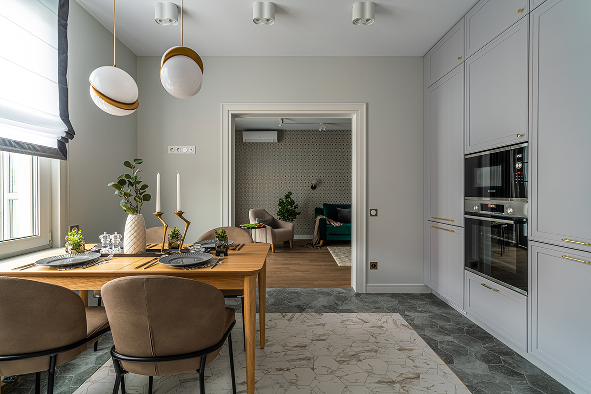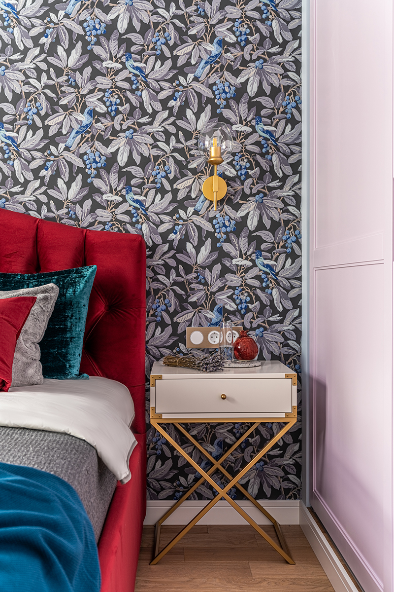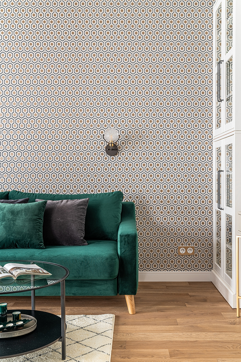 Интерьер решен в современном стиле с точечными отсылками к ар-деко в виде элементов из латуни в отделке, мебели, светильниках, а также характерного геометрического орнамента обоев с эффектом золочения. Экспрессии добавляют цветовые акценты: в гостиной – изумрудный диван как доминанта интерьера, в спальне – алое изголовье кровати в контрасте с сине-черными обоями, а в детской – нежные и обволакивающие пудровый и мятный оттенки.