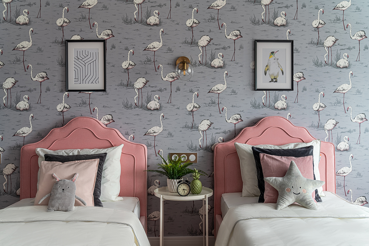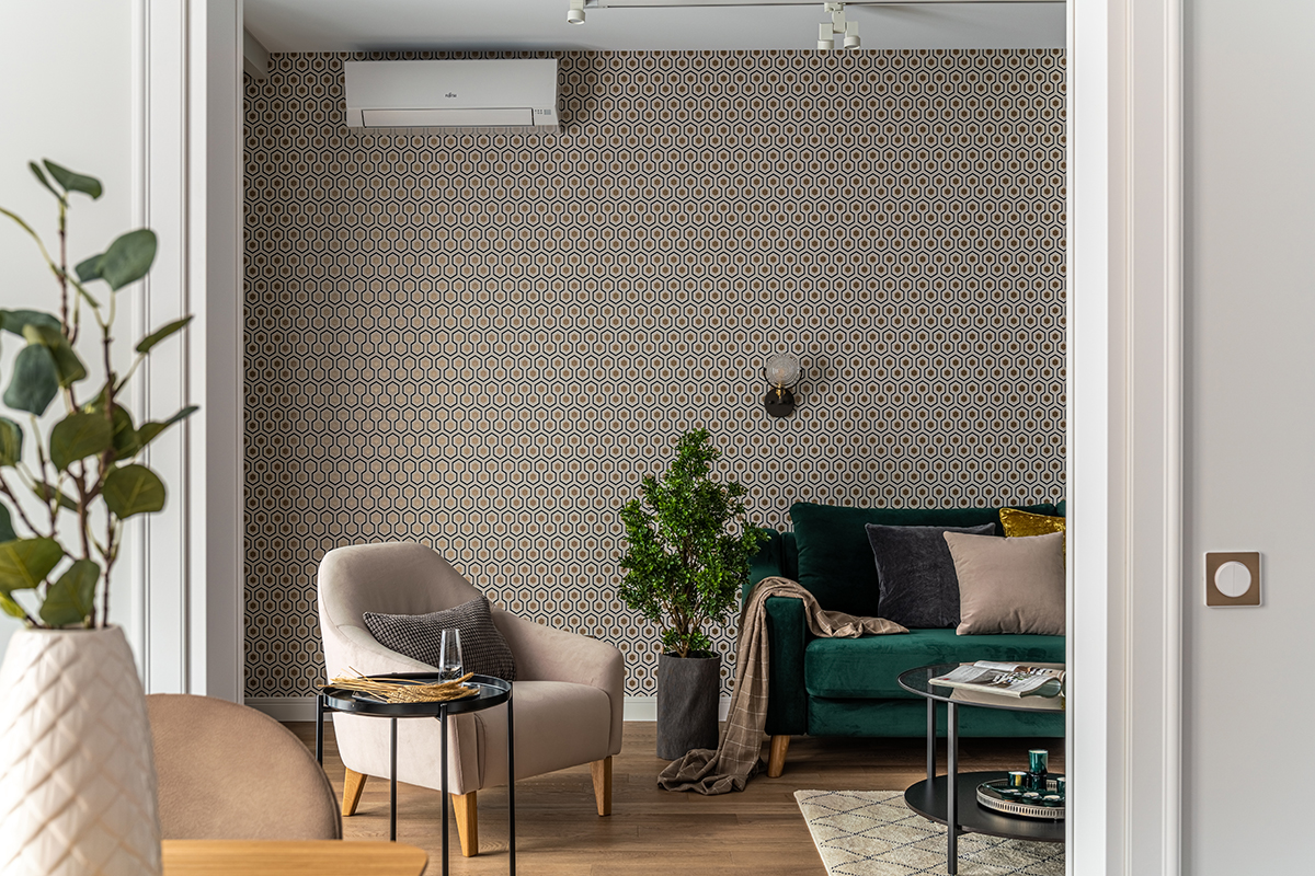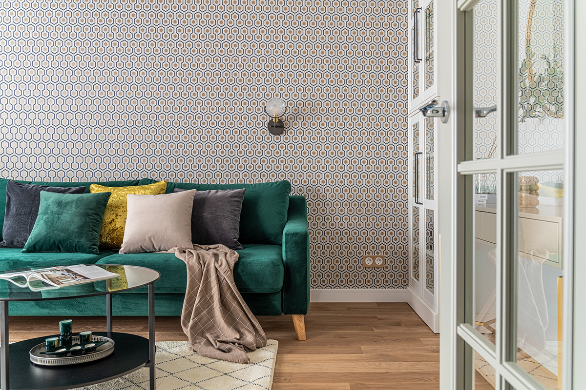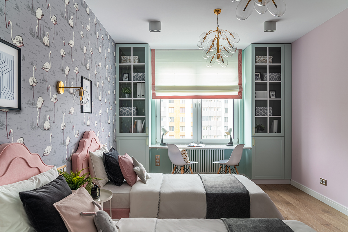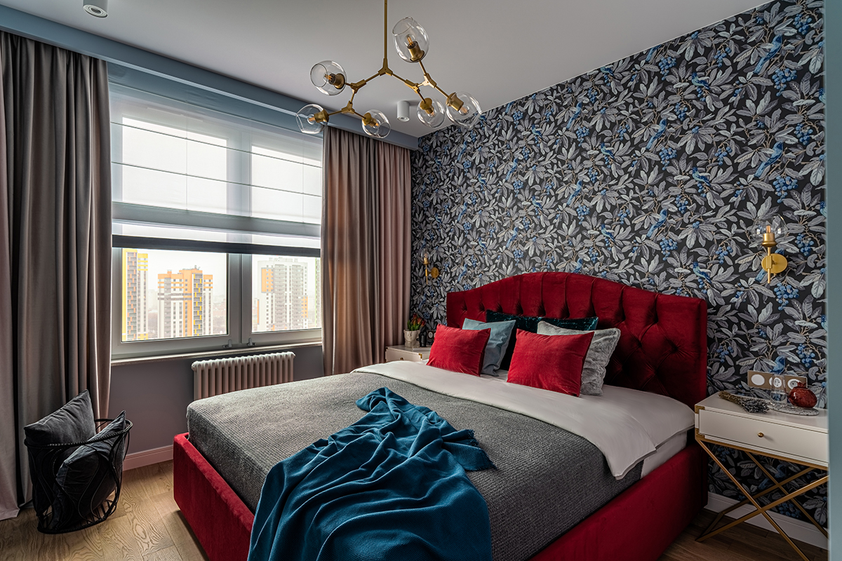 Интерьер решен в современном стиле с точечными отсылками к ар-деко в виде элементов из латуни в отделке, мебели, светильниках, а также характерного геометрического орнамента обоев с эффектом золочения. Экспрессии добавляют цветовые акценты: в гостиной – изумрудный диван как доминанта интерьера, в спальне – алое изголовье кровати в контрасте с сине-черными обоями, а в детской – нежные и обволакивающие пудровый и мятный оттенки.