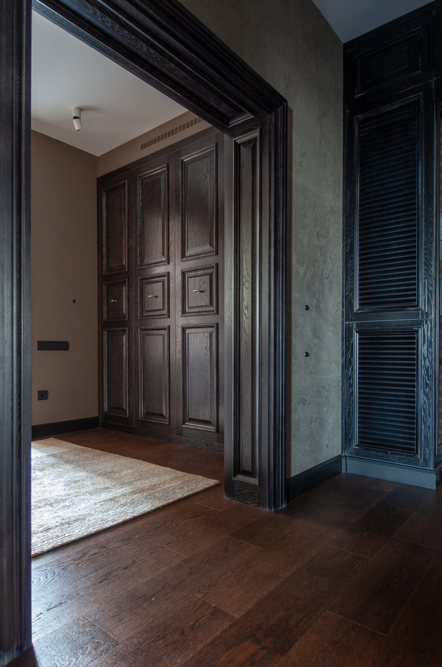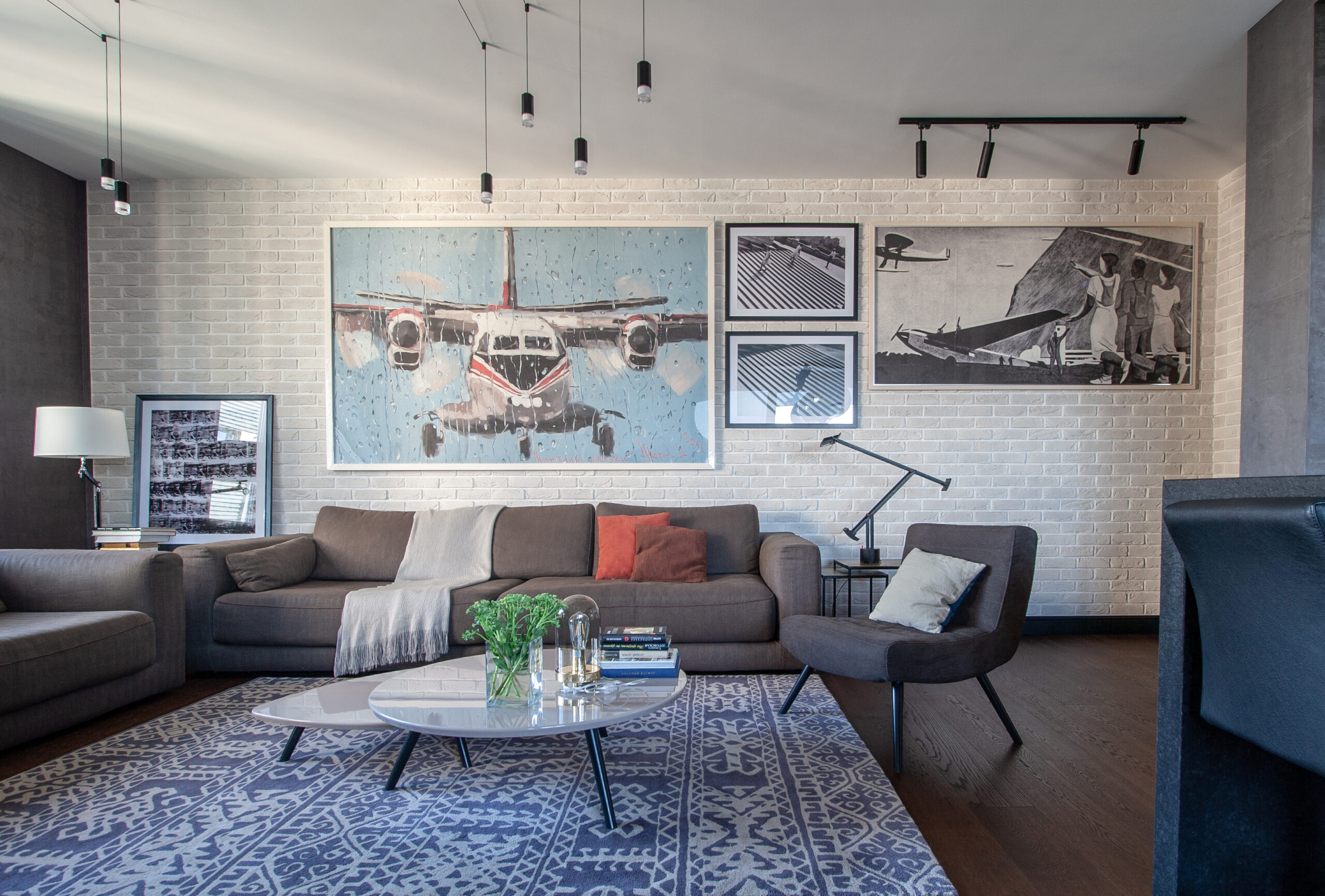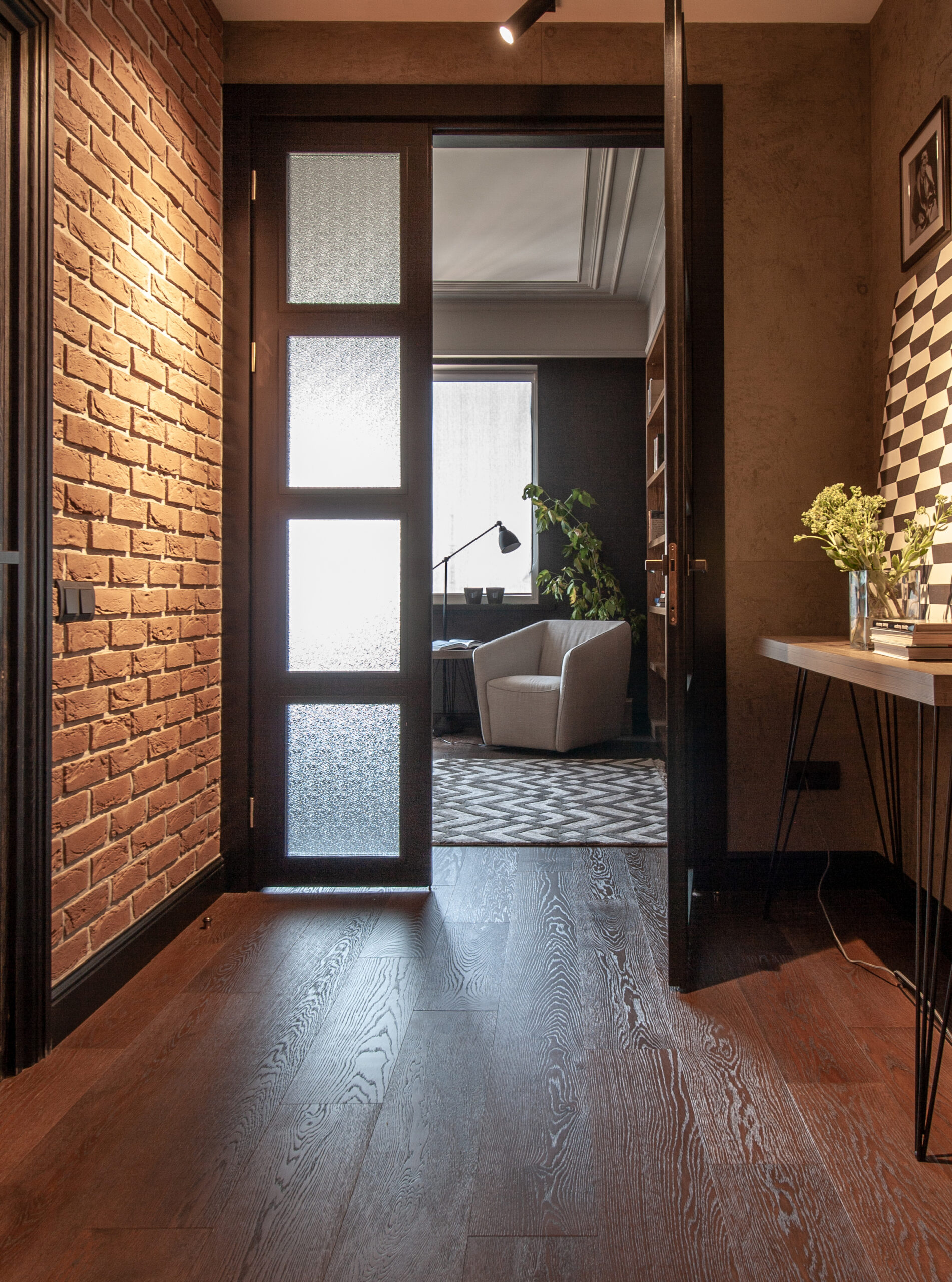 Интерьер построен на чередовании ритмов больших и малых пространств, темных и светлых тонов, простых и сложных поверхностей. Объединяющим элементом этой квартиры стала напольное покрытие — паркетная доска.