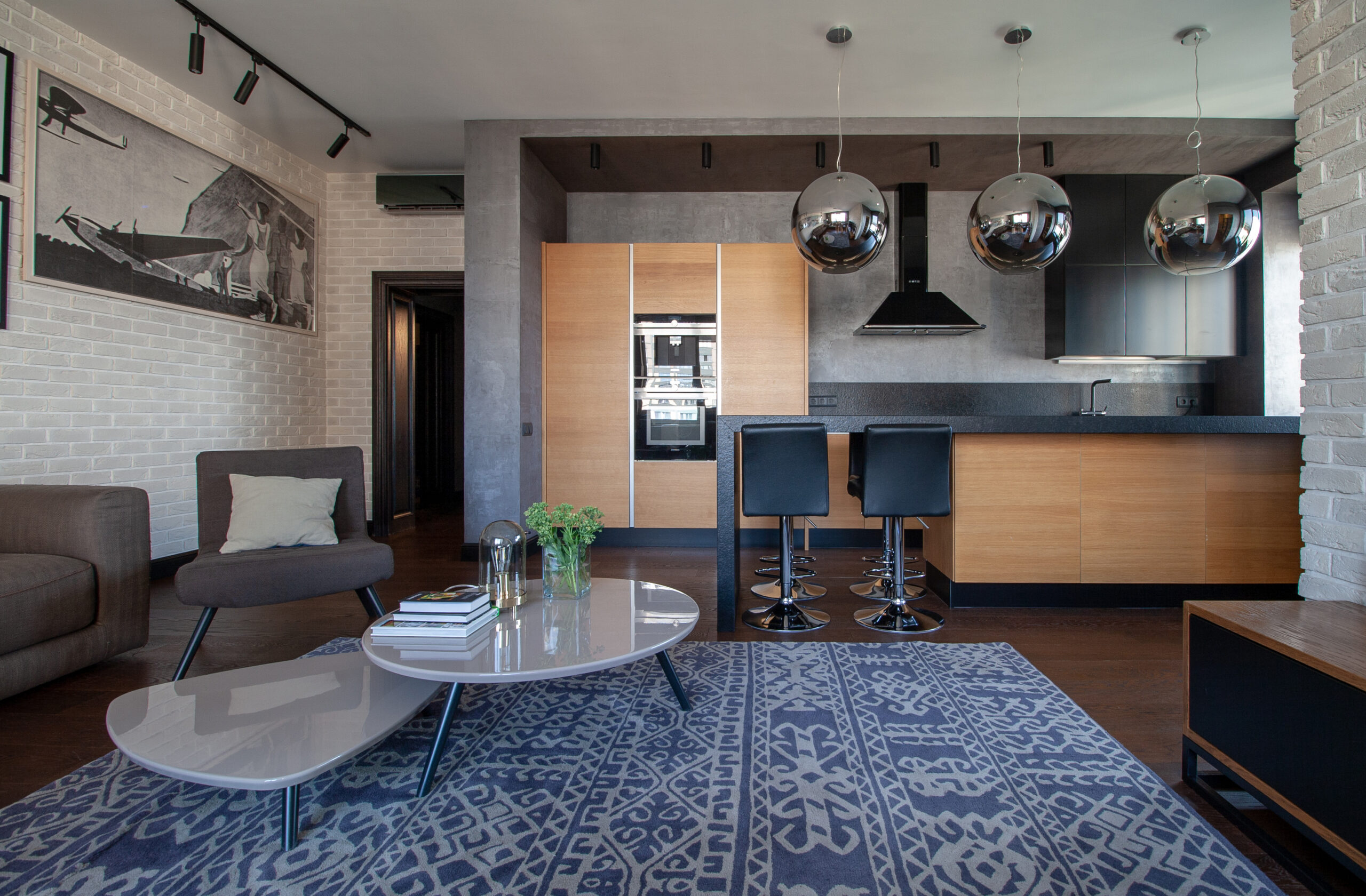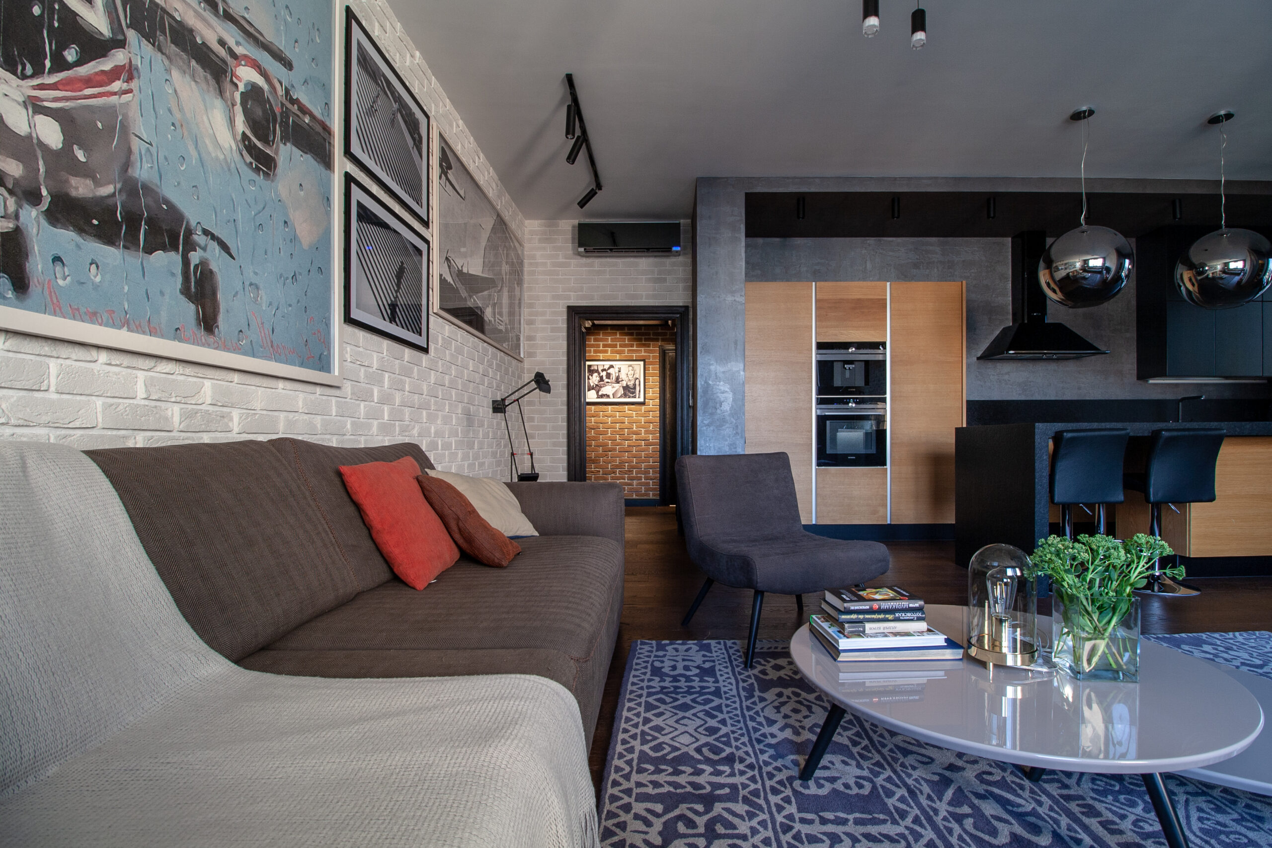Квартира спроектирована для молодого человека. Композиционным центром жилого пространства стала открытая зона гостиной и кухни.