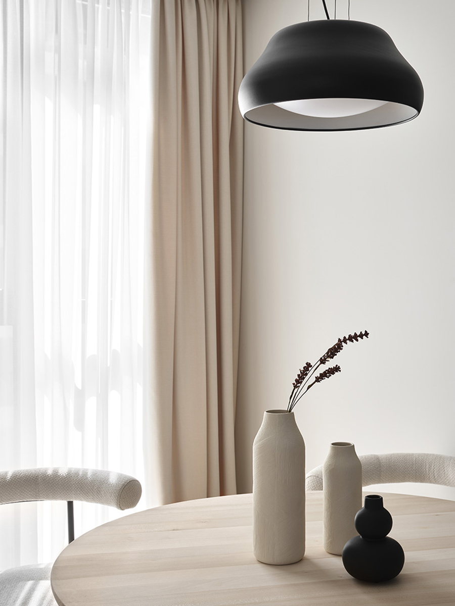 Интерьер построен на принципах минимализма и эргономики, создавая легкое, наполненное воздухом и светом пространство «open space». Ключевую роль в проекте играет палитра натуральных оттенков: песочный, бежевый, молочный. Они помогают создать гармоничную атмосферу, способствующую расслаблению. В отделке использованы экологичные природные материалы: дерево, камень и фактурный текстиль.