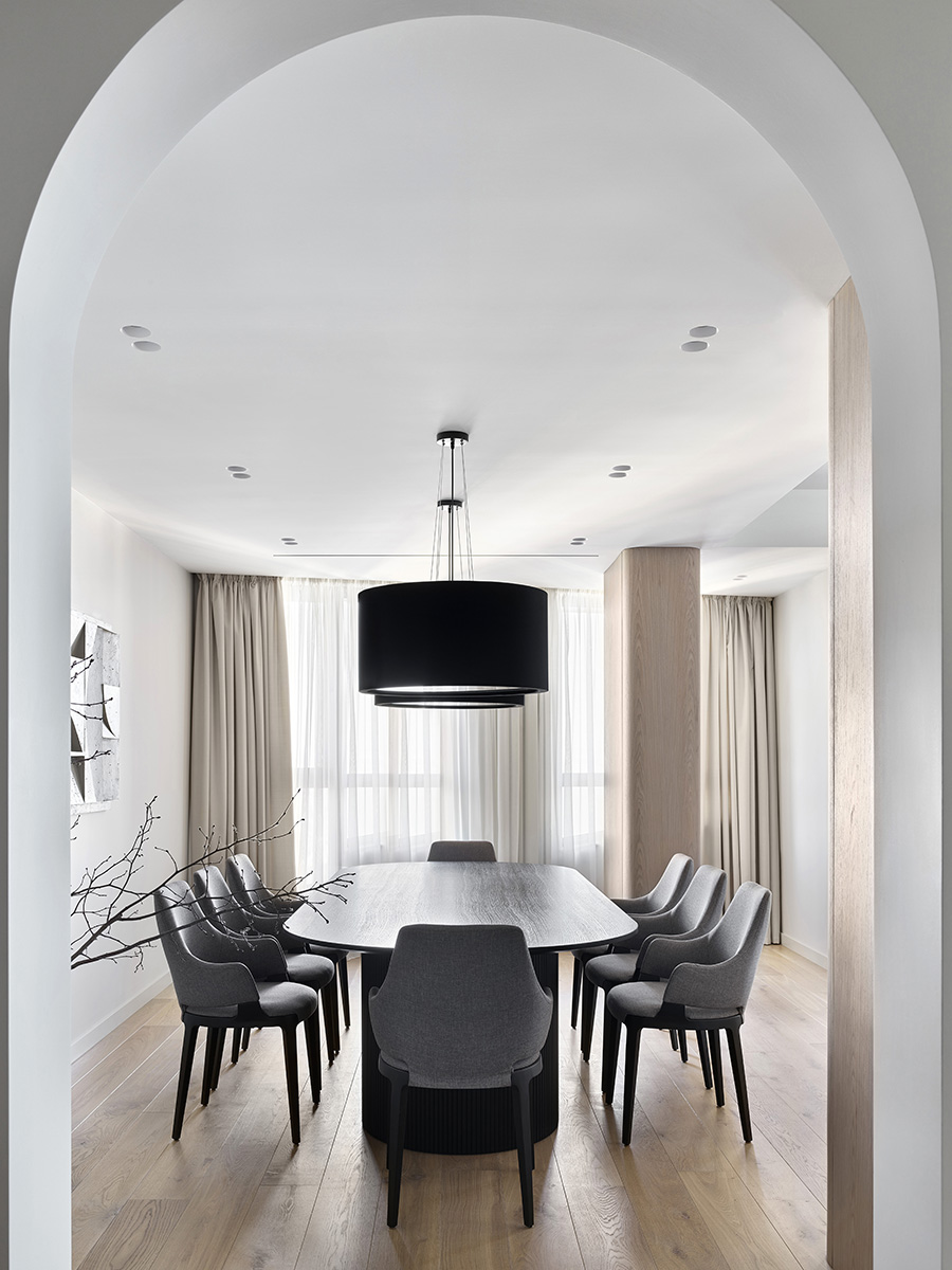 Особое внимание заслуживает журнальный стол из натурального травертина весом более 300 килограмм; 2 несущие колонны, которые из громоздких глыб превратились в отличительный элемент гостиной за счет мягких скруглений и обшивки натуральным шпоном; а также напольное покрытие – паркет в цвете Батист – его мягкий, благородный оттенок подчеркивает природную эстетику интерьера, создавая атмосферу дома, в котором хочется задержаться надолго.