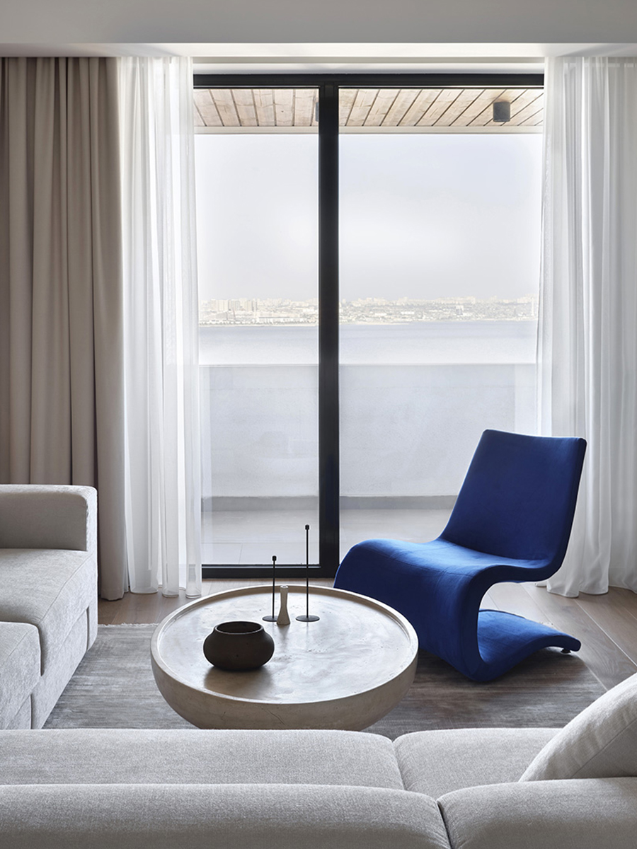 Мягкие природные оттенки, натуральные текстуры и лаконичные формы наполняют пространство теплом и комфортом, а панорамные окна открывают захватывающий вид на Каспийское море.