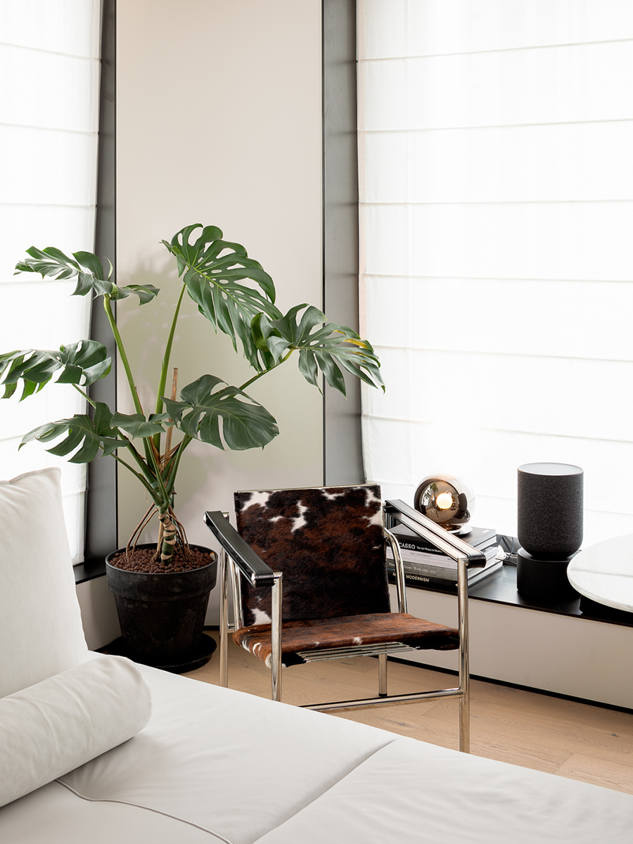 Белый и черный цвета служат основой цветовой палитры, а теплые древесные и неброские природные оттенки придают интерьеру мягкость и естественность, словно приглашают расслабиться.