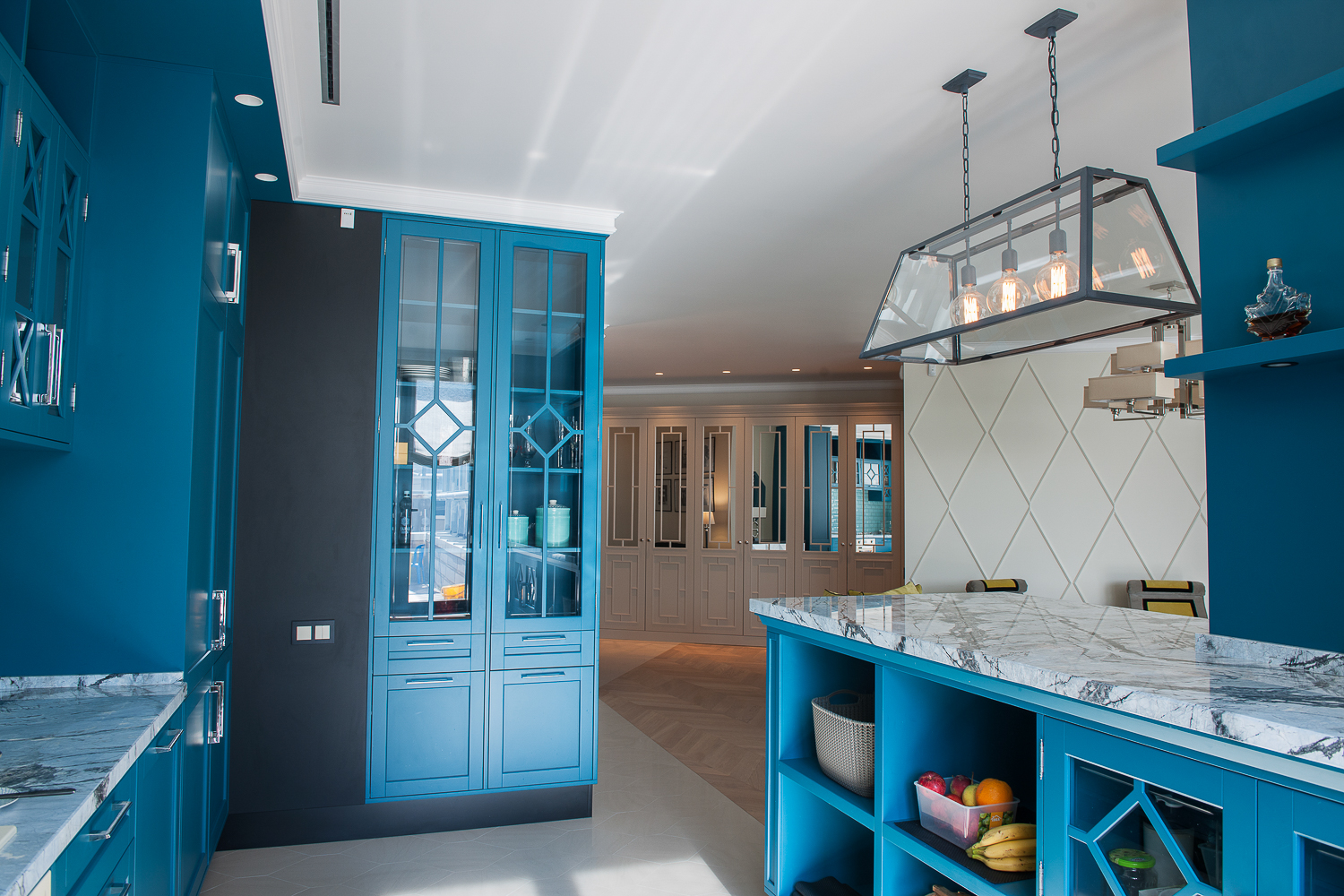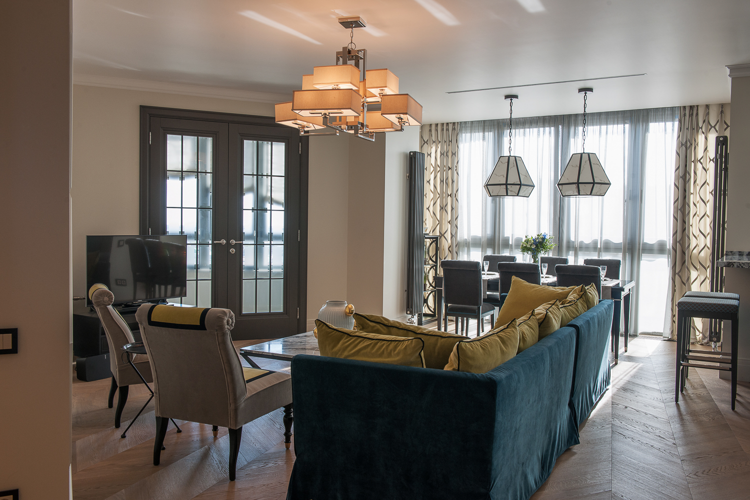 Квартира решена в светлых и ярких тонах Лазурного Берега. Выбранный хозяевами первоначально стиль прованс, а затем уже ар-деко как нельзя лучше подходил для тех задач, которые предстояло решить, так как конструктивное решение и конфигурация пространства были довольно сложные. Но были и преимущества – много естественного света, заливающего гостиную и спальню через большие окна.