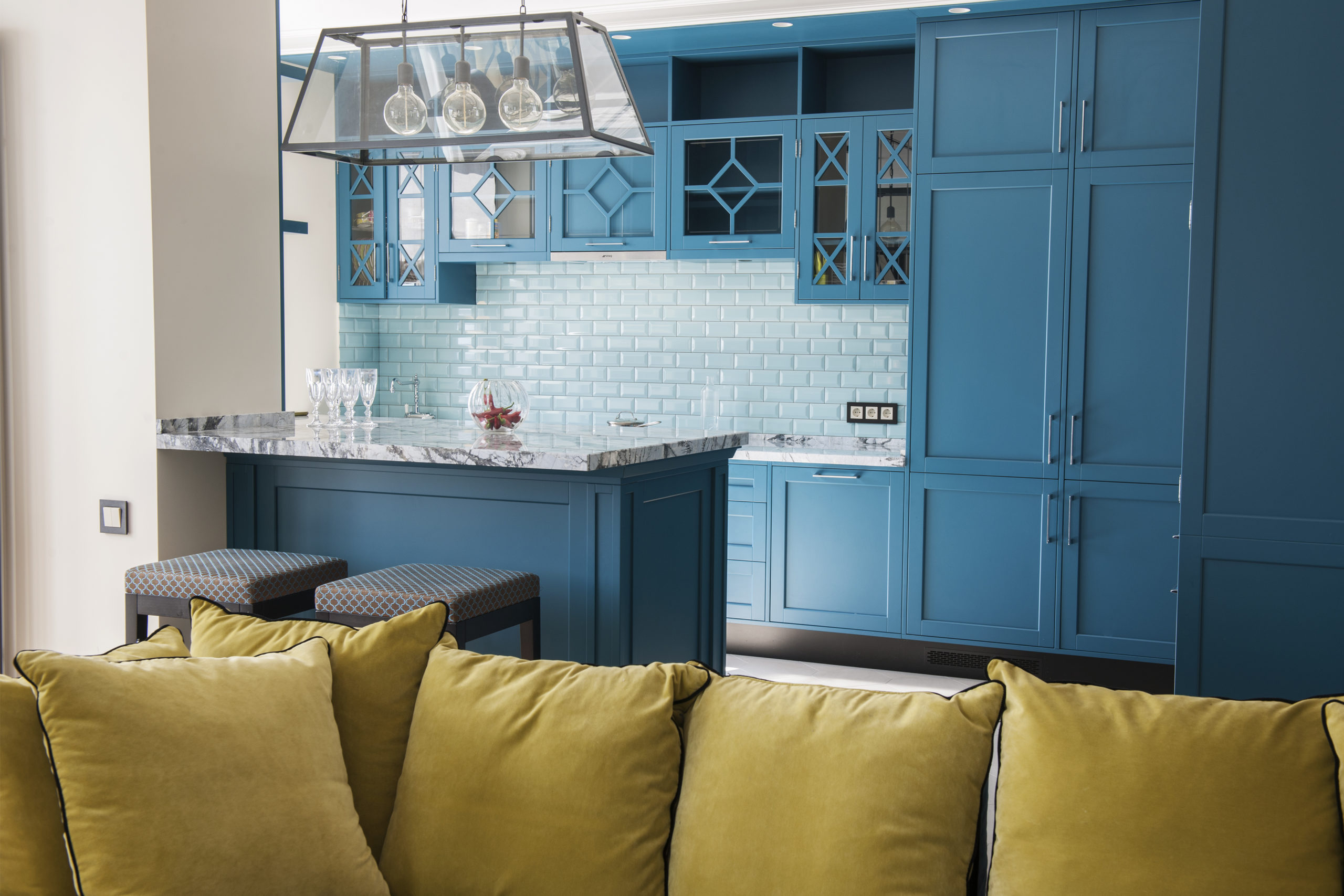 «Как декоратор я против формул всех видов, поэтому в проектах фанатично предлагаю заказчикам смешивать стили и эпохи, – отмечает дизайнер, говоря о своем профессиональном кредо. – Мне нравится безымянные и вневременные предметы наряду с узнаваемыми, мейнстримными миксовать с запроектированной мной мебелью и декором. И всегда, прежде чем замешивать краски на палитре, делаю ставку на черно-белую графику отдельных предметов. Первый цвет ценю за глубину, выразительность и идеальное сочетание со всеми яркими цветами. Мне нравятся неожиданные комбинации, например бирюза и выцветший табак – как в спальне, голубой, экрю и фиалковый – как в детской. Или черный и желтый, создающие в гостиной на фоне умиротворенной гаммы на стенах и в сочетании с глубоким лазурным эффект геометрии, наряду с солнцем и эмоцией. Всегда по мере сил убеждаю заказчиков быть более смелыми в выборе цвета. Если им трудно решиться на цветную стену, уговариваю сделать хотя бы декор. И люди часто бывают приятно удивлены тем, что на самом деле они любят насыщенные тона».