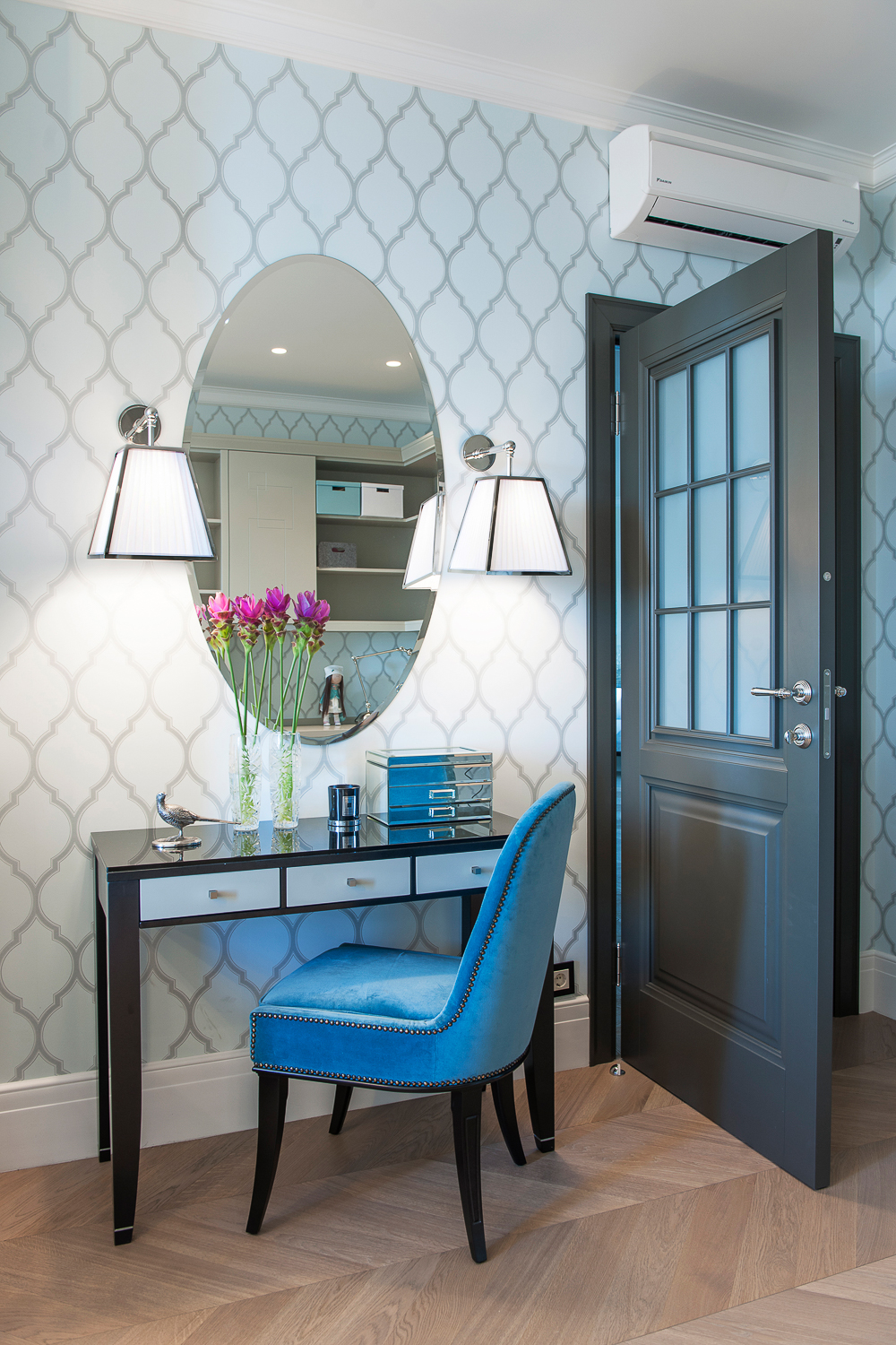 Декор и аксессуары подбирались в противовес – и вопреки – уже готовому интерьеру и повторяли лишь цветовую палитру.