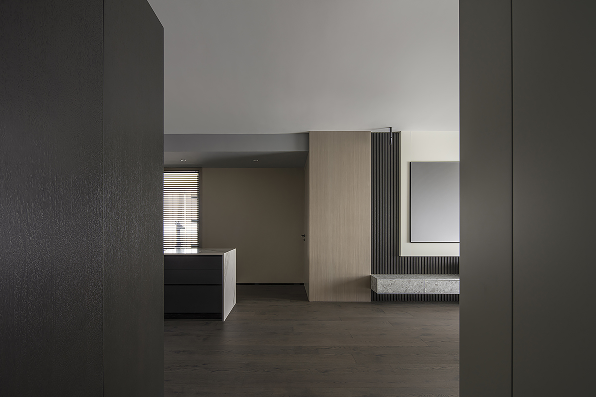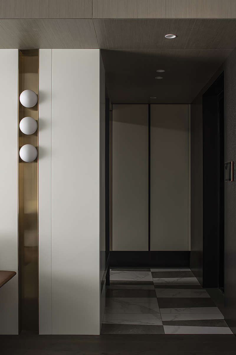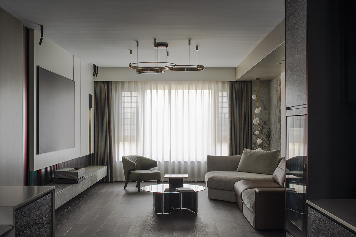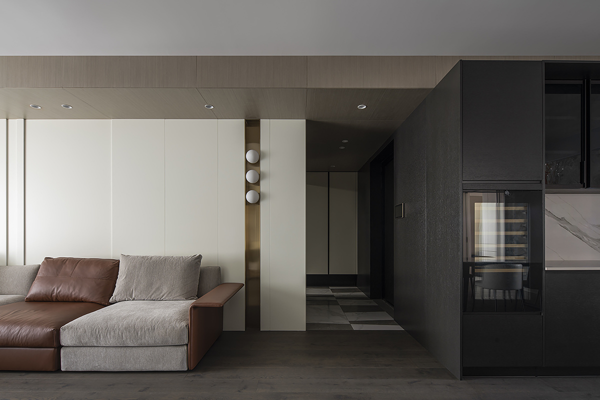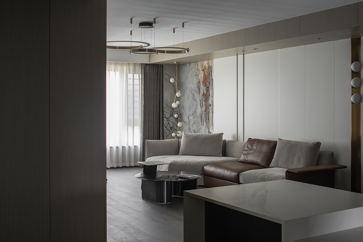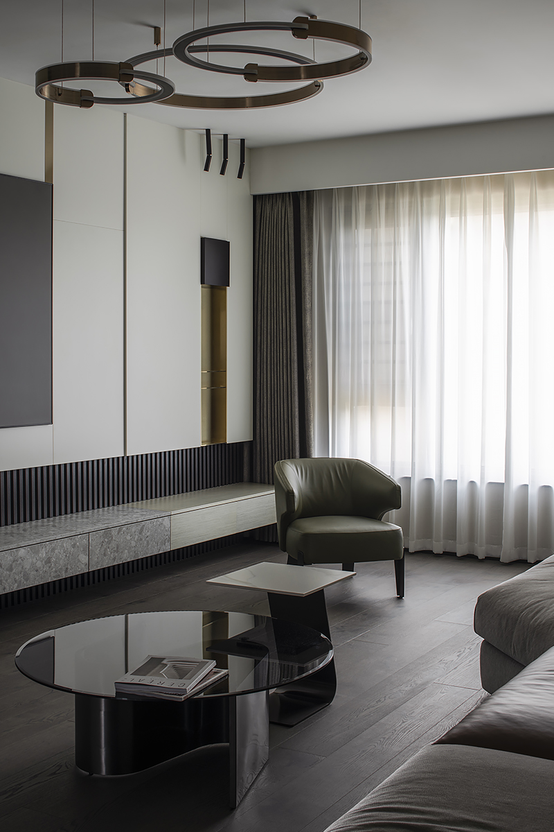 Квартира для пары с ребенком в современном жилом комплексе Moma в китайском городском округе Хэфэй. Дизайнерское решение построено на утонченной простоте: ясные линии, спокойная цветовая гамма с выверенными акцентами, придающими живость и лоск интерьеру, и разнообразие текстур – мягкая кожа, теплое дерево, «холодный» сланец и немного металла. В этом пространстве все подчинено идее комфорта и элегантной гармонии. Строгость бело-серо-черной палитры смягчают лаконичные золотые акценты. Сочетание металлических деталей с элементами из натурального дерева сглаживает жесткость интерьера, добавляя теплоты и уюта. Глубокий оттенок паркетного пола Coswick в тандеме с темными стеновыми панелями создает ощущение защищенности и надежности.