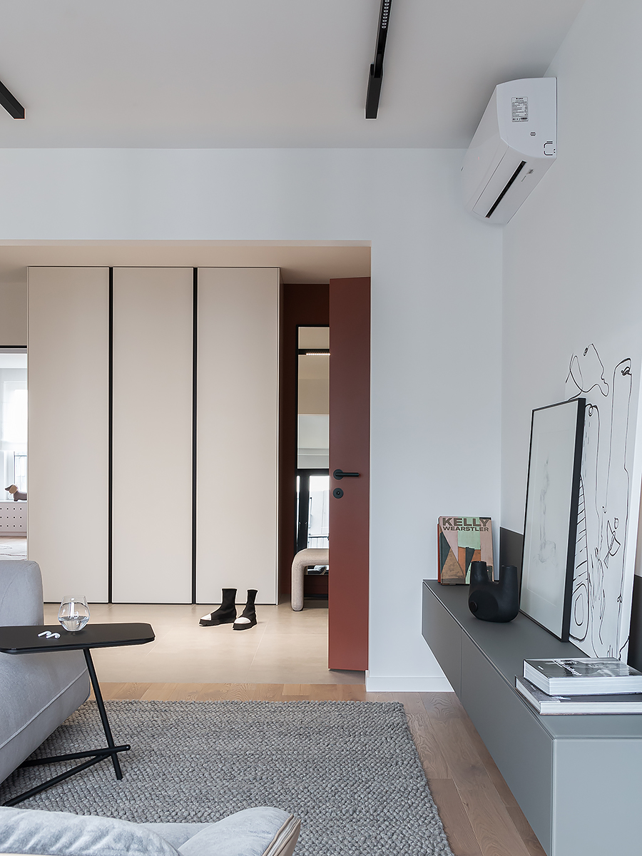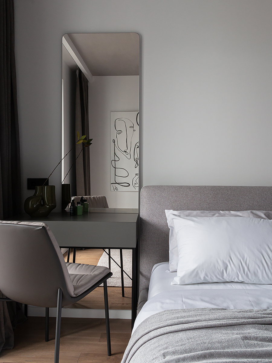 Разбросанные по всему пространству островки «жаркого» терракотового цвета наполнили его жизненной энергией. А многообразие дополняющих друг друга серых оттенков с разной текстурой добавило глубины и динамики. Черные фасады кухни и предметы мебели сделали помещение более выразительным, а теплый оттенок паркетного пола смягчил прохладу лаконичных серых поверхностей и собрал воедино весь интерьер.