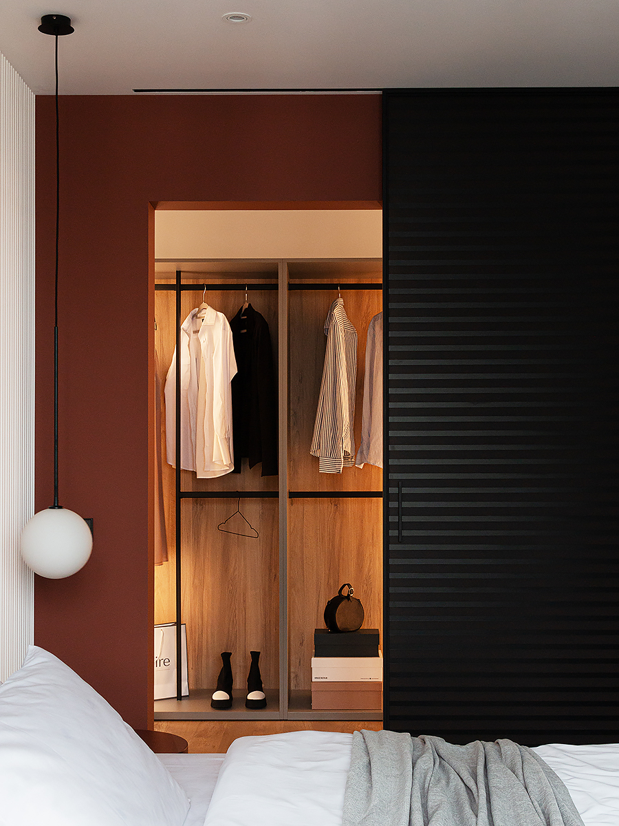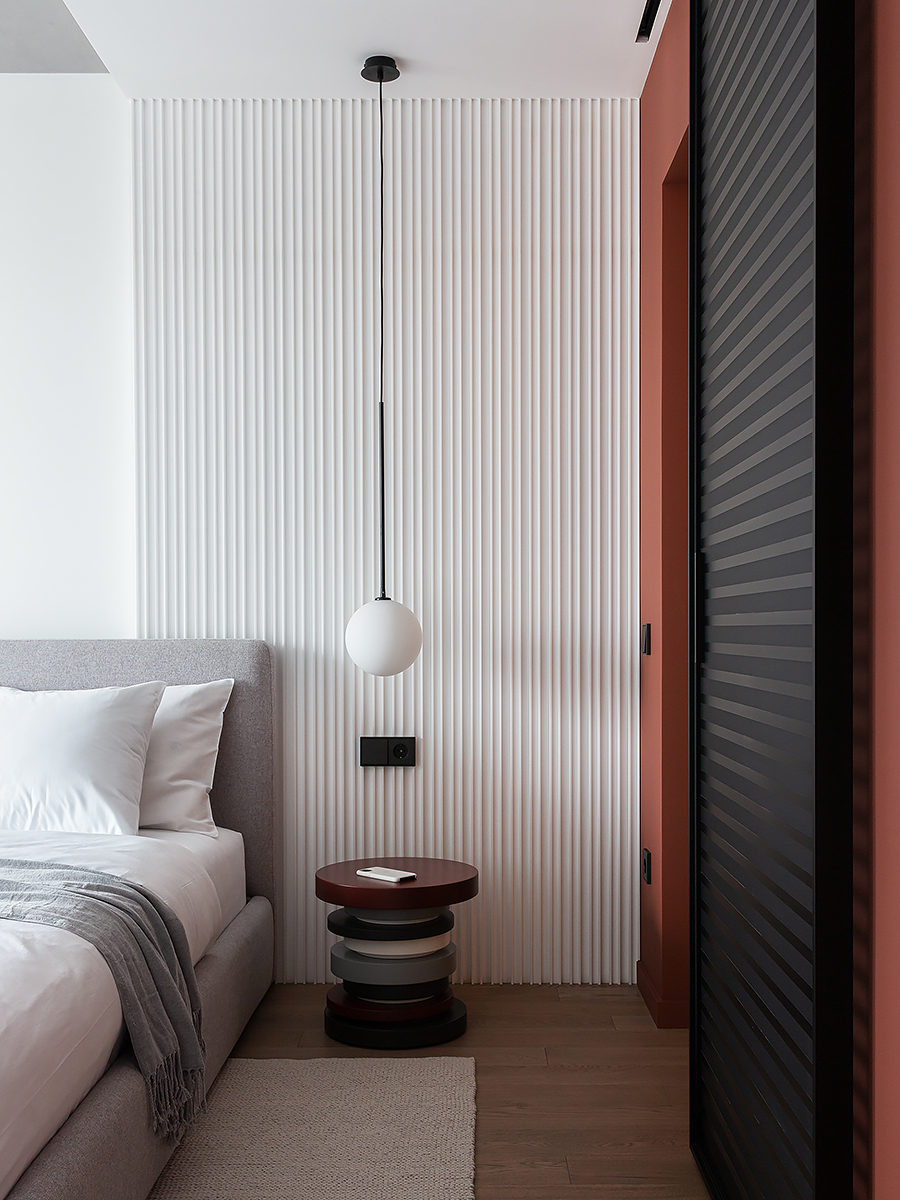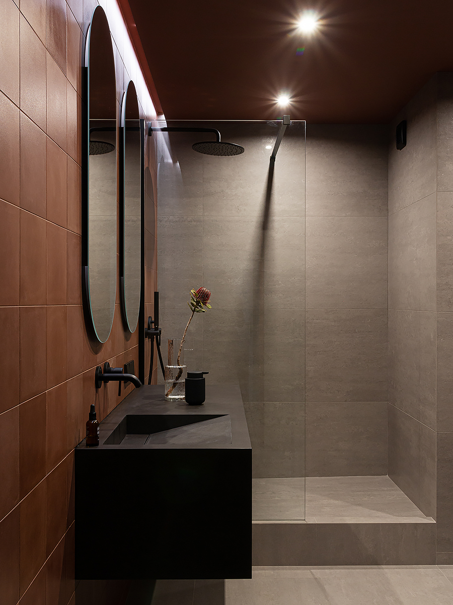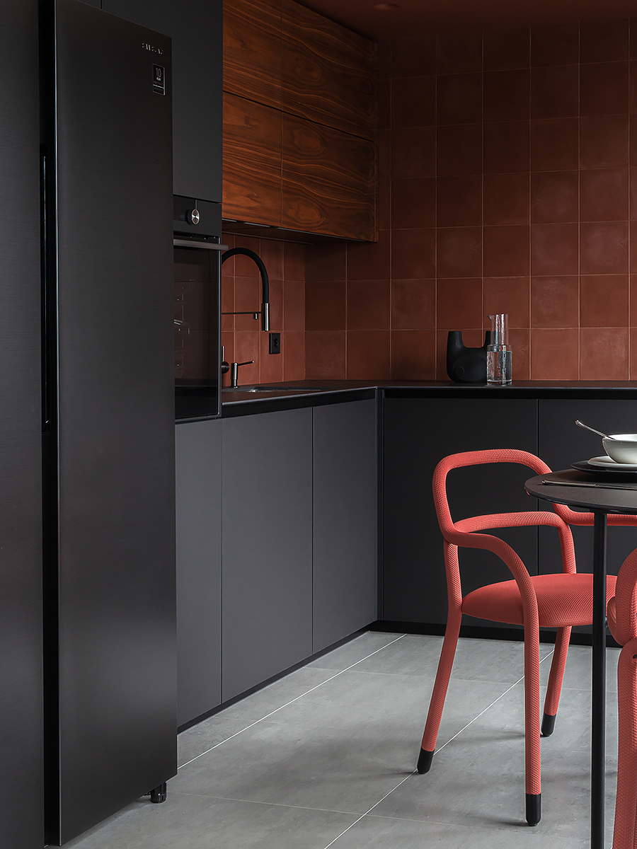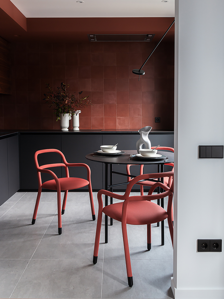 Проект начался с терракотовой плитки. Заказчики влюбились в этот оттенок, и он стал одним из главных цветовых акцентов в монохромном интерьере.