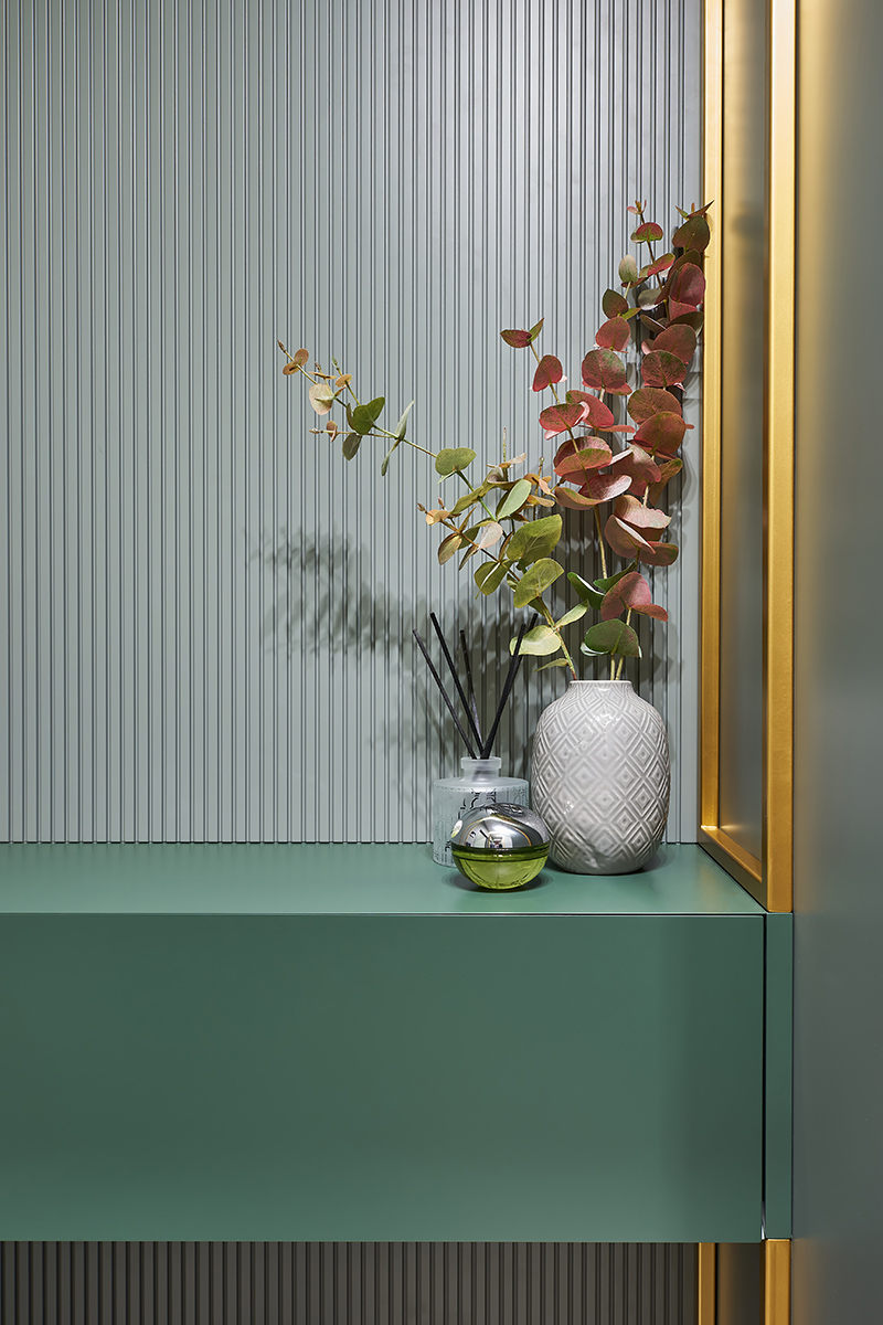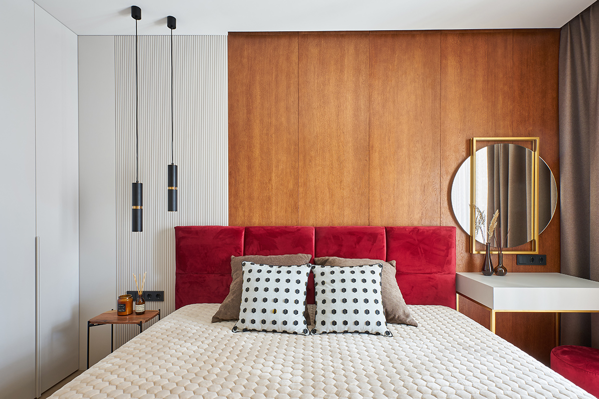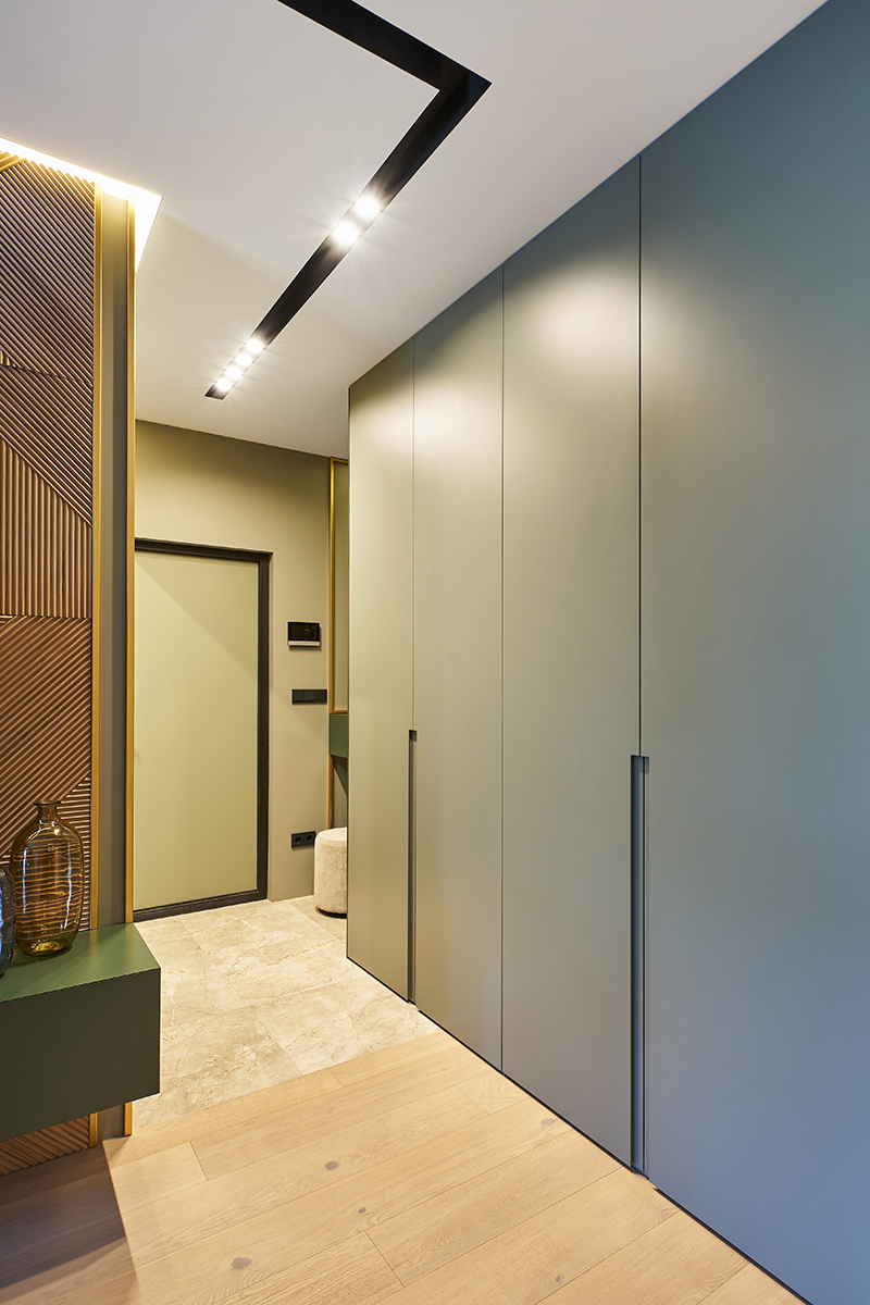 Лишь в спальне от зеленого отказались в пользу более чувственного винного оттенка. Уют и мягкость здесь создают стеновые панели в шпоне дуба, фрезерованные панели в цвет корпусной мебели, а также стена теплого песочного оттенка.