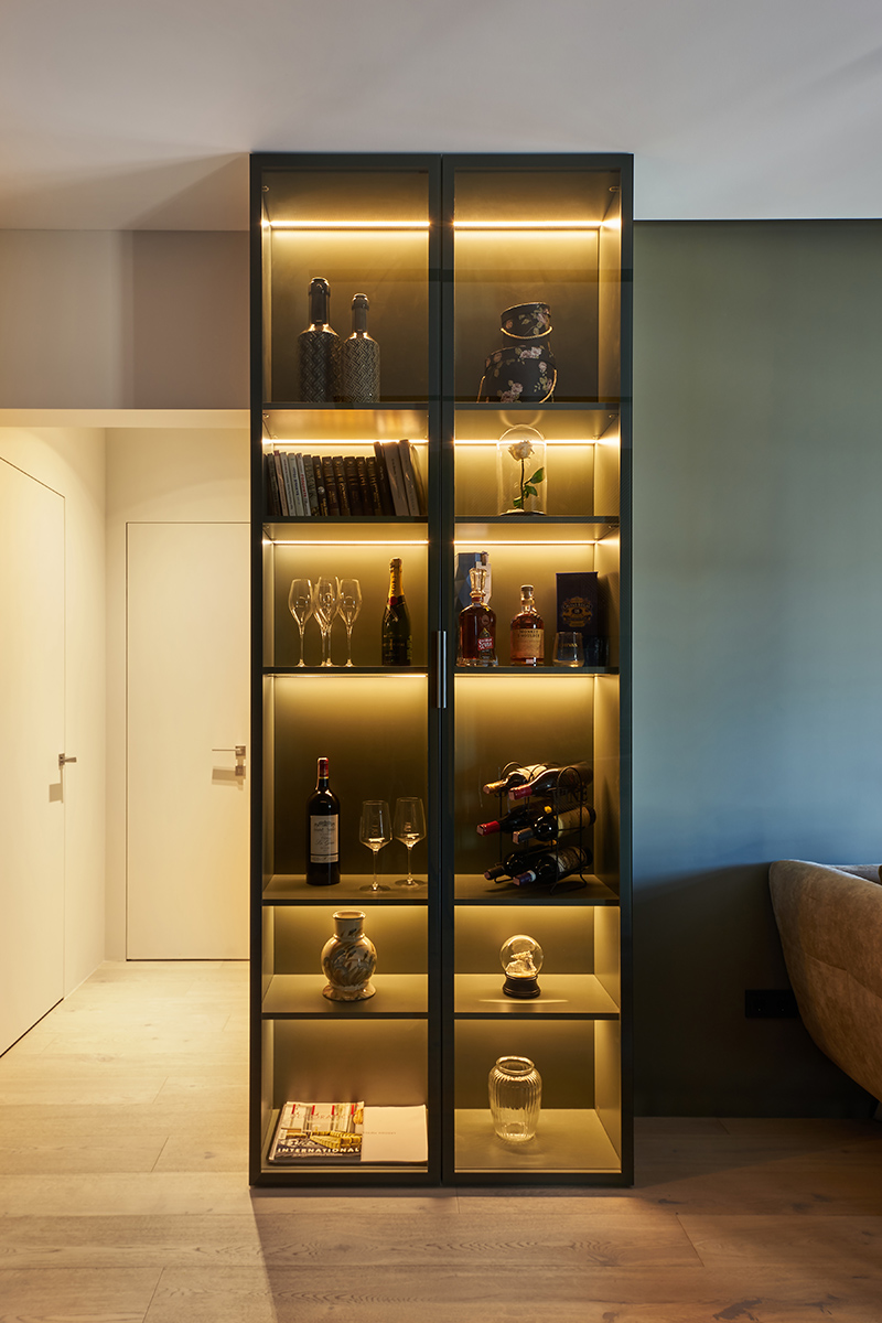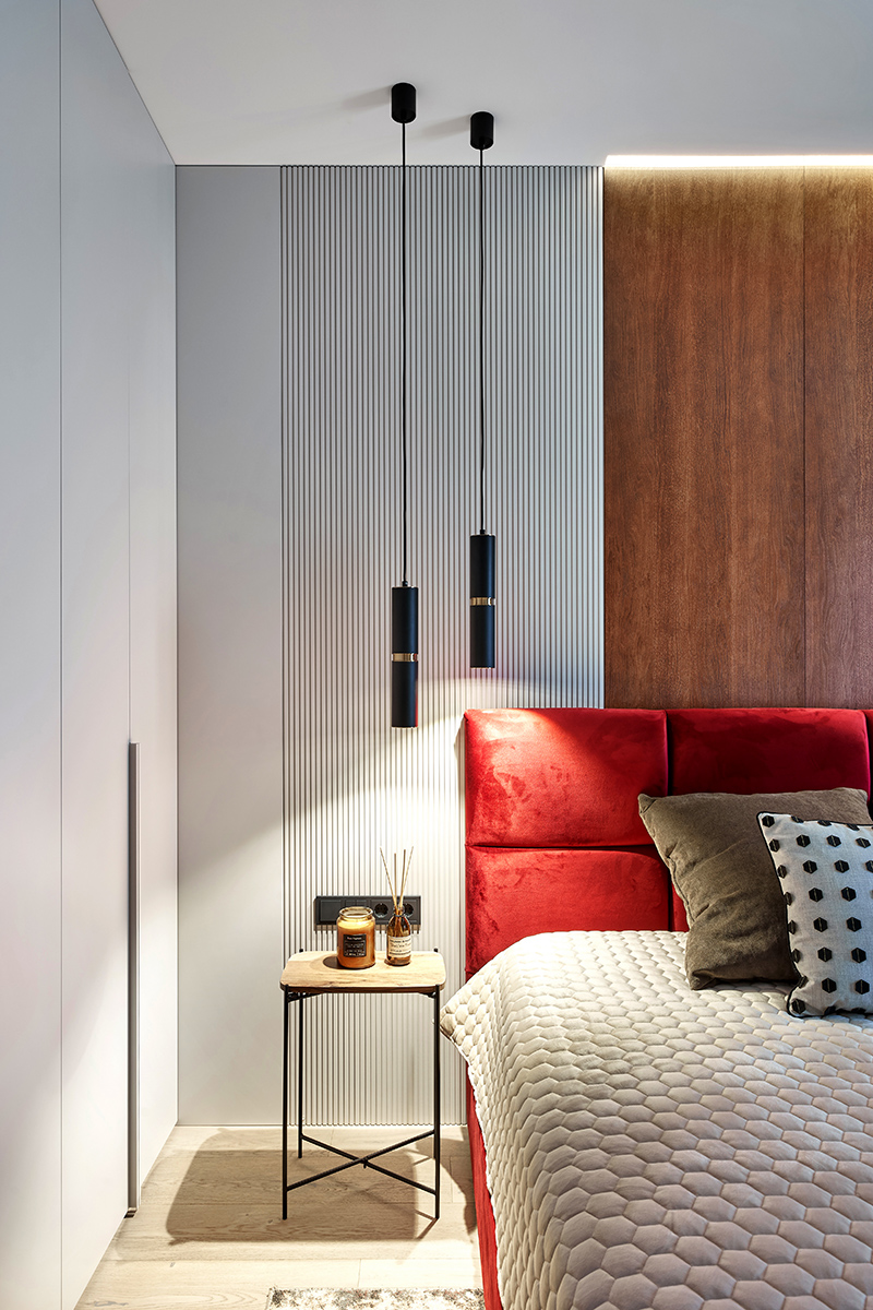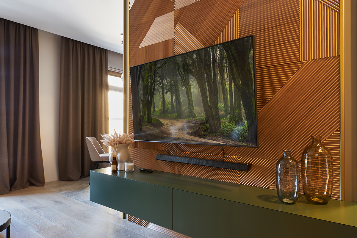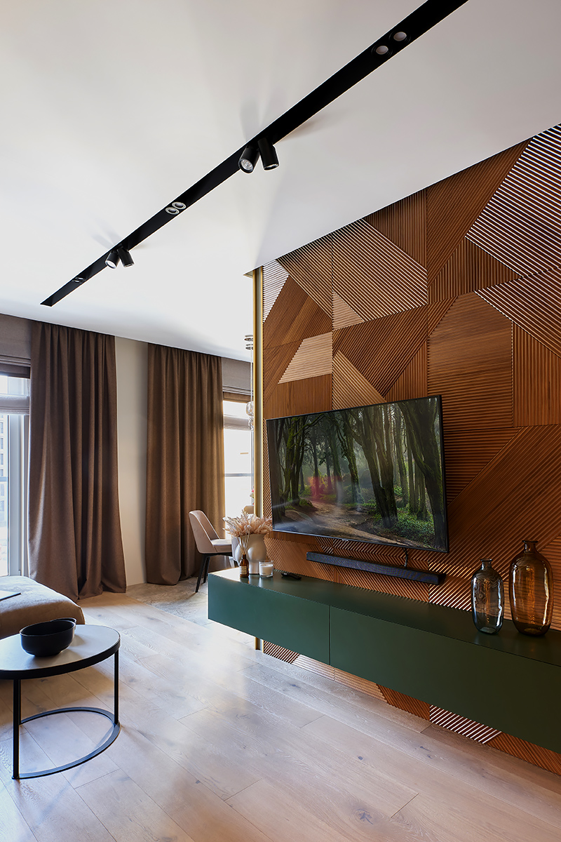 Лишь в спальне от зеленого отказались в пользу более чувственного винного оттенка. Уют и мягкость здесь создают стеновые панели в шпоне дуба, фрезерованные панели в цвет корпусной мебели, а также стена теплого песочного оттенка.