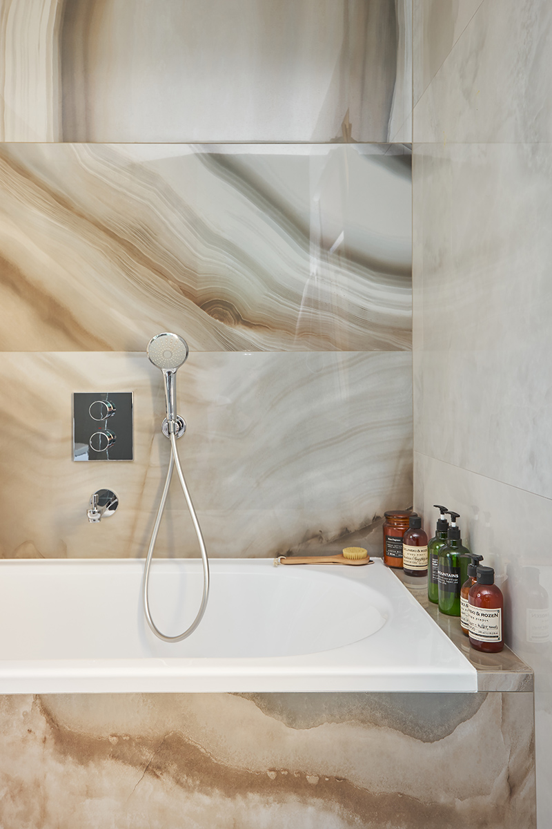 В центре квартиры, в телевизионной зоне, расположили самый интересный и сложный в исполнении элемент декора – фрезерованную панель из массива дуба, каждая деталь которой обрабатывалась вручную. Вся корпусная мебель, кухня, мебель для ванной и стеновые панели выполнены по индивидуальному проекту. Санузел и ванная комната облицованы плиткой с потрясающим рисунком под оникс.