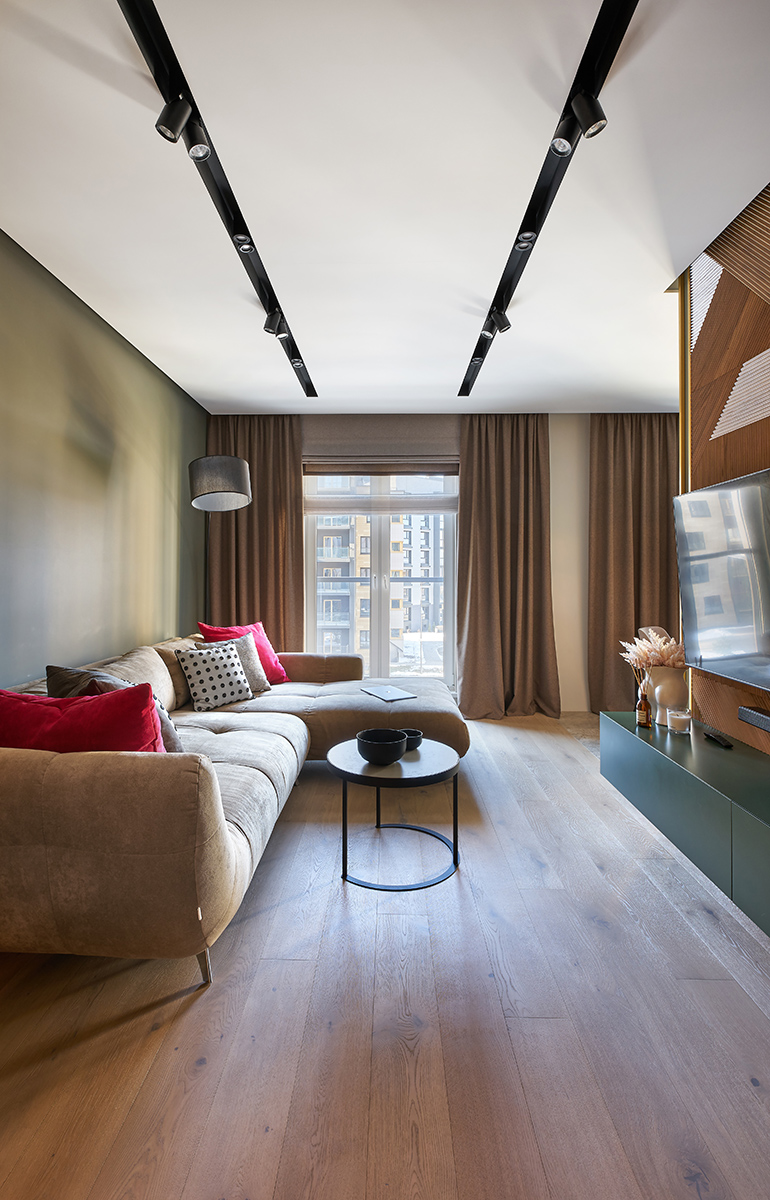 Идею интерьера определило само расположение квартиры площадью 84 кв.м. Она находится в загородном жилом комплексе под Минском на берегу живописного водохранилища, которое местные жители называют Минским морем, и вблизи лесного массива. Использование красок живой природы и натуральных материалов, а также минимум деталей, чтобы не перегружать интерьер и не отвлекать взгляд от важных акцентов, – то, что помогло создать спокойное, уютное и гармонирующее с окружающими пейзажами пространство для загородной жизни.