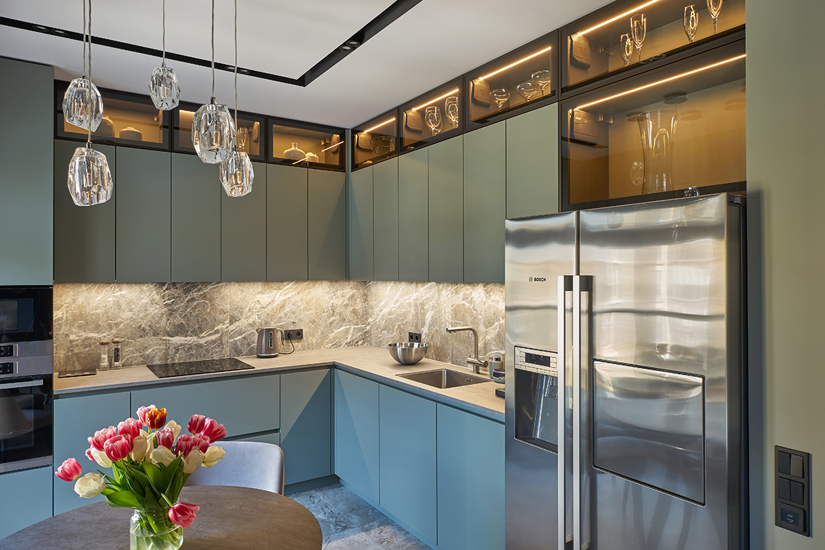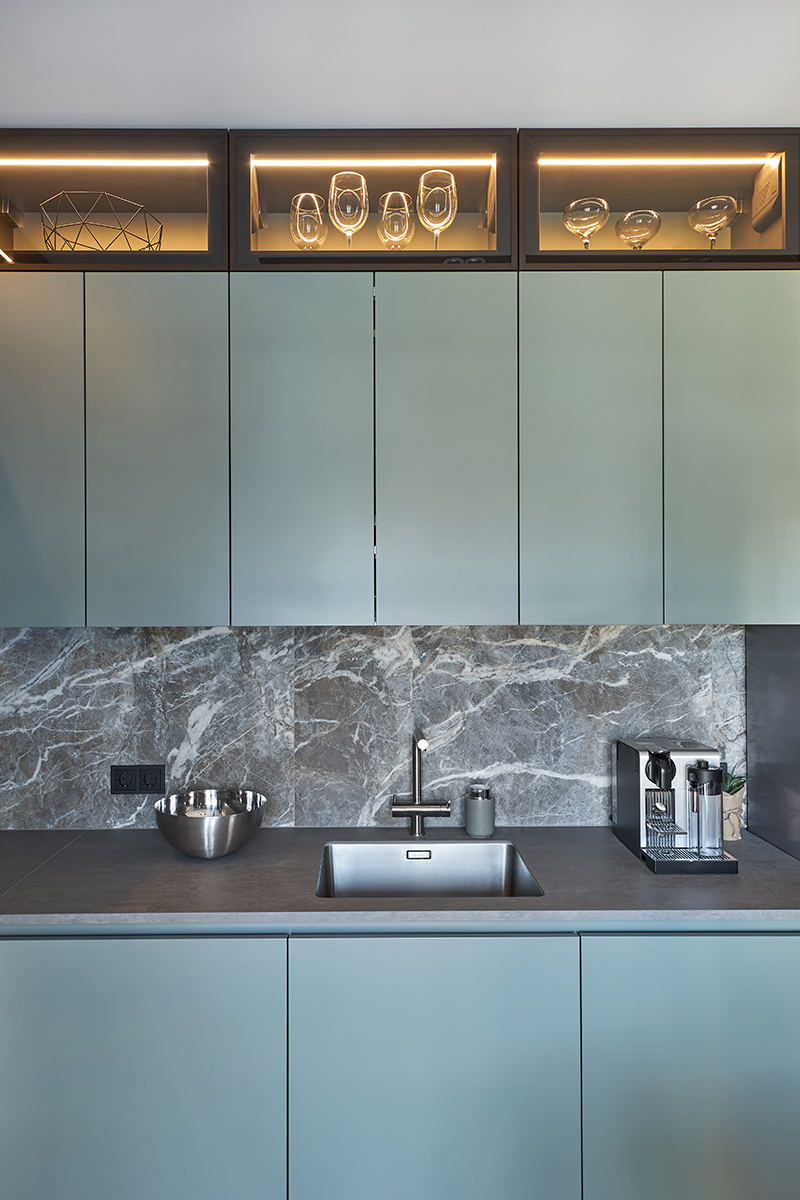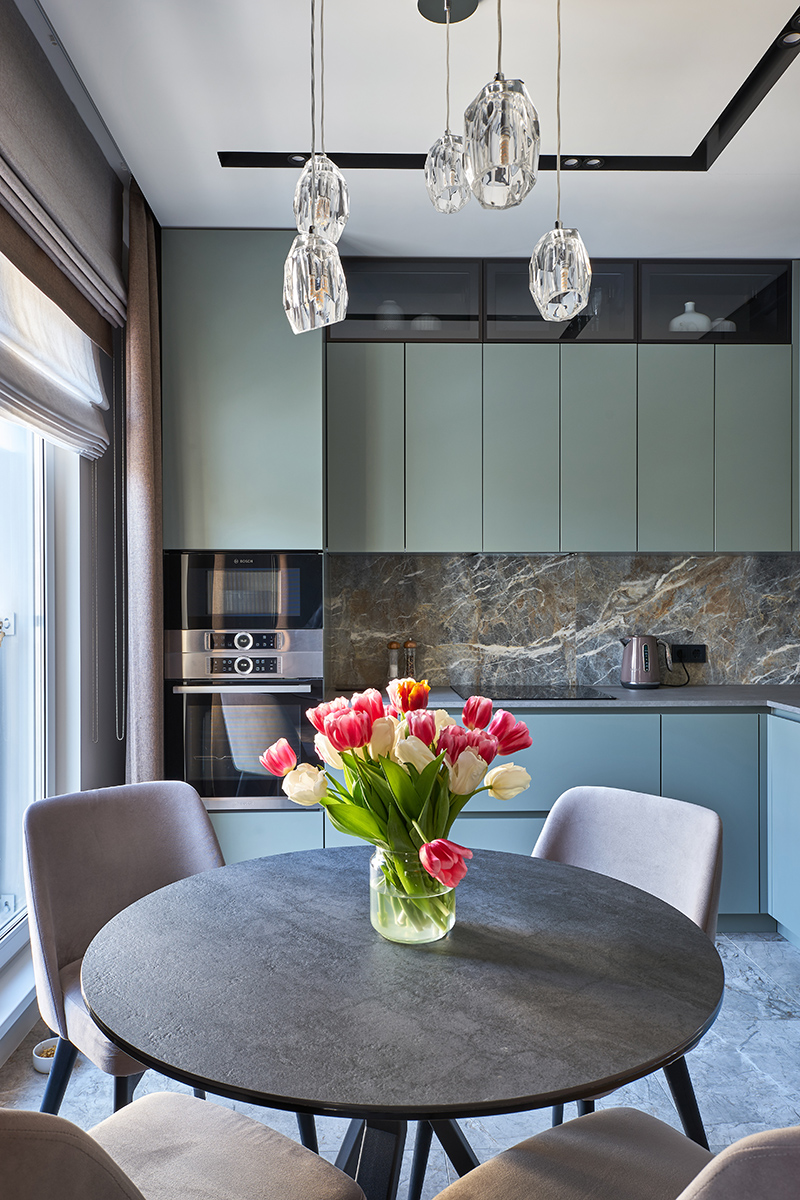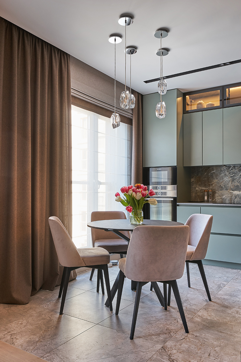 Основное настроение задают различные оттенки зелени и песка и их сочетания, на которых построен весь интерьер. Цвет стен и пола, мебельных фасадов и текстиля идеально дополняют и подчеркивают друг друга, создавая комфортное умиротворяющее пространство. В то же время тонкая работа с цветом и фактурами, умелые акценты делают его интересным и многослойным.